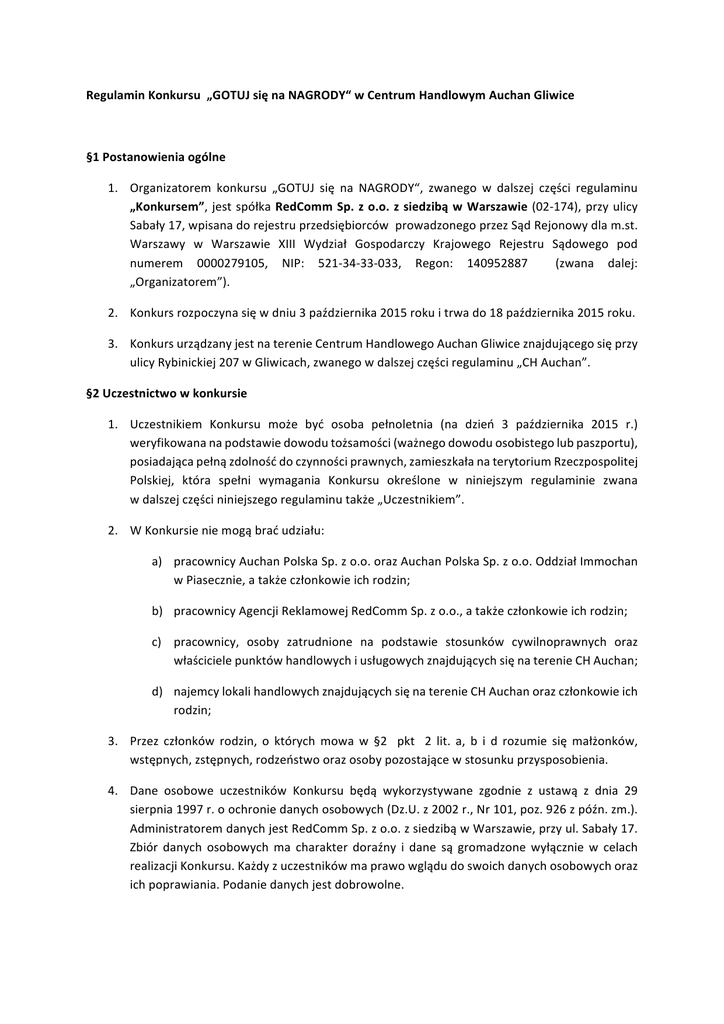 Regulamin Konkursu „GOTUJ się na NAGRODY“ w Centrum Handlowym Auchan Gliwice §1 Postanowienia ogólne 1. Organizatorem konkursu „GOTUJ się na NAGRODY“, zwanego w dalszej części regulaminu „Konkursem”, jest spółka RedComm Sp. z o.o. z siedzibą w Warszawie (02-‐174), przy ulicy Sabały 17, wpisana do rejestru przedsiębiorców prowadzonego przez Sąd Rejonowy dla m.st. Warszawy w Warszawie XIII Wydział Gospodarczy Krajowego Rejestru Sądowego pod numerem 0000279105, NIP: 521-‐34-‐33-‐033, Regon: 140952887 (zwana dalej: „Organizatorem”). 2. Konkurs rozpoczyna się w dniu 3 października 2015 roku i trwa do 18 października 2015 roku. 3. Konkurs urządzany jest na terenie Centrum Handlowego Auchan Gliwice znajdującego się przy ulicy Rybinickiej 207 w Gliwicach, zwanego w dalszej części regulaminu „CH Auchan”. §2 Uczestnictwo w konkursie 1. Uczestnikiem Konkursu może być osoba pełnoletnia (na dzień 3 października 2015 r.) weryfikowana na podstawie dowodu tożsamości (ważnego dowodu osobistego lub paszportu), posiadająca pełną zdolność do czynności prawnych, zamieszkała na terytorium Rzeczpospolitej Polskiej, która spełni wymagania Konkursu określone w niniejszym regulaminie zwana w dalszej części niniejszego regulaminu także „Uczestnikiem”. 2. W Konkursie nie mogą brać udziału: a) pracownicy Auchan Polska Sp. z o.o. oraz Auchan Polska Sp. z o.o. Oddział Immochan w Piasecznie, a także członkowie ich rodzin; b) pracownicy Agencji Reklamowej RedComm Sp. z o.o., a także członkowie ich rodzin; c) pracownicy, osoby zatrudnione na podstawie stosunków cywilnoprawnych oraz właściciele punktów handlowych i usługowych znajdujących się na terenie CH Auchan; d) najemcy lokali handlowych znajdujących się na terenie CH Auchan oraz członkowie ich rodzin; 3. Przez członków rodzin, o których mowa w §2 pkt 2 lit. a, b i d rozumie się małżonków, wstępnych, zstępnych, rodzeństwo oraz osoby pozostające w stosunku przysposobienia. 4. Dane osobowe uczestników Konkursu będą wykorzystywane zgodnie z ustawą z dnia 29 sierpnia 1997 r. o ochronie danych osobowych (Dz.U. z 2002 r., Nr 101, poz. 926 z późn. zm.). Administratorem danych jest RedComm Sp. z o.o. z siedzibą w Warszawie, przy ul. Sabały 17. Zbiór danych osobowych ma charakter doraźny i dane są gromadzone wyłącznie w celach realizacji Konkursu. Każdy z uczestników ma prawo wglądu do swoich danych osobowych oraz ich poprawiania. Podanie danych jest dobrowolne. 5. Przystąpienie do Konkursu oznacza, że uczestnik zapoznał się z jego zasadami określonymi w niniejszym Regulaminie i akceptuje je. §3 Zasady Konkursu 1. Aby wziąć udział w Konkursie Uczestnik musi spełnić łącznie poniższe warunki: a) w dniach od 3 do 18 października 2015 roku zrobić zakupy na terenie galerii handlowej CH Auchan Gliwice na łączną kwotę minimum 200 zł brutto LUB zakupy w hipermarkecie Auchan Gliwice za kwotę minimum 100 zł. brutto oraz na terenie galerii handlowej CH Auchan Gliwice za kwotę minimum 100 złotych brutto. Dowody zakupów mogą być sumowane. Z Konkursu wyłączone są dowody zakupu alkoholu, wyrobów tytoniowych, lekarstw i farmaceutyków, transakcji kantorowych a także zakładów lotto, wszelkich gier liczbowych i losowych, zakładów bukmacherskich, itp.. b) jak najszybciej zgłosić się do Punktu Obsługi Konkursu „GOTUJ się na NAGRODY“ w CH Auchan Gliwice. Punkt Obsługi Konkursu czynny jest w dniach od 3 do 18 października 2015 roku w godzinach od 14:00 do 19:00 (od poniedziałku do piątku) oraz od 11:00 do 19:00 (w soboty i niedziele). c) przedstawić oryginały dowodów zakupu do ich weryfikacji. 2. Uczestnik, który w Punkcie Obsługi Konkursu przedstawi dowody zakupów (zgodnie z §3 p.1) na kwotę łączną minimum 200 złotych brutto otrzyma do wyboru jedną z nagród: 2. 1. Nagrodę nr 1 – książkę kucharską pod tytułem „Cztery Pory Roku” autorstwa Roberta Sowy; 2. 2. Nagrodę nr 2 – książkę kucharską pod tytułem „Życie kocha jeść” autorstwa Roberta Sowy. 3. Liczba nagród do wygrania w poszczególnych dniach trwania Konkursu jest ograniczona i wynosi: -‐ w dniach 5, 6, 7, 8, 9, 12, 13, 14, 15 i 16 października 2015 roku – łącznie 19 sztuk dziennie, to jest po 10 sztuk Nagród nr 1 oraz 9 sztuk Nagród nr 2 każdego dnia, -‐ w dniach: 3, 4, 10, 11, 17 i 18 października 2015 r. łącznie po 35 sztuk dziennie, to jest po 17 sztuk Nagród nr 1 oraz 18 sztuk Nagród nr 2 każdego dnia. 4. O przyznaniu wygranej decyduje kolejność zgłoszeń do Punktu Obsługi Konkursu oraz spełnienie warunków zgodnie z §3 punkt 1. 5. Nagrody będą wydawane w dniach i godzinach pracy Punktu Obsługi Konkursu czyli w dniach od 3 do 18 października 2015 roku w godzinach od 14:00 do 19:00 (od poniedziałku do piątku) oraz od 11:00 do 19:00 (w soboty i niedziele) lub do wyczerpania się zapasu nagród. Nagrody nie wydane danego dnia przechodzą do puli nagród dostępnych w następnych dniach. 6. Uczestnik ma prawo wyłącznie do dwukrotnego zgłoszenia się do udziału w Konkursie i odebrania maksymalnie dwóch różnych nagród nawet jeśli posiada paragony na łączną kwotę będącą wielokrotnością kwoty minimalnej wymaganej do wzięcia udziału w Konkursie. 7. Jeden dowód zakupu dokonanego w czasie trwania Konkursu w CH Auchan może być wykorzystany w Konkursie tylko jeden raz i wyłącznie na terenie CH Auchan. Dowody zakupu przedstawione w Punkcie Obsługi Konkursu zostaną oznaczone, celem uniemożliwienia ich ponownego użycia w Konkursie. 8. W przypadku wątpliwości dotyczących ustalenia kolejności zgłaszających się osób, rozstrzyga opinia Obsługi Punktu Obsługi Konkursu. 9. Obsługa Konkursu będzie stemplowała dowody zakupu celem oznaczenia faktu wydania nagrody. 10. Wszystkie nagrody, które nie zostaną rozdane w czasie trwania Konkursu zostaną przekazane do dyspozycji Managera