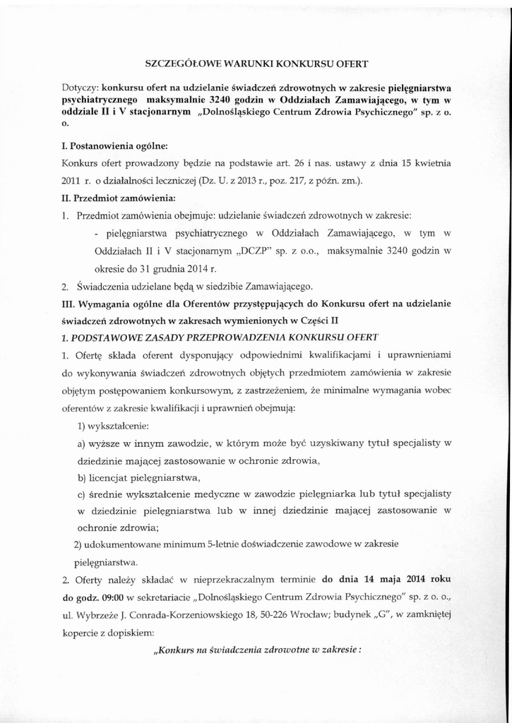 SZCZEGÓŁOWE WARUNKI K O N K U R S U OFERT Dotyczy: k o n k u r s u ofert na udzielanie świadczeń zdrowotnych w zakresie pielęgniarstwa psychiatrycznego m a k s y m a l n i e 3240 godzin w Oddziałach Zamawiającego, w t y m w oddziale II i V stacjonarnym „Dolnośląskiego Centrum Z d r o w i a Psychicznego" sp. z o. 0. 1. Postanowienia ogólne: Konkurs ofert prowadzony będzie na podstawie art. 26 i nas. ustawy z dnia 15 kwietnia 2011 r. o działalności leczniczej (Dz. U . z 2013 r., poz. 217, z późn. zm.). II. Przedmiot zamówienia: 1. Przedmiot zamówienia obejmuje: udzielanie świadczeń zdrowotnych w zakresie: - pielęgniarstwa psychiatrycznego w Oddziałach Oddziałach II i V stacjonarnym „DCZP" sp. z o.o., Zamawiającego, w tym w maksymalnie 3240 godzin w okresie do 31 grudnia 2014 r. 2. Świadczenia udzielane będą w siedzibie Zamawiającego. III. Wymagania ogólne dla Oferentów przystępujących do K o n k u r s u ofert na udzielanie świadczeń zdrowotnych w zakresach w y m i e n i o n y c h w Części II 1. PODSTAWOWE ZASADY PRZEPROWADZENIA KONKURSU OEERT 1. Ofertę składa oferent dysponujący odpowiednimi kwalifikacjami i uprawnieniami do wykonywania świadczeń zdrowotnych objętych przedmiotem zamówienia w zakresie objętym postępowaniem konkursowym, z zastrzeżeniem, że minimalne wymagania wobec oferentów z zakresie kwalifikacji i uprawnień obejmują: 1) wykształcenie: a) wyższe w i n n y m zawodzie, w którym może być u z y s k i w a n y tytuł specjalisty w dziedzinie m a j ą c e j z a s t o s o w a n i e w ochronie z d r o w i a , b) licencjat pielęgniarstwa, c) średnie wykształcenie m e d y c z n e w zawodzie pielęgniarka l u b tytuł specjalisty w dziedzinie pielęgniarstwa l u b w innej dziedzinie m a j ą c e j zastosowanie w ochronie z d r o w i a ; 2) udokumentowane m i n i m u m 5-letnie doświadczenie zawodowe w zakresie pielęgniarstwa. 2. Oferty należy składać w nieprzekraczalnym terminie do dnia 14 maja 2014 roku do godz. 09:00 w sekretariacie „Dolnośląskiego Centrum Z d r o w i a Psychicznego" sp. z o. o., ul. Wybrzeże J. Conrada-Korzeniowskiego 18, 50-226 Wrocław; budynek „G", w zamkniętej kopercie z dopiskiem: „Konkurs na świadczenia zdrowotne w zakresie: Pielęgniarstwa psychiatrycznego maksymalnie 3240 godzin w Oddziałach Zamawiającego, xv tym w Oddziale II i V Stacjonarnym. Nie otwierać do dnia 14 maja 2014 roku do godz. 10.00" 3. Dokonując w y b o r u najkorzystniejszych ofert Udzielający zamówienia stosuje zasady określone w niniejszych „Szczegółowych warunkach konkursu ofert". 4. Udzielający zamówienia zastrzega sobie prawo do odwołania konkursu oraz do przesunięcia terminu składania ofert bez podania i bez skutków prawnych. 2. PRZYGOTOWANIE 1. Oferent składa warunkach OFERTY ofertę konkursu zgodnie z wymaganiami określonymi ofert" na formularzu udostępnianym w „Szczegółowych przez Udzielającego zamówienie, który stanowi załącznik nr 1 do Szczegółowych warunków konkursu ofert. 2. Oferenci ponoszą wszelkie koszty związane z przygotowaniem i złożeniem oferty. 3. Oferta powinna zawierać wszelkie dokumenty i załączniki wymagane w „Szczegółowych warunkach konkursu ofert". 4. Oferta winna być sporządzona w sposób przejrzysty i czytelny. 5. Ofertę oraz wszystkie załączniki należy sporządzić w języku polskim p o d rygorem odrzucenia oferty, z wyłączeniem pojęć medycznych. 6. Ofertę oraz każdą z jej stron numeruje i podpisuje oferent. 7. Strony oferty oraz miejsca, w których naniesione zostały poprawki, podpisuje oferent. Poprawki mogą być dokonane jedynie poprzez przekreślenie błędnego zapisu i umieszczenie obok niego czytelnego zapisu poprawnego. 8. Oferent może wprowadzić zmiany lub wycofać złożoną ofertę, jeżeli w formie pisemnej powiadomi Udzielającego zamówienia o wprowadzeniu zmian lub wycofaniu oferty, nie później jednak niż przed upływem terminu składania ofert. 9. Powiadomienie o wprowadzeniu zmian lub wycofaniu oferty oznacza się jak ofertę z dopiskiem „zmiana oferty" lub „wycofanie oferty". 3. INFORMACJA O DOKUMENTACH ZAŁĄCZANYCH PRZEZ OFERENTA 1. W celu uznania, że oferta spełnia wymagane warunki, oferent zobowiązany jest dołączyć do oferty następujące dokumenty: I Podmioty wykonujące działalność leczniczą: 1) kserokopie dyplomów oraz dokumentów wskazanych, wymienionych w ofercie pielęgniarek zatrudnionych przez oferenta, mających realizować przedmiot zamówienia, potwierdzające spełnienie wymagań określonych dla niniejszego postępowania; 2) kserokopia polisy O C , zgodnej z wymaganiami określonymi przepisami rozporządzenia Ministra Finansów z dnia 22 grudnia 2011 r. w sprawie obowiązkowego ubezpieczenia odpowiedzialności cywilnej podmiotu wykonującego działalność leczniczą (Dz. U . N r 293, poz. 1729); 3) kserokopia decyzji nadania numeru N I P ; 4) wydruk z Centralnej Ewidencji i Informacji o Działalności Gospodarczej albo Krajowego Rejestru Sądowego nie wcześniejszy niż tydzień od dnia złożenia oferty - jeśli dotyczy 5) zaświadczenie o wpisie do rejestru podmiotów wykonujących działalność leczniczą; 6) oświadczenie oferenta, iż w przypadku wyboru jego oferty i podpisania umowy przedmiot umowy nie będzie realizowany przez pracowników oferenta będących jednocześnie pracownikami Zamawiającego wraz z zobowiązaniem się do wyrównania Zamawiającemu wszelkich kosztów powstałych po jego stronie wynikających z niedotrzymania tego w a r u n k u . - dotyczy podmiotów leczniczych 7) oświadczenia oferenta stanowiące załącznik nr 4. II. Osoby fizyczne prowadzące działalność gospodarczą: 1) kserokopie dyplomów oraz dokumentów potwierdzające spełnienie kwalifikacji, doświadczenia i uprawnień wymaganych dla realizacji przedmiotu zamówienia; 2) kserokopia polisy O C potwierdzającej ubezpieczenie O C oferenta, w zakresie przedmiotu konkursu, w okresie