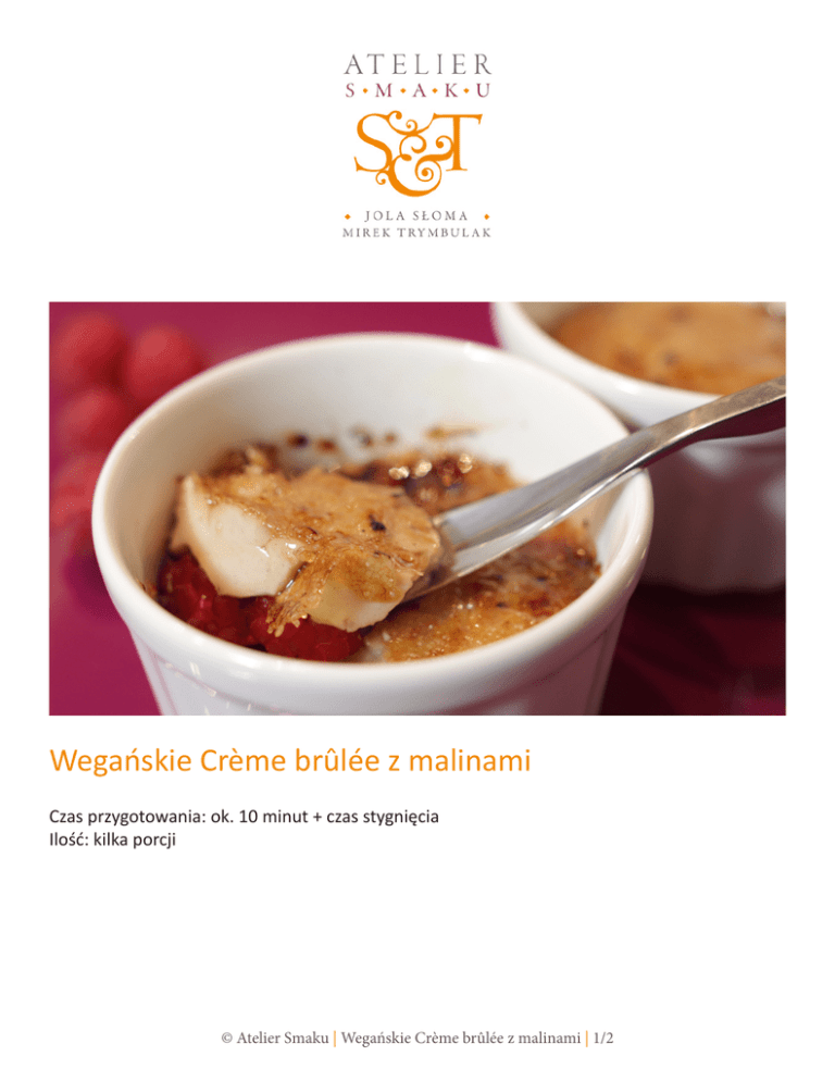 Wegańskie Crème brûlée z malinami Czas przygotowania: ok. 10 minut + czas stygnięcia Ilość: kilka porcji © Atelier Smaku | Wegańskie Crème brûlée z malinami | 1/2 Składniki 200 ml śmietanki sojowej 2 czubate łyżki gęstego mleka kokosowego 2 łyżki brązowego cukru trzcinowego 2 czubate łyżki mąki kasztanowej 100 ml mleka sojowego dodatkowo brązowy cukier trzcinowy do posypania i karmelizowania maliny do smaku Sposób przygotowania Zagotowujemy w rondelku śmietkankę sojową wraz z mlekiem kokosowym i cukrem.Mąkę kasztanową dokładnie mieszamy z mlekiem sojowym i wlewamy do rondelka. Mieszamy przez chwilę aż deser osiągnie odpowiednią, budynową konsystencję. Następnie wlewamy go do miseczek lub do małych foremek wyłożonych malinami, które można delikatnie zgnieść widelcem lub łyżką. Potrząsamy aby powierzchnia deseru była gładka, odstawiamy do przestygnięcia i wkładamy do lodówki. Przed podaniem schłodzony deser posypujemy równo po wierzchu jedną łyżeczką brązowego cukru trzcinowym i karmelizujemy opalajac go za pomocą przeznaczonej do tego specjalnego palnika. © Atelier Smaku | Wegańskie Crème brûlée z malinami | 2/2