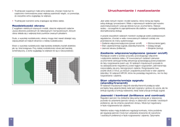 • Trudniej jest wypatrzyć małe echa radarowe, chociaż może być to częściowo równoważone przez większą szerokość wiązki, co powoduje, że wszystkie echa wyglądają na większe. • Trudniej jest rozróżnić echa znajdujące się blisko siebie. Rozdzielczość ekranu Z wyjątkiem niektórych starszych modeli, obecnie większość radarów używa ekranów podobnych do telewizyjnych i komputerowych, których obraz składa się z większej ilości punktów zwanych pikselami. Duże, o wysokiej rozdzielczości, ekrany mogą mieć nawet dziesięć razy więcej pikseli od małych ekranów o niskiej rozdzielczości. Ekran o wysokiej rozdzielczości daje bardziej dokładny kształt obiektów jak np. linia brzegowa. Przy niskiej rozdzielczości obraz jest bardziej schematyczny, a echa wyglądają na większe niż są w rzeczywistości. Uruchamianie i nastawianie Jest wiele różnych marek i modeli radarów, które różnią się między sobą obsługą i procedurami. Wiele z najnowszych radarów jest wysoko zautomatyzowanych i pracuje dobrze tuż po uruchomieniu. Starsze radary – szczególnie te zaprojektowane dla statków – wymagają bardziej skomplikowanej obsługi. W prawie wszystkich radarach morskich występuje sześć podstawowych regulatorów, chociaż w wielu nowoczesnych radarach zostały one przeniesione do menu systemowego: • Zasilanie włączone/wyłączone (power on/off). • Wzmocnienie (gain). • Stan uśpienia/emisja sygnału (standby/transmit). • Zasięg (range). • Jasność ekranu (brilliance). • Strojenie (tuning). Zasilanie włączone/wyłączone (power on/off) Występuje zwykle w postaci przycisku powodującego włączenie i wyłączenie zasilania radaru. W nowoczesnych radarach pierwsze uruchomienie zainicjuje krótką sekwencję sprawdzającą przed przejściem do fazy rozgrzewania (warm up). W radarach impulsowych pozwala to na zabezpieczenie magnetronu przed nagłym rozgrzaniem, jeśli transmisja rozpoczęłaby się przy nierozgrzanym radarze. Rozgrzewanie trwa zwykle około 2 minut, po których urządzenie przechodzi w stan uśpienia (standby). W radarach MFCW, które nie posiadają magnetronu, nie ma fazy rozgrzewania i uśpienia. Stan uśpienia/emisja sygnału (standby/transmit) W radarach impulsowych włącznik standby/transmit przełącza radar pomiędzy fazą uśpienia (kiedy radar jest rozgrzany i gotowy do użycia, ale nie emituje sygnału) a funkcją nadawania, kiedy radar pracuje emitując sygnał. Jasność i kontrast (brilliance and contrast) Regulator jasności ma dokładnie taką samą funkcję jak w telewizorze: pozwala na ustawienie jasności obrazu w zależności od światła i osobistych preferencji, ale nie zmienia zawartości obrazu. Może być regulowany w fazie rozgrzewania lub uśpienia. Niektóre radary mają dodatkowo regulację kontrastu, która podobnie jak regulacja jasności może być ustawiana stosownie do warunków i osobistych preferencji w fazie rozgrzewania i uśpienia. Optymalne 14 15
