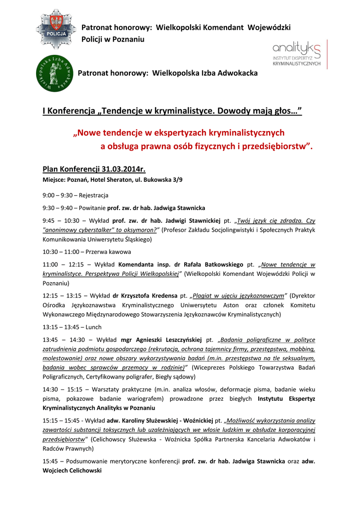 Patronat honorowy: Wielkopolski Komendant Wojewódzki Policji w Poznaniu Patronat honorowy: Wielkopolska Izba Adwokacka I Konferencja „Tendencje w kryminalistyce. Dowody mają głos…” „Nowe tendencje w ekspertyzach kryminalistycznych a obsługa prawna osób fizycznych i przedsiębiorstw”. Plan Konferencji 31.03.2014r. Miejsce: Poznań, Hotel Sheraton, ul. Bukowska 3/9 9:00 – 9:30 – Rejestracja 9:30 – 9:40 – Powitanie prof. zw. dr hab. Jadwiga Stawnicka 9:45 – 10:30 – Wykład prof. zw. dr hab. Jadwigi Stawnickiej pt. „Twój język cię zdradza. Czy "anonimowy cyberstalker" to oksymoron?” (Profesor Zakładu Socjolingwistyki i Społecznych Praktyk Komunikowania Uniwersytetu Śląskiego) 10:30 – 11:00 – Przerwa kawowa 11:00 – 12:15 – Wykład Komendanta insp. dr Rafała Batkowskiego pt. „Nowe tendencje w kryminalistyce. Perspektywa Policji Wielkopolskiej” (Wielkopolski Komendant Wojewódzki Policji w Poznaniu) 12:15 – 13:15 – Wykład dr Krzysztofa Kredensa pt. „Plagiat w ujęciu językoznawczym” (Dyrektor Ośrodka Językoznawstwa Kryminalistycznego Uniwersytetu Aston oraz członek Komitetu Wykonawczego Międzynarodowego Stowarzyszenia Językoznawców Kryminalistycznych) 13:15 – 13:45 – Lunch 13:45 – 14:30 – Wykład mgr Agnieszki Leszczyńskiej pt. „Badania poligraficzne w polityce zatrudnienia podmiotu gospodarczego (rekrutacja, ochrona tajemnicy firmy, przestępstwa, mobbing, molestowanie) oraz nowe obszary wykorzystywania badań (m.in. przestępstwa na tle seksualnym, badania wobec sprawców przemocy w rodzinie)” (Wiceprezes Polskiego Towarzystwa Badań Poligraficznych, Certyfikowany poligrafer, Biegły sądowy) 14:30 – 15:15 – Warsztaty praktyczne (m.in. analiza włosów, deformacje pisma, badanie wieku pisma, pokazowe badanie wariografem) prowadzone przez biegłych Instytutu Ekspertyz Kryminalistycznych Analityks w Poznaniu 15:15 – 15:45 - Wykład adw. Karoliny Służewskiej - Woźnickiej pt. „Możliwość wykorzystania analizy zawartości substancji toksycznych lub uzależniających we włosie ludzkim w obsłudze korporacyjnej przedsiębiorstw" (Celichowscy Służewska - Woźnicka Spółka Partnerska Kancelaria Adwokatów i Radców Prawnych) 15:45 – Podsumowanie merytoryczne konferencji prof. zw. dr hab. Jadwiga Stawnicka oraz adw. Wojciech Celichowski