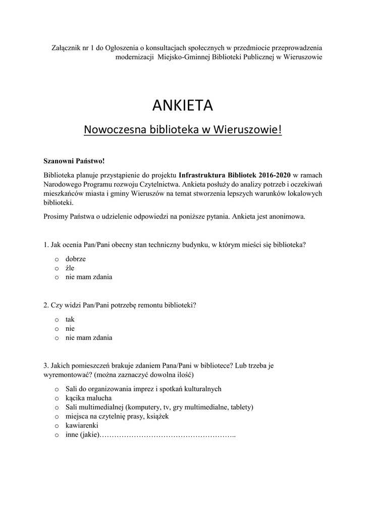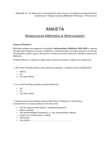 Załącznik nr 1 do Ogłoszenia o konsultacjach społecznych w przedmiocie przeprowadzenia modernizacji Miejsko-Gminnej Biblioteki Publicznej w Wieruszowie ANKIETA Nowoczesna biblioteka w Wieruszowie! Szanowni Państwo! Biblioteka planuje przystąpienie do projektu Infrastruktura Bibliotek 2016-2020 w ramach Narodowego Programu rozwoju Czytelnictwa. Ankieta posłuży do analizy potrzeb i oczekiwań mieszkańców miasta i gminy Wieruszów na temat stworzenia lepszych warunków lokalowych biblioteki. Prosimy Państwa o udzielenie odpowiedzi na poniższe pytania. Ankieta jest anonimowa. 1. Jak ocenia Pan/Pani obecny stan techniczny budynku, w którym mieści się biblioteka? o dobrze o źle o nie mam zdania 2. Czy widzi Pan/Pani potrzebę remontu biblioteki? o tak o nie o nie mam zdania 3. Jakich pomieszczeń brakuje zdaniem Pana/Pani w bibliotece? Lub trzeba je wyremontować? (można zaznaczyć dowolna ilość) o o o o o o Sali do organizowania imprez i spotkań kulturalnych kącika malucha Sali multimedialnej (komputery, tv, gry multimedialne, tablety) miejsca na czytelnię prasy, książek kawiarenki inne (jakie)……………………………………………….. 4.Czy uważa Pan/Pani, że istnieje potrzeba budowy windy, aby dostosować budynek do potrzeb osób niepełnosprawnych i seniorów? o tak o nie o nie mam zdania 5. Czy uważa Pan/Pani, że wyremontowany budynek biblioteki wpłynie na atrakcyjność miasta Wieruszowa? o tak o nie o trudno powiedzieć Metryczka: Wiek o o o o Do 25 lat 26-45 46-65 Powyżej 66 lat Płeć o Kobieta o mężczyzna Twoja opinia jest bardzo ważna! Dziękujemy za wypełnienie ankiety.