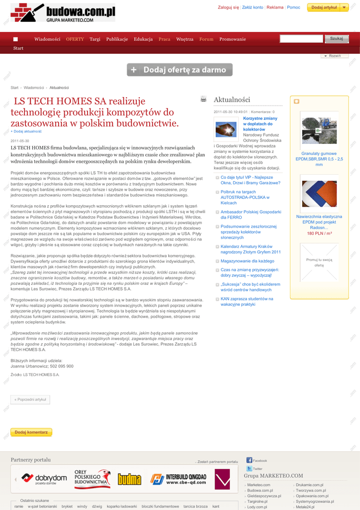 Zaloguj się | Załóż konto | Reklama | Pomoc Wiadomości OFERTY Targi Publikacje Edukacja Praca Wnętrza Forum Dodaj artykuł Szukaj Promowanie Start Rozwiń Start Wiadomości Aktualności Aktualności LS TECH HOMES SA realizuje technologię produkcji kompozytów do zastosowania w polskim budownictwie. Super Oferta 2011 -05-30 10:49:01 | Komentarze: 0 + Dodaj aktualno ść 2011 -05-30 LS TECH HOMES firma budowlana, specjalizująca się w innowacyjnych rozwiązaniach konstrukcyjnych budownictwa mieszkaniowego w najbliższym czasie chce zrealizować plan wdrożenia technologii domów energooszczędnych na polskim rynku deweloperskim. Korzystne zmiany w dopłatach do kolektorów Narodowy Fundusz Ochrony Środowiska i Gospodarki Wodnej wprowadza zmiany w systemie korzystania z dopłat do kolektorów słonecznych. Teraz jeszcze więcej osób kwalifikuje się do uzyskania dotacji. Projekt domów energooszczędnych spółki LS TH to efekt zapotrzebowania budownictwa mieszkaniowego w Polsce. Oferowane rozwiązanie w postaci domów z tzw. „gotowych elementów” jest bardzo wygodne i pochłania dużo mniej kosztów w porównaniu z tradycyjnym budownictwem. Nowe domy mają być bardziej ekonomiczne, czyli: tańsze i szybsze w budowie oraz nowoczesne, przy jednoczesnym zachowaniu norm bezpiecze ństwa i standard ów budownictwa mieszkaniowego. Granulaty gumowe EPDM,SBR,SMR 0,5 - 2,5 mm Co daje tytuł VIP - Najlepsze Okna, Drzwi i Bramy Garażowe? Polbruk na targach AUTOSTRADA-POLSKA w Kielcach Konstrukcja nośna z profilów kompozytowych wzmocnionych włóknem szklanym jak i system łączeń elementów ściennych z płyt magnezowych i styropianu pochodzą z produkcji spółki LSTH i są w tej chwili badane w Politechnice Gdańskiej w Katedrze Podstaw Budownictwa i Inżynierii Materiałowej. Wkrótce, na Politechnice Gdańskiej, do dalszych analiz powstanie dom modelowy w powi ązaniu z powstającym modelem numerycznym. Elementy kompozytowe wzmacniane włóknem szklanym, z których docelowo powstaje dom jeszcze nie są tak popularne w budownictwie polskim czy europejskim jak w USA. Płyty magnezowe ze względu na swoje właściwości zarówno pod względem ogniowym, oraz odporności na wilgoć, grzyby i pleśnie są stosowane coraz częściej w budynkach narażonych na takie czynniki. Ambasador Polskiej Gospodarki dla FERRO Podsumowanie zesz łorocznej sprzedaży kolektorów słonecznych Nawierzchnia elastyczna EPDM pod projekt Radosn... 180 PLN / m² Kalendarz Armatury Kraków nagrodzony Złotym Gryfem 2011 Rozwiązanie, jakie proponuje spółka będzie dotyczyło również sektora budownictwa komercyjnego. Dywersyfikacja oferty umożliwi dotarcie z produktami do szerokiego grona klientów indywidualnych, klientów masowych jak również firm deweloperskich czy instytucji publicznych. „Szereg zalet tej innowacyjnej technologii a przede wszystkim niższe koszty, krótki czas realizacji, znaczne ograniczenie kosztów budowy, remontów, a także marze ń o posiadaniu własnego domu pozwalają zakładać, iż technologia ta przyjmie się na rynku polskim oraz w krajach Europy” – komentuje Les Surowiec, Prezes Zarz ądu LS TECH HOMES S.A. Promuj tu swoj ą Magazynowanie dla każdego ofertę Czas na zmianę przyzwyczajeń: dobry zwyczaj – wypożyczaj! „Sukcesja” chce być ekoliderem wśród centrów handlowych Promuj tu swoj ą ofertę KAN zaprasza studentów na wakacyjne praktyki Przygotowania do produkcji tej nowatorskiej technologii są w bardzo wysokim stopniu zaawansowania. W wyniku realizacji projektu zostanie stworzony system innowacyjnych, lekkich paneli poprzez unikalne połączenie płyty magnezowej i styropianowej. Technologia ta będzie wyróżniała się niespotykanymi dotychczas funkcjami zastosowania, takimi jak: panele ścienne, dachowe, podłogowe, stropowe oraz system ocieplenia budynków. „Wprowadzenie możliwości zastosowania innowacyjnego produktu, jakim będą panele samonośne pozwoli firmie na rozwój i realizację poszczególnych inwestycji, zagwarantuje miejsca pracy oraz b ędzie zgodne z polityką horyzontalną i środowiskową” - dodaje Les Surowiec, Prezes Zarządu LS TECH HOMES S.A. Bliższych informacji udziela: Joanna Urbanowicz; 502 095 900 Źródło: LS TECH HOMES S.A. « Poprzedni artykuł Dodaj komentarz Partnerzy portalu Zostań partnerem portalu Facebook Twitter Grupa MARKETEO.COM Ostatnio szukane ramie w ęzeł betoniarski brykiet windy dźwig koparko ładowarki bloczki fundamentowe tarcica brzoza kant Marketeo.com Budowa.com.pl Gieldaspozywcza.pl Targirolne.pl Lody.com.pl Drukarnie.com.pl Tworzywa.com.pl Opakowania.com.pl Systemyogrzewania.pl Metale24.pl renowacja ceg samsung blacha ocynk in tyton ceg kontenery mieszkalne elewacyjna kostka granitowa wid olej spo szukam odbiorc kruszarki kr osuszacze migomat ko marmur Rain Forest Brown instalacje szcz czujnik O nas Reklama Promowanie Pomoc Regulamin Zgłoś błąd Kontakt Alarmy.com.pl Biznes.iso.pl Kleje.com.pl Koncentraty.pl Nawozy.com.pl Srodowisko.iso.pl Targimeblowe.pl Targisportowe.pl Targitransportowe.pl Tkaniny.com.pl Zabawki.com.pl Wentylacja.com.pl Kwiaty.com.pl Rajnarzedzi.pl AGDRTV.iso.pl AGD.iso.pl RTV.iso.pl Artykulybiurowe.iso.pl Alkohole.iso.pl Automatyka.iso.pl Kobieta.iso.pl Marketeo.tv Copyright © 1998-2011 MARKETEO.COM S.A.