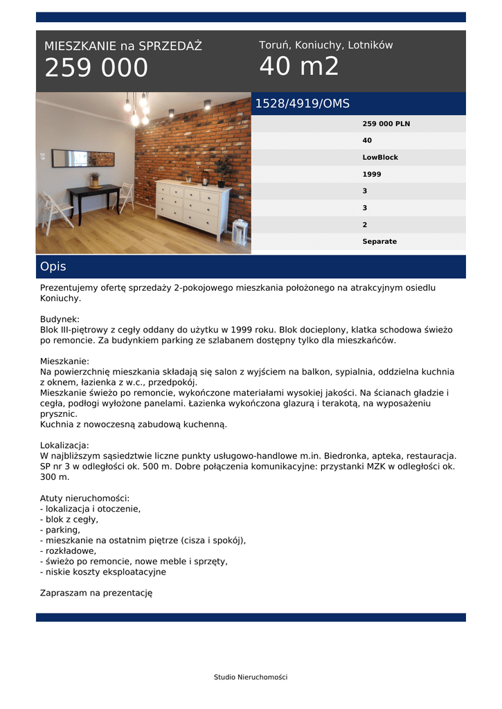 Toruń, Koniuchy, Lotników MIESZKANIE na SPRZEDAŻ 40 m2 259 000 1528/4919/OMS 259 000 PLN 40 LowBlock 1999 3 3 2 Separate Opis Prezentujemy ofertę sprzedaży 2-pokojowego mieszkania położonego na atrakcyjnym osiedlu Koniuchy. Budynek: Blok III-piętrowy z cegły oddany do użytku w 1999 roku. Blok docieplony, klatka schodowa świeżo po remoncie. Za budynkiem parking ze szlabanem dostępny tylko dla mieszkańców. Mieszkanie: Na powierzchnię mieszkania składają się salon z wyjściem na balkon, sypialnia, oddzielna kuchnia z oknem, łazienka z w.c., przedpokój. Mieszkanie świeżo po remoncie, wykończone materiałami wysokiej jakości. Na ścianach gładzie i cegła, podłogi wyłożone panelami. Łazienka wykończona glazurą i terakotą, na wyposażeniu prysznic. Kuchnia z nowoczesną zabudową kuchenną. Lokalizacja: W najbliższym sąsiedztwie liczne punkty usługowo-handlowe m.in. Biedronka, apteka, restauracja. SP nr 3 w odległości ok. 500 m. Dobre połączenia komunikacyjne: przystanki MZK w odległości ok. 300 m. Atuty nieruchomości: - lokalizacja i otoczenie, - blok z cegły, - parking, - mieszkanie na ostatnim piętrze (cisza i spokój), - rozkładowe, - świeżo po remoncie, nowe meble i sprzęty, - niskie koszty eksploatacyjne Zapraszam na prezentację Studio Nieruchomości tel. 512946211 email: [email protected] Studio Nieruchomości Powered by TCPDF (www.tcpdf.org)