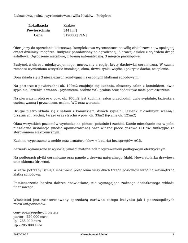 Luksusowa, świeżo wyremontowana willa Kraków - Podgórze Lokalizacja Kraków Powierzchnia 344 [m2] Cena 3120000[PLN] Oferujemy do sprzedania luksusową, kompleksowo wyremontowaną willę zlokalizowaną w spokojnej części dzielnicy Podgórze. Budynek posadowiony na ogrodzonej, 5 arowej działce z dojazdem drogą asfaltową. Ogrodzenie metalowe, z bramą automatyczną. 3 miejsca parkingowe. Budynek z okresu międzywojennego, murowany z cegły, kryty dachówką ceramiczną. W czasie remontu wymieniono wszystkie instalacje, okna, drzwi, tynki, więźbę i pokrycie dachu, ocieplenie. Dom składa się z 3 niezależnych kondygnacji z osobnymi klatkami schodowymi. Na parterze o powierzchni ok. 100m2 znajduje się kuchnia, obszerny salon z kominkiem, dwie sypialnie, łazienka z wanno - prysznicem, osobne WC, pralnia oraz dodatkowe małe pomieszczenie. Na pierwszym piętrze o pow. ok. 100m2 jest kuchnia, salon przechodni, dwie sypialnie, łazienka z osobną wanną i prysznicem, osobne WC oraz weranda. Drugie piętro składa się z salonu z kominkiem, dwóch sypialni, łazienki z osobnymi wanną i prysznicem, kuchni, tarasu oraz strychu o pow. ok. 33m2 (łącznie ok. 125m2) Okna wszystkich poziomów wychodzą na północ, południe i zachód. Każde mieszkanie ma w pełni niezależne instalacje (media opomiarowane) oraz własne piece gazowe CO dwufunkcyjne ze sterowaniem elektronicznym. Kuchnie wyposażone w meble oraz armaturę (zlew + bateria) bez sprzętów AGD. Łazienki wykończone w wysokiej jakości materiałach z ogrzewaniem podłogowym elektrycznym. Na podłogach płytki ceramiczne oraz panele z drewna naturalnego (dąb). Nowa stolarka drzwiowa oraz okienna (drewno). W razie potrzeby istnieje możliwość połączenia wszystkich trzech poziomów wspólną wewnętrzną klatką schodową. Pomieszczenia bardzo dobrze doświetlone, nie wymagające żadnego dodatkowego wkładu finansowego. Właściciel jest zainteresowany sprzedażą zarówno całego budynku jak i poszczególnych mieszkań/poziomów. ceny poszczególnych pięter: parter - 220 000 euro Ip - 265 000 euro IIp - 285 000 euro 2017-03-07 Nieruchomości Feluś 1 Cena za cały budynek - 750 000 euro. Kwota podana w tytule jest przeliczeniem na złotówki wg średniego kursu NBP z dnia 13.05.2013 (4,16zł/1€) Istnieje również możliwość wynajęcia poszczególnych kondygnacji pod działalność gospodarczą w cenie 4500zł/netto Gorąco polecamy osobom poszukującym stylowego budynku w Krakowie w zielonej i spokojnej okolicy! Kontakt do biura: (12) 267 03 33 Zapewniamy kompleksowe doradztwo na krakowskim rynku nieruchomości. Skorzystaj z naszych usług i poleć nas swoim znajomym! Więcej ofert znajdziecie Państwo na naszej stronie internetowej - www.nieruchomoscifelus.pl Zadzwoń i zapytaj jaką nieruchomość możemy Ci zaproponować. Nota prawna Dokładamy wszelkich starań, aby informacje dotyczące prezentowanych nieruchomości były jak najbardziej dokładne i kompletne. Opis oferty zawarty na stronie internetowej sporządzany jest na podstawie oględzin nieruchomości oraz informacji uzyskanych od właściciela, może podlegać aktualizacji i nie stanowi oferty określonej w art. 66 i następnych Kodeksu Cywilnego Powierzchnia domu [m2] 344 Powierzchnia działki [m2] 500 Cena [PLN] 3 120 000 Województwo malopolskie Miasto Kraków Dzielnica Podgórze Rodzaj zabudowy pół willi Stan techniczny luksusowy Materiał konstrukcyjny cegła Dach dachówka ceramiczna Ilość pięter 2 Rok budowy dwudziestolecie międzywojenne Ilość pokoi 10 Okna nowe drewniane Ogrzewanie gazowe + kominek Umeblowanie kuchnia + łazienka Piwnica nie Garaż nie Zobacz wszystkie oferty z działu: Domy Kraków 2017-03-07 Nieruchomości Feluś 2