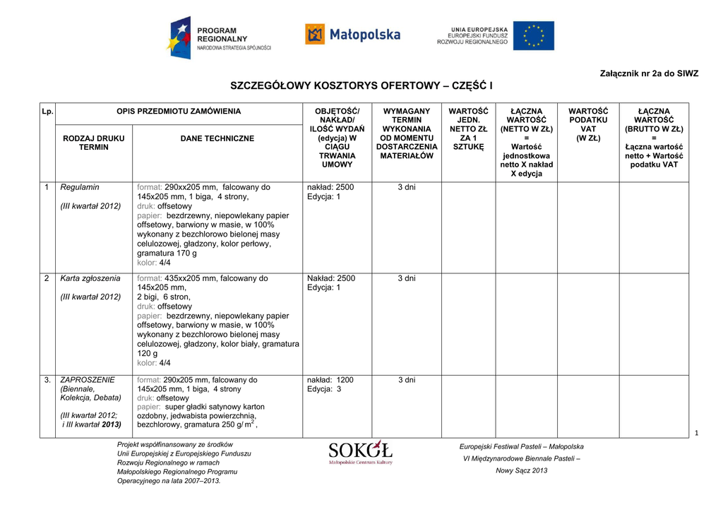 Załącznik nr 2a do SIWZ SZCZEGÓŁOWY KOSZTORYS OFERTOWY – CZĘŚĆ I OPIS PRZEDMIOTU ZAMÓWIENIA Lp. RODZAJ DRUKU TERMIN 1 Regulamin (III kwartał 2012) 2 Karta zgłoszenia (III kwartał 2012) 3. ZAPROSZENIE (Biennale, Kolekcja, Debata) (III kwartał 2012; i III kwartał 2013) DANE TECHNICZNE OBJĘTOŚĆ/ NAKŁAD/ ILOŚĆ WYDAŃ (edycja) W CIĄGU TRWANIA UMOWY WYMAGANY TERMIN WYKONANIA OD MOMENTU DOSTARCZENIA MATERIAŁÓW nakład: 2500 Edycja: 1 3 dni format: 435xx205 mm, falcowany do Nakład: 2500 145x205 mm, Edycja: 1 2 bigi, 6 stron, druk: offsetowy papier: bezdrzewny, niepowlekany papier offsetowy, barwiony w masie, w 100% wykonany z bezchlorowo bielonej masy celulozowej, gładzony, kolor biały, gramatura 120 g kolor: 4/4 3 dni nakład: 1200 Edycja: 3 3 dni format: 290xx205 mm, falcowany do 145x205 mm, 1 biga, 4 strony, druk: offsetowy papier: bezdrzewny, niepowlekany papier offsetowy, barwiony w masie, w 100% wykonany z bezchlorowo bielonej masy celulozowej, gładzony, kolor perłowy, gramatura 170 g kolor: 4/4 format: 290x205 mm, falcowany do 145x205 mm, 1 biga, 4 strony druk: offsetowy papier: super gładki satynowy karton ozdobny, jedwabista powierzchnia, 2 bezchlorowy, gramatura 250 g/ m , WARTOŚĆ JEDN. NETTO ZŁ ZA 1 SZTUKĘ ŁĄCZNA WARTOŚĆ (NETTO W ZŁ) = Wartość jednostkowa netto X nakład X edycja WARTOŚĆ PODATKU VAT (W ZŁ) ŁĄCZNA WARTOŚĆ (BRUTTO W ZŁ) = Łączna wartość netto + Wartość podatku VAT 1 Projekt współfinansowany ze środków Unii Europejskiej z Europejskiego Funduszu Rozwoju Regionalnego w ramach Małopolskiego Regionalnego Programu Operacyjnego na lata 2007–2013. Europejski Festiwal Pasteli – Małopolska VI Międzynarodowe Biennale Pasteli – Nowy Sącz 2013 grubość µm 270, szorstkość 50 ml/min, Sztywność: mN (Taber), MD 100 CD 55, wilgotność względna 40-60 %, wilgotność bezwzględna 6, 7 %, kolor biały kolor: 4/4 folia: matowa, dwustronna 4. ZAPROSZENIE (Laureat, Poplenerowa, Historyczna) (III kwartał 2013) 5. KATALOG (Biennale) (III kwartał 2013) Katalog będzie miał nadany nr ISBN format: 145x205 mm, 2 strony druk: offsetowy papier: super gładki satynowy karton ozdobny, jedwabista powierzchnia, bezchlorowy, 2 gramatura 320 g/ m , grubość 350 µm, szorstkość 50 ml/min, Sztywność: mN (Taber), MD 200 CD 100, wilgotność względna 40-60 %, wilgotność bezwzględna 6, 7 %, kolor biały kolor: 4/4 folia: matowa, dwustronna nakład: 1200 Edycja: 3 3 dni format:: 265x230 mm druk: offsetowy papier - wnętrze: matowy, dwustronnie powlekany papier o wysokiej białości i dużym stopniu spulchnienia, matowa powierzchnia Właściwości papieru: wysoki wolumen, nieprzezroczystość i sztywność, gramatura 2 150 g/m , grubość 165 µm, nieprzezroczystość 97 %, kolor biały kolor: 4/4 papier-okładka: matowy, dwustronnie powlekany papier o wysokiej białości i dużym stopniu spulchnienia, matowa powierzchnia, właściwości papieru: wysoki wolumen, nieprzezroczystość i sztywność, gramatura 2 300 g/m , grubość 330 µm, nieprzezroczystość 99,5 %, białość (CIE) 1.1, jasność (ISO 24702: D65, %) 96, PPS, µm 4.4, kolor biały, skrzydełka 220 mm, folia: matowa oprawa: klejona objętość stron: 252 (+/- 12) nakład: 600 Edycja: 1 10 dni 2 Projekt współfinansowany ze środków Unii Europejskiej z Europejskiego Funduszu Rozwoju Regionalnego w ramach Małopolskiego Regionalnego Programu Operacyjnego na lata 2007–2013. Europejski Festiwal Pasteli – Małopolska VI Międzynarodowe Biennale Pasteli – Nowy Sącz 2013 6. KATALOG (Kolekcja) (III kwartał 2012) Katalog będzie miał nadany nr ISBN 7. KATALOG (Laureata, Poplenerowej, Historycznej) (II i III kwartał 2013) Katalog będzie miał nadany nr ISBN format:: 265x200 mm druk: offsetowy papier - wnętrze: papier - wnętrze: matowy, dwustronnie powlekany papier o wysokiej białości i dużym stopniu spulchnienia, matowa powierzchnia, właściwości papieru: wysoki wolumen, nieprzezroczystość i sztywność, gramatura 2 150 g/m , grubość 165 µm, nieprzezroczystość 97 %, kolor biały kolor: 4/4 papier-okładka: matowy, dwustronnie powlekany papier o wysokiej białości i dużym stopniu spulchnienia, matowa powierzchnia, właściwości papieru: wysoki wolumen, nieprzezroczystość i sztywność, gramatura 2 300 g/m g, grubość 330 µm, nieprzezroczystość 99,5 %, białość (CIE) 1.1, jasność (ISO 2470-2: D65, %) 96, PPS, µm 4.4, kolor biały, skrzydełka 190 mm folia: matowa oprawa: klejona objętość stron: 176 (+/- 12) nakład: 250 Edycja: 1 10 dni format:: 265x200 mm druk: offsetowy papier - wnętrze: matowy, dwustronnie powlekany papier o wysokiej białości i dużym stopniu spulchnienia, matowa powierzchnia, właściwości papieru: wysoki wolumen, nieprzezroczystość i sztywność, 2 gramatura 150 g/m , grubość 165 µm, nieprzezroczystość 97 %, kolor biały kolor: 4/4 papier-okładka: matowy, dwustronnie powlekany papier o wysokiej białości i dużym stopniu spulchnienia, matowa powierzchnia, właściwości papieru: wysoki wolumen, nieprzezroczystość i sztywność, 2 gramatura 300 g/m , grubość 330 µm, nieprzezroczystość 99,5 %, białość (CIE) 1.1, objętość stron: 112 (+/- 12) nakład: 200 Edycja: 3 10 dni 3 Projekt współfinansowany ze środków Unii Europejskiej z Europejskiego Funduszu Rozwoju Regionalnego w ramach Małopolskiego Regionalnego Programu Operacyjnego na lata 2007–2013. Europejski Festiwal Pasteli – Małopolska VI Międzynarodowe Biennale Pasteli – Nowy Sącz 2013 jasność (ISO 2470-2: D65, %) 96, PPS, µm 4.4, kolor biały, skrzydełka 198 mm, folia: matowa oprawa: klejona 8. PLAKAT (III kwartał 2013) 9. PLAKAT (III kwartał 2013; III kwartał 2012) 10. TECZKA (III kwartał 2012) 11. TOREBKA REKLAMOWA (III kwartał 2012) 12. OKŁADKA NA PŁYTĘ (III kwartał 2013) format: 594x841 mm (A1) druk: offsetowy papier: kreda 150g kolor: 4/0 nakład: 600 Edycja: 1 4 dni format: 594x841 mm (A1) druk: offs
