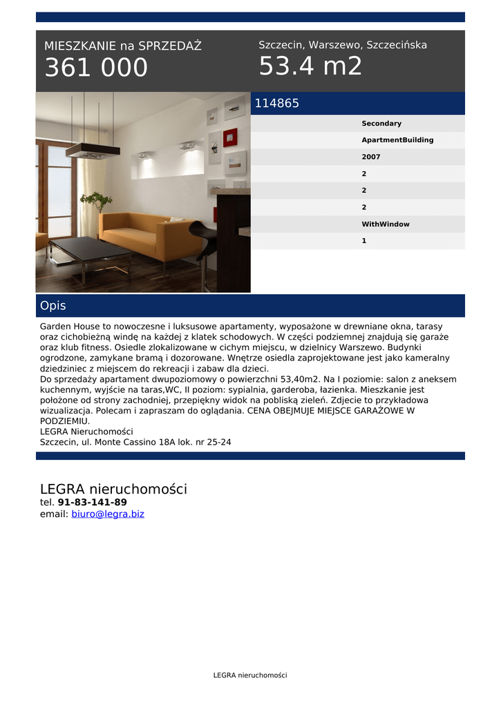 MIESZKANIE na SPRZEDAŻ 361 000 Szczecin, Warszewo, Szczecińska 53.4 m2 114865 Secondary ApartmentBuilding 2007 2 2 2 WithWindow 1 Opis Garden House to nowoczesne i luksusowe apartamenty, wyposażone w drewniane okna, tarasy oraz cichobieżną windę na każdej z klatek schodowych. W części podziemnej znajdują się garaże oraz klub fitness. Osiedle zlokalizowane w cichym miejscu, w dzielnicy Warszewo. Budynki ogrodzone, zamykane bramą i dozorowane. Wnętrze osiedla zaprojektowane jest jako kameralny dziedziniec z miejscem do rekreacji i zabaw dla dzieci. Do sprzedaży apartament dwupoziomowy o powierzchni 53,40m2. Na I poziomie: salon z aneksem kuchennym, wyjście na taras,WC, II poziom: sypialnia, garderoba, łazienka. Mieszkanie jest położone od strony zachodniej, przepiękny widok na pobliską zieleń. Zdjecie to przykładowa wizualizacja. Polecam i zapraszam do oglądania. CENA OBEJMUJE MIEJSCE GARAŻOWE W PODZIEMIU. LEGRA Nieruchomości Szczecin, ul. Monte Cassino 18A lok. nr 25-24 LEGRA nieruchomości tel. 91-83-141-89 email: [email protected] LEGRA nieruchomości Powered by TCPDF (www.tcpdf.org)