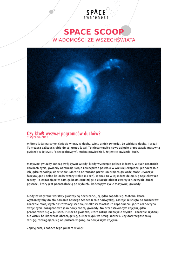 SPACE SCOOP WIADOMOŚCI ZE WSZECHŚWIATA Czy ktoś wezwał pogromców duchów? 9 stycznia 2013 Miliony ludzi na całym świecie wierzy w duchy, wielu z nich twierdzi, że widziało ducha. Teraz i Ty możesz zaliczyć siebie do tej grupy ludzi! To niesamowite nowe zdjęcie przedstawia masywną gwiazdę w jej życiu ‘pozagrobowym’. Można powiedzieć, że jest to gwiazda-duch. Masywne gwiazdy kończą swój żywot wtedy, kiedy wyczerpią paliwo jądrowe. W tych ostatnich chwilach życia, gwiazdy odrzucają swoje zewnętrzne powłoki w wielkiej eksplozji, jednocześnie ich jądra zapadają się w sobie. Materia odrzucona przez umierającą gwiazdę może utworzyć fascynujące i pełne kolorów wzory (takie jak ten), jednak to w jej jądrze dzieją się najciekawsze rzeczy. To zapadające w pamięć kosmiczne zdjęcie ukazuje obiekt zwarty o niezwykle dużej gęstości, który jest pozostałością po wybuchu kończącym życie masywnej gwiazdy. Kiedy zewnętrzne warstwy gwiazdy są odrzucane, jej jądro zapada się. Materia, która wystarczyłaby do zbudowania naszego Słońca (i to z nadwyżką), zostaje ściśnięta do rozmiarów znacznie mniejszych niż rozmiary średniej wielkości miasta! Po zapadnięciu, jądro rozpoczyna swoje życie pozagrobowe jako nowy rodzaj gwiazdy. Na przedstawionym zdjęciu jądro przeobraziło się w pulsara. Pulsar to gwiazda, która rotuje niezwykle szybko - znacznie szybciej niż wirnik helikoptera! Obracając się, pulsar wypluwa strugi materii. Czy dostrzegasz taką strugę, rozciągającą się od pulsara w górę, na powyższym zdjęciu? Zajrzyj tutaj i zobacz tego pulsara w akcji! COOL FACT! Pulsary mają niezwykle silne pole grawitacyjne. Gdybyś był na powierzchni jednego z nich, to ważyłbyś około milion miliardów razy więcej niż ważysz na Ziemi! www.space-awareness.org/scoops