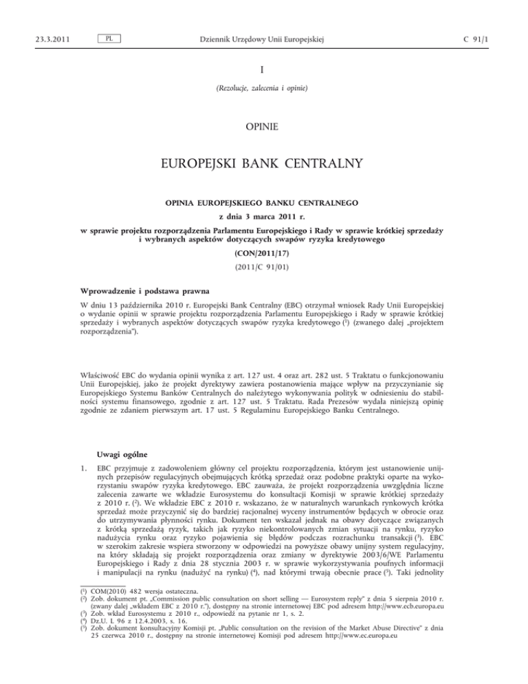 PL 23.3.2011 Dziennik Urzędowy Unii Europejskiej I (Rezolucje, zalecenia i opinie) OPINIE EUROPEJSKI BANK CENTRALNY OPINIA EUROPEJSKIEGO BANKU CENTRALNEGO z dnia 3 marca 2011 r. w sprawie projektu rozporządzenia Parlamentu Europejskiego i Rady w sprawie krótkiej sprzedaży i wybranych aspektów dotyczących swapów ryzyka kredytowego (CON/2011/17) (2011/C 91/01) Wprowadzenie i podstawa prawna W dniu 13 października 2010 r. Europejski Bank Centralny (EBC) otrzymał wniosek Rady Unii Europejskiej o wydanie opinii w sprawie projektu rozporządzenia Parlamentu Europejskiego i Rady w sprawie krótkiej sprzedaży i wybranych aspektów dotyczących swapów ryzyka kredytowego (1) (zwanego dalej „projektem rozporządzenia”). Właściwość EBC do wydania opinii wynika z art. 127 ust. 4 oraz art. 282 ust. 5 Traktatu o funkcjonowaniu Unii Europejskiej, jako że projekt dyrektywy zawiera postanowienia mające wpływ na przyczynianie się Europejskiego Systemu Banków Centralnych do należytego wykonywania polityk w odniesieniu do stabil ności systemu finansowego, zgodnie z art. 127 ust. 5 Traktatu. Rada Prezesów wydała niniejszą opinię zgodnie ze zdaniem pierwszym art. 17 ust. 5 Regulaminu Europejskiego Banku Centralnego. Uwagi ogólne 1. EBC przyjmuje z zadowoleniem główny cel projektu rozporządzenia, którym jest ustanowienie unij nych przepisów regulacyjnych obejmujących krótką sprzedaż oraz podobne praktyki oparte na wyko rzystaniu swapów ryzyka kredytowego. EBC zauważa, że projekt rozporządzenia uwzględnia liczne zalecenia zawarte we wkładzie Eurosystemu do konsultacji Komisji w sprawie krótkiej sprzedaży z 2010 r. (2). We wkładzie EBC z 2010 r. wskazano, że w naturalnych warunkach rynkowych krótka sprzedaż może przyczynić się do bardziej racjonalnej wyceny instrumentów będących w obrocie oraz do utrzymywania płynności rynku. Dokument ten wskazał jednak na obawy dotyczące związanych z krótką sprzedażą ryzyk, takich jak ryzyko niekontrolowanych zmian sytuacji na rynku, ryzyko nadużycia rynku oraz ryzyko pojawienia się błędów podczas rozrachunku transakcji (3). EBC w szerokim zakresie wspiera stworzony w odpowiedzi na powyższe obawy unijny system regulacyjny, na który składają się projekt rozporządzenia oraz zmiany w dyrektywie 2003/6/WE Parlamentu Europejskiego i Rady z dnia 28 stycznia 2003 r. w sprawie wykorzystywania poufnych informacji i manipulacji na rynku (nadużyć na rynku) (4), nad którymi trwają obecnie prace (5). Taki jednolity (1) COM(2010) 482 wersja ostateczna. (2) Zob. dokument pt. „Commission public consultation on short selling — Eurosystem reply” z dnia 5 sierpnia 2010 r. (zwany dalej „wkładem EBC z 2010 r.”), dostępny na stronie internetowej EBC pod adresem http://www.ecb.europa.eu (3) Zob. wkład Eurosystemu z 2010 r., odpowiedź na pytanie nr 1, s. 2. (4) Dz.U. L 96 z 12.4.2003, s. 16. (5) Zob. dokument konsultacyjny Komisji pt. „Public consultation on the revision of the Market Abuse Directive” z dnia 25 czerwca 2010 r., dostępny na stronie internetowej Komisji pod adresem http://www.ec.europa.eu C 91/1 PL C 91/2 Dziennik Urzędowy Unii Europejskiej system unijny konieczny jest dla integracji rynku finansowego wewnątrz Unii. Będzie on również wspierał zgodność z zasadami przyjętymi w innych ważnych centrach finansowych, takich jak Stany Zjednoczone (1). EBC przygotuje szczegółowe uwagi do zmian w dyrektywie 2003/6/WE, wydając we właściwym czasie opinię ich dotyczącą. 2. Zgodnie z wkładem Eurosystemu z 2010 r. (2), EBC z zadowoleniem przyjmuje: a) system zapewnia jący przejrzystość krótkiej sprzedaży akcji wprowadzony po modelu dwuprogowym, zalecanym wstępnie przez Komitet Europejskich Urzędów Nadzoru nad Rynkiem Papierów Wartościowych (3); oraz b) obowiązek ujawniania właściwym organom informacji o znacznych pozycjach krótkich netto dotyczących emitentów długu państwowego w Unii lub podobnych niepokrytych pozycjach z tytułu swapów ryzyka kredytowego (4). EBC wspiera wymogi mające na celu przeciwdziałanie ryzyku niedo konania rozrachunku spowodowanego przez niepokrytą krótką sprzedaż (5), zgodnie z którymi osoba fizyczna lub prawna nie powinna zostać dopuszczona do zawarcia transakcji krótkiej sprzedaży, chyba że pożyczyła akcje lub państwowe instrumenty dłużne, zawarła umowę pożyczki lub na podstawie potwierdzonej umowy będzie w stanie pożyczyć ten instrument w czasie rozrachunku. Ponadto EBC z zadowoleniem przyjmuje propozycje, zgodnie z którymi: a) właściwym organom przyznane zostaną zharmonizowane uprawnienia umożliwiające nakładanie w wyjątkowych okolicznościach tymczaso wych ograniczeń na krótką sprzedaż i na transakcje na swapach ryzyka kredytowego, koordynowanych przez Europejski Urząd Nadzoru nad Giełdami i Papierami Wartościowymi (ESMA) (6); oraz b) właściwe uprawnienia interwencyjne przyznane zostaną ESMA w przypadkach, w których zachodzi zagrożenie prawidłowego funkcjonowania oraz integralności systemu finansowego Unii (7). 3. EBC zauważa, że kilka inicjatyw regulacyjnych Unii, w tym projekt rozporządzenia w sprawie part nerów centralnych oraz repozytoriów transakcji (8), jak również przegląd dyrektywy 2004/39/WE w sprawie rynków instrumentów finansowych (9) ma za zadanie zwiększyć wymogi jawności w odniesieniu do zróżnicowanych rodzajów aktywów i podmiotów sprawozdawczych. EBC z zadowoleniem przyjmuje wskazany powyżej ogólny kierunek zmian, pod warunkiem, że poświęci się należytą uwagę zapewnieniu spójności oraz unikaniu luk i powielania zadań. Sfera ta leży w szczególnym interesie Eurosystemu ze względu na funkcje, jakie pełni on w zakresie statystyki oraz stabilności finansowej. Dlatego też Eurosystem będzie śledził postęp prac w tym zakresie we współpracy z Komisją. Uwagi szczegółowe Zakres obowiązywania 4. EBC zaleca (10) definiowanie instrumentów dług