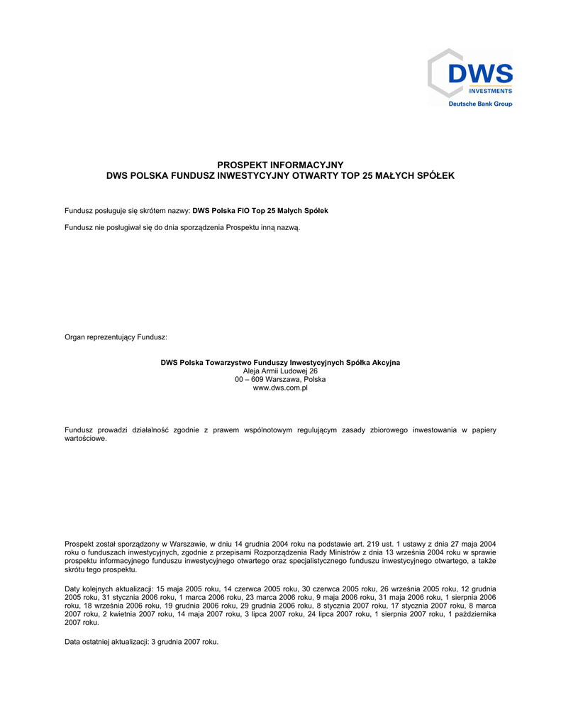 PROSPEKT INFORMACYJNY DWS POLSKA FUNDUSZ INWESTYCYJNY OTWARTY TOP 25 MAŁYCH SPÓŁEK Fundusz posługuje się skrótem nazwy: DWS Polska FIO Top 25 Małych Spółek Fundusz nie posługiwał się do dnia sporządzenia Prospektu inną nazwą. Organ reprezentujący Fundusz: DWS Polska Towarzystwo Funduszy Inwestycyjnych Spółka Akcyjna Aleja Armii Ludowej 26 00 – 609 Warszawa, Polska www.dws.com.pl Fundusz prowadzi działalność zgodnie z prawem wspólnotowym regulującym zasady zbiorowego inwestowania w papiery wartościowe. Prospekt został sporządzony w Warszawie, w dniu 14 grudnia 2004 roku na podstawie art. 219 ust. 1 ustawy z dnia 27 maja 2004 roku o funduszach inwestycyjnych, zgodnie z przepisami Rozporządzenia Rady Ministrów z dnia 13 września 2004 roku w sprawie prospektu informacyjnego funduszu inwestycyjnego otwartego oraz specjalistycznego funduszu inwestycyjnego otwartego, a także skrótu tego prospektu. Daty kolejnych aktualizacji: 15 maja 2005 roku, 14 czerwca 2005 roku, 30 czerwca 2005 roku, 26 września 2005 roku, 12 grudnia 2005 roku, 31 stycznia 2006 roku, 1 marca 2006 roku, 23 marca 2006 roku, 9 maja 2006 roku, 31 maja 2006 roku, 1 sierpnia 2006 roku, 18 września 2006 roku, 19 grudnia 2006 roku, 29 grudnia 2006 roku, 8 stycznia 2007 roku, 17 stycznia 2007 roku, 8 marca 2007 roku, 2 kwietnia 2007 roku, 14 maja 2007 roku, 3 lipca 2007 roku, 24 lipca 2007 roku, 1 sierpnia 2007 roku, 1 października 2007 roku. Data ostatniej aktualizacji: 3 grudnia 2007 roku. ROZDZIAŁ I. OSOBY ODPOWIEDZIALNE ZA INFORMACJE ZAWARTE W PROSPEKCIE I.1. Towarzystwo 1) Firma, siedziba i adres Towarzystwa DWS Polska Towarzystwo Funduszy Inwestycyjnych Spółka Akcyjna z siedzibą w Warszawie Aleja Armii Ludowej 26, 00 – 609 Warszawa, Polska 2) Imiona, nazwiska i funkcja osób fizycznych działających w imieniu Towarzystwa Jan Mieczkowski, Prezes Zarządu Piotr Linke, Wiceprezes Zarządu 3) Oświadczenia osób działających w imieniu Towarzystwa Informacje zawarte w prospekcie są prawdziwe i rzetelne oraz nie pomijają żadnych faktów ani okoliczności, których ujawnienie w prospekcie jest wymagane przepisami rozporządzenia. Wedle mojej najlepszej wiedzy nie istnieją, poza ujawnionymi w prospekcie, okoliczności, które mogłyby wywrzeć znaczący wpływ na sytuację prawną, majątkową i finansową Funduszu. Jan Mieczkowski Prezes Zarządu Informacje zawarte w prospekcie są prawdziwe i rzetelne oraz nie pomijają żadnych faktów ani okoliczności, których ujawnienie w prospekcie jest wymagane przepisami rozporządzenia. Wedle mojej najlepszej wiedzy nie istnieją, poza ujawnionymi w prospekcie, okoliczności, które mogłyby wywrzeć znaczący wpływ na sytuację prawną, majątkową i finansową Funduszu. Piotr Linke Wiceprezes Zarządu 2/77 I.2. Podmiot sporządzający Prospekt 1) Firma lub imię i nazwisko oraz siedziba, wraz z numerami telekomunikacyjnymi podmiotu sporządzającego Prospekt DWS Polska Towarzystwo Funduszy Inwestycyjnych Spółka Akcyjna z siedzibą w Warszawie, Aleja Armii Ludowej 26, 00 – 609 Warszawa, Polska Tel: Fax: +48 22 579 97 00 +48 22 579 97 01 2) Części Prospektu, za których sporządzenie jest odpowiedzialny podmiot sporządzający Prospekt Sporządzający Prospekt jest odpowiedzialny za sporządzenie wszystkich części Prospektu. 3) Imiona i nazwiska osób fizycznych działających w imieniu podmiotu sporządzającego Prospekt. Jan Mieczkowski, Prezes Zarządu Piotr Linke, Wiceprezes Zarządu 4) Oświadczenie osób działających w imieniu podmiotu sporządzającego Prospekt Prospekt został sporządzony z zachowaniem należytej staranności zawodowej. Informacje zawarte w tych częściach Prospektu, za których sporządzenie jest odpowiedzialny podmiot sporządzający prospekt, są prawdziwe i rzetelne oraz nie pomijają żadnych faktów ani okoliczności, których ujawnienie w prospekcie jest wymagane przepisami Rozporządzenia Rady Ministrów z dnia 13 września 2004 roku w sprawie prospektu informacyjnego funduszu inwestycyjnego otwartego oraz specjalistycznego funduszu inwestycyjnego otwartego, a także skrótu tego prospektu. Jan Mieczkowski Prezes Zarządu Prospekt został sporządzony z zachowaniem należytej staranności zawodowej. Informacje zawarte w tych częściach Prospektu, za których sporządzenie jest odpowiedzialny podmiot sporządzający prospekt, są prawdziwe i rzetelne oraz nie pomijają żadnych faktów ani okoliczności, których ujawnienie w prospekcie jest wymagane przepisami Rozporządzenia Rady Ministrów z dnia 13 września 2004 roku w sprawie prospektu informacyjnego funduszu inwestycyjnego otwartego oraz specjalistycznego funduszu inwestycyjnego otwartego, a także skrótu tego prospektu. Piotr Linke Wiceprezes Zarządu 3/77 ROZDZIAŁ II. DANE O TOWARZYSTWIE II.1. Firma, kraj siedziby, siedziba i adres Towarzystwa wraz z numerami telekomunikacyjnymi, adresem głównej strony internetowej i adresem poczty elektronicznej DWS Polska Towarzystwo Funduszy Inwestycyjnych Spółka Akcyjna z siedzibą w Warszawie, Polska Adres: Aleja Armii Ludowej 26, 00 – 609 Warszawa, Polska Tel: +48 22 579 97 00 Fax: +48 22 579 97 01 Adres głównej strony internetowej: Adres poczty elektronicznej: www.dws.com.pl [email protected] II.2. Data i numer decyzji Komisji Nadzoru Finansowego na wykonywanie działalności przez Towarzystwo Decyzja Komisji Papierów Wartościowych (obecnie: Komisja Nadzoru Finansowego) z dnia 9 października 1997 roku, nr KPW - 4084 - 16/97 – 8887. II.3. Oznaczenie sądu rejestrowego i numer, pod którym Towarzystwo jest zarejestrowane, oraz data wpisu do rejestru Sąd Rejonowy dla m. st. Warszawy w Warszawie, XII Wydział Gospodarczy Krajowego Rejestru Sądowego (KRS). Numer KRS: 0000065346. Data zarejestrowania w KRS: 28 listopada 2001 roku. Przed datą zarejestrowania w KRS, Towarzystwo było zarejestrowane w rejestrze handlowym prowadzonym przez Sąd Rejonowy dla m. st. Warszawy, XVI Wydział Gos