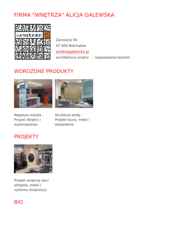 FIRMA "WNĘTRZA" ALICJA GALEWSKA Zamoście 94 97-400 Bełchatów wnetrzagalewska.pl architektura wnętrz WDROŻONE PRODUKTY Negatyw miasta Projekt Wnętrz i wykonawstwo PROJEKTY Projekt wnętrza sieci sklepów, mebli i systemu ekspozycji BIO Struktura wody Projekt biura, mebli i oświetlenia wyposażenie łazienki Firma Wnętrza powstała w 1997 roku z inicjatywy Alicji Galewskiej. Jesteśmy na rynku od 18 lat i ciągle się rozwijamy. W 2012 roku otworzyliśmy nowoczesne centrum wnętrz,do którego sprowadzamy materiały budowalne i aranżacyjne z całej Europy. Projektowanie to dla nas ciągłe poszukiwanie nowych form adaptacji przestrzeni w zetknięciu z konkretnym człowiekiem. To proces, nad którym czuwamy od pomysłu do jego realizacji. Wierząc, że to detale budują jakość nadzorujemy wykonanie naszych aranżacji.