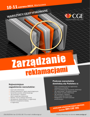 10-11 szawa r a W , 4 1 0 2 czer wca TY A T Z S R WA ANE W O K I F CERT Y e i n a z d ą z Zar i m a j c a reklam Najważniejsze zagadnienia warsztatów: • • • • Czym jest reklamacja Proces reklamacji w ujęciu psychologicznym Dynamika procesu reklamacyjnego Jak pracować z osobami, które rozpatrują reklamacje • Modele i formy obsługi reklamacji • Zarządzanie reklamacjami w organizacji • Element zarządzania wiedzą w organizacji Podczas warsztatów dowiedzą się Państwo o: • Czym charakteryzuje się organizacja nastawiona na klienta • Czym charakteryzuje się proces reklamacji • Jak wykorzystać i zarządzać wiedzą jaką niesie za sobą reklamacja • Jak pracować z osobami, które rozpatrują reklamacje • Reagowanie na trudne sytuacje prezentacyjne E T Y GRUPOW A B A R E JN Y ATRAKCY OFERUJEM 52 181 1 4 0 6 t: k ta n Ko ZGŁOSZENIA: fax 22 651 80 75 e-mail: [email protected] więcej informacji na stronie www.certge.pl 10-11 szawa r a W , 4 1 0 2 czer wca Z e i n a z arząd i m a j c lama rek Prelegent: Grzegorz Skrzypczak Cel warsztatów: Niewiele organizacji przywiązuje dostateczną wagę do budowania więzi z Klientem poprzez odpowiednią obsługę reklamacji. Celem zajęć jest przygotowanie uczestników do zbudowania i wdrożenia nowego modelu zarządzania reklamacjami. Każdy kontakt z Klientem jest formą komunikacji, zapewniającą cenne informacje, które mogą być wykorzystane do poprawy jakości usług firmy. Dlatego też podczas seminarium wskażemy Państwu jak skutecznie wykorzystywać i zarządzać reklamacjami – jednym z kluczowych narzędzi poprawiających jakość usług przedsiębiorstwa. W trakcie zajęć omówione zostaną poszczególne etapy obsługi Klienta, zależności pomiędzy Klientem a organizacją, zaprezentowane zostaną modele i formy obsługi reklamacji. W trakcie naszych warsztatów dowiedzą się Państwo również jak doskonalić swoje umiejętności menedżerskie – jak zarządzać i jak szkolić pracowników zaangażowanych do obsługi reklamacji. Zajęcia będą miały charakter warsztatowy. W trakcie ćwiczeń i studiów przypadku będą Państwo mieli możliwość skorzystania z praktycznych wskazówek trenera. – trener z ponad 15-letnim doświadczeniem zawodowym w strukturach handlowych dużych korporacji. Absolwent Uniwersytetu Wrocławskiego (prawo) oraz Szkoły Wyższej Psychologii Społecznej w Warszawie (studia podyplomowe). Pracę trenerską łączy z działalnością jako mediator – jest mediatorem z listy Ministra GiPS. Jako trener specjalizuje się w projektach szkoleniowo-doradczych z obszaru zarządzania relacjami, komunikacji, negocjacji i rozwiązywania konfliktów. Autor publikacji poświęconych negocjacjom i mediacjom dla prawników. Szkolenie zamknięte W przypadku zainteresowania tym szkoleniem większej liczby osób z Państwa organizacji z przyjemnością przygotujemy je dla Państwa w wersji szkolenia zamkniętego. Prosimy o kontakt z kierownikiem projektu Anną Milewską e-mail: [email protected] Serdecznie zapraszamy! Na zakończenie warsztatów każdy z uczestników otrzyma certyfikat uczestnictwa. Serdecznie zapraszamy do uczestnictwa. Z poważaniem, Anna Milewska KONTAKT/ZGŁOSZENIA Do uczestnictwa zapraszamy: • Menedżerów, specjalistów działów: reklamacji, zarządzania jakością, sprzedaży • osoby pracujące w Biurze Obsługi Klienta • osoby odpowiedzialne za zarzadzanie relacjami z klientami • wszystkich, zainteresowanych obsługą reklamacji oraz obsługą klienta. Anna Milewska Kierownik projektu e-mail: [email protected] tel: 604 152 181 fax: 22 651 80 75 ZGŁOSZENIA: fax 22 651 80 75 e-mail: [email protected] więcej informacji na stronie www.certge.pl 10-11 szawa r a W , 4 1 0 2 czer wca Z e i n a z arząd i m a j c lama rek PROGRAM DZIEŃ I 10 czerwca 2014 Czym jest reklamacja? • • • • Reklamacja a proces sprzedaży Reklamacja a proces obsługi Klienta Reklamacja z punktu widzenia Klienta Reklamacja z punktu widzenia Handlowca lub Opiekuna Klienta • Reklamacja z punktu widzenia firmy Proces reklamacji w ujęciu psychologicznym • Reklamacja jako sytuacja konfliktowa - Specyfika tych sytuacji konfliktowych - dynamika i przebieg • Charakterystyka podstawowych postaw w procesie reklamacji • Charakterystyka i analiza podstawowych potrzeb w procesie reklamacyjnym Dynamika procesu reklamacyjnego: • Etapy składania reklamacji - fazy procesu reklamacyjnego • Uczestnicy procesu reklamacyjnego • Role i funkcje oraz zadania uczestników procesu reklamacyjnego • Typy klientów składających reklamacje • Typowe błędy popełnianie przez firmy w procesie reklamacyjnym DZIEŃ II 11 czerwca 2014 Jak pracować z osobami, które rozpatrują reklamacje • Kluczowe kompetencje osób pracujących z reklamacjami • Odpowiedzialność menedżerska za jakość pracy działu obsługi Klienta zajmującego się reklamacjami • Jak rozwijać osoby zaangażowane do obsługi reklamacji? Modele i formy obsługi reklamacji • Analiza typowych modeli i form obsługi reklamacji: – Reklamacje osobiste – Reklamacje pisemne • Nieefektywne modele obsługi reklamacji • Trzy perspektywy efektywnych modeli obsługi reklamacji: – Perspektywa Klienta – Perspektywa organizacji – Perspektywa innych uczestników procesu reklamacyjnego Zarządzanie reklamacjami w organizacji • • • • Mapowanie procesów obsługi Klienta Mapowanie procesów obsługi reklamacji Podstawowe zasady zarządzania reklamacjami Kultura organizacyjna a zarządzanie reklamacjami Elementy zarządzania wiedzą w organizacji • Czym jest zarządzanie wiedzą w organizacji? • Jaką wiedzę może dostarczyć reklamacja? • Elementy zarządzania wiedzą płynącą z procesu reklamacji Ramowy rozkład zajęć: 9.00 Rozpoczęcie szkolenia 10.30 przerwa na kawę 12.30 – 13.30 Obiad 15.30 przerwa na kawę 17.00 Zakończenie szkolenia ZGŁOSZENIA: fax 22 651 80 75 e-mail: [email prote