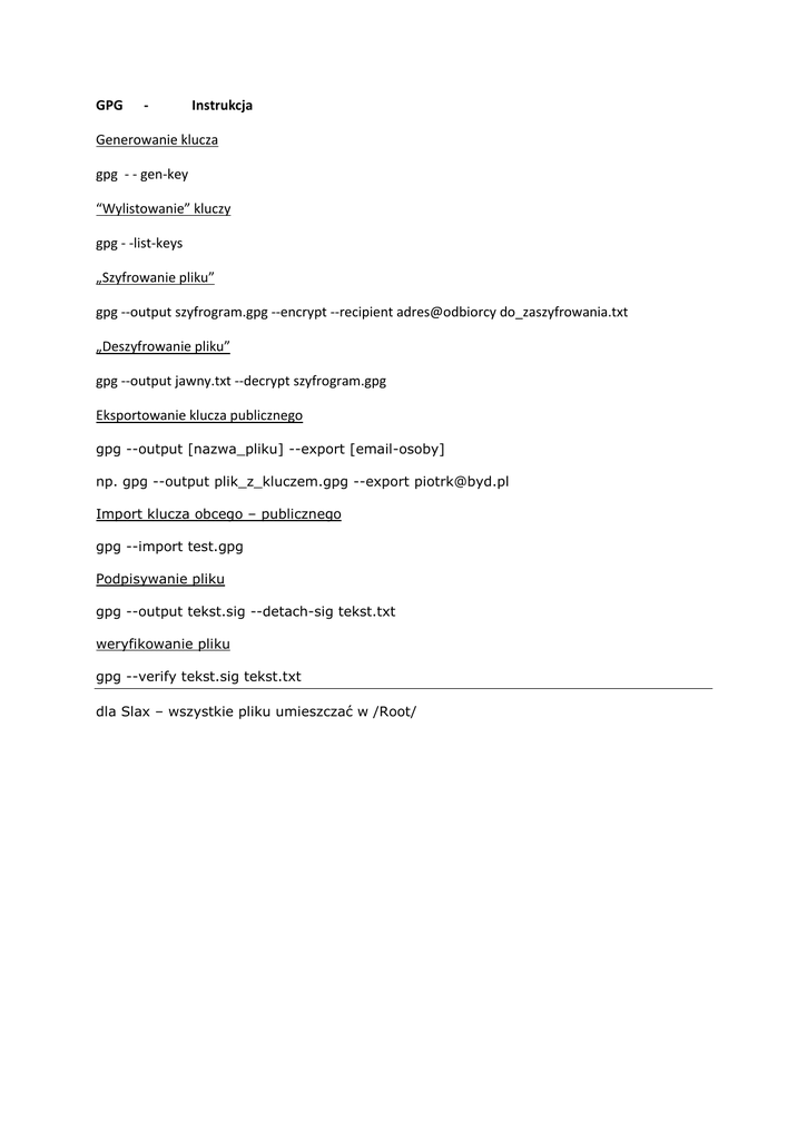 GPG - Instrukcja Generowanie klucza gpg - - gen-key “Wylistowanie” kluczy gpg - -list-keys „Szyfrowanie pliku” gpg --output szyfrogram.gpg --encrypt --recipient adres@odbiorcy do_zaszyfrowania.txt „Deszyfrowanie pliku” gpg --output jawny.txt --decrypt szyfrogram.gpg Eksportowanie klucza publicznego gpg --output [nazwa_pliku] --export [email-osoby] np. gpg --output plik_z_kluczem.gpg --export [email protected] Import klucza obcego – publicznego gpg --import test.gpg Podpisywanie pliku gpg --output tekst.sig --detach-sig tekst.txt weryfikowanie pliku gpg --verify tekst.sig tekst.txt dla Slax – wszystkie pliku umieszczać w /Root/
