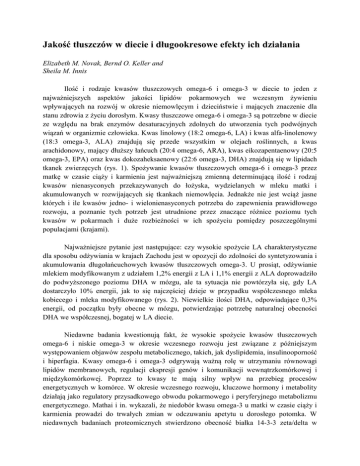 Jakość tłuszczów w diecie i długookresowe efekty ich działania Elizabeth M. Novak, Bernd O. Keller and Sheila M. Innis Ilość i rodzaje kwasów tłuszczowych omega-6 i omega-3 w diecie to jeden z najważniejszych aspektów jakości lipidów pokarmowych we wczesnym żywieniu wpływających na rozwój w okresie niemowlęcym i dzieciństwie i mających znaczenie dla stanu zdrowia z życiu dorosłym. Kwasy tłuszczowe omega-6 i omega-3 są potrzebne w diecie ze względu na brak enzymów desaturacyjnych zdolnych do utworzenia tych podwójnych wiązań w organizmie człowieka. Kwas linolowy (18:2 omega-6, LA) i kwas alfa-linolenowy (18:3 omega-3, ALA) znajdują się przede wszystkim w olejach roślinnych, a kwas arachidonowy, mający dłuższy łańcuch (20:4 omega-6, ARA), kwas eikozapentaenowy (20:5 omega-3, EPA) oraz kwas dokozaheksaenowy (22:6 omega-3, DHA) znajdują się w lipidach tkanek zwierzęcych (rys. 1). Spożywanie kwasów tłuszczowych omega-6 i omega-3 przez matkę w czasie ciąży i karmienia jest najważniejszą zmienną determinującą ilość i rodzaj kwasów nienasyconych przekazywanych do łożyska, wydzielanych w mleku matki i akumulowanych w rozwijających się tkankach niemowlęcia. Jednakże nie jest wciąż jasne których i ile kwasów jedno- i wielonienasyconych potrzeba do zapewnienia prawidłowego rozwoju, a poznanie tych potrzeb jest utrudnione przez znaczące różnice poziomu tych kwasów w pokarmach i duże rozbieżności w ich spożyciu pomiędzy poszczególnymi populacjami (krajami). Najważniejsze pytanie jest następujące: czy wysokie spożycie LA charakterystyczne dla sposobu odżywiania w krajach Zachodu jest w opozycji do zdolności do syntetyzowania i akumulowania długołańcuchowych kwasów tłuszczowych omega-3. U prosiąt, odżywianie mlekiem modyfikowanym z udziałem 1,2% energii z LA i 1,1% energii z ALA doprowadziło do podwyższonego poziomu DHA w mózgu, ale ta sytuacja nie powtórzyła się, gdy LA dostarczyło 10% energii, jak to się najczęściej dzieje w przypadku współczesnego mleka kobiecego i mleka modyfikowanego (rys. 2). Niewielkie ilości DHA, odpowiadające 0,3% energii, od początku były obecne w mózgu, potwierdzając potrzebę naturalnej obecności DHA we współczesnej, bogatej w LA diecie. Niedawne badania kwestionują fakt, że wysokie spożycie kwasów tłuszczowych omega-6 i niskie omega-3 w okresie wczesnego rozwoju jest związane z późniejszym występowaniem objawów zespołu metabolicznego, takich, jak dyslipidemia, insulinooporność i hiperfagia. Kwasy omega-6 i omega-3 odgrywają ważną rolę w utrzymaniu równowagi lipidów membranowych, regulacji ekspresji genów i komunikacji wewnątrzkomórkowej i międzykomórkowej. Poprzez to kwasy te mają silny wpływ na przebieg procesów energetycznych w komórce. W okresie wczesnego rozwoju, kluczowe hormony i metabolity działają jako regulatory przysadkowego obwodu pokarmowego i peryferyjnego metabolizmu energetycznego. Mathai i in. wykazali, że niedobór kwasu omega-3 u matki w czasie ciąży i karmienia prowadzi do trwałych zmian w odczuwaniu apetytu u dorosłego potomka. W niedawnych badaniach proteomicznych stwierdzono obecność białka 14-3-3 zeta/delta w mózgu płodu i noworodka. To białko jest z kolei receptorem działania insuliny, która odgrywa rolę w rozwoju neuronów w podwzgórzu zaangażowanym z regulację zachowań żywieniowych. Rysunek 1 Schemat głównych etapów desaturacji i elongacji egzogennych kwasów tłuszczowych przy podaży kwasów omega-6 i omega-3. W wątrobie kwasy tłuszczowe regulują ekspresję kluczowych genów lipogenicznych, lipolitycznych i glikolitycznych. W niedawnych badaniach wykazaliśmy, że wyższy poziom EPA i DHA w wątrobie noworodka jest związany ze zmienioną ekspresją genową enzymów regulujących metabolizm nie tylko kwasów tłuszczowych i glukozy, ale także aminokwasów. Wyniki naszych badań wskazują, że kwasy omega-3 są ważne, gdy w chwili narodzin następuje przestawienie metabolizmu i dostosowanie go do diety bogatej w mleko bogate w tłuszcze, poprzez zapewnienie odpowiedniego poziomu glukozy do jej bardzo ważnych funkcji, ochronę białek przez utlenianiem, zapobieganie lipotoksyczności dzięki przyspieszeniu utleniania kwasów tłuszczowych. Powinno się także zwrócić uwagę na fakt, iż istnieje możliwość, że działanie kwasów tłuszczowych omega-6 i omega-3 we wczesnych okresach życia wykracza poza rolę w rozwoju neurologicznym i fizycznym. Kwasy te wpływają także na metabolizm energetyczny, co ma implikacje w ryzyku wystąpienia zespółu metabolicznego w dorosłym życiu. Rysunek 2 DHA w fosfoglicerydzie etanoloaminy w mózgu, wątrobie i sercu u prosiąt karmionych mlekiem modyfikowanym. Bibliografia: 1. Innis SM: The developing brain and dietary omega-3 fatty acids; in Preedy VR (ed): Handbook of Diet, Nutrition and Behavior. Springer, New York, 2010, chapter 3.2. 2. Novak EM, Dyer RA, Innis SM: High dietary omega-6 fatty acids contribute to reduced docosahexaenoic acid in the developing brain and inhibit secondary neurite growth. Brain Res 2008;1237:136–145. 3. Mathai ML, Soueid M, Chen N, et al: Does perinatal omega-3 polyunsaturated fatty acid deficiency increase appetite signaling? Obes Res 2004;12:1886–1894. 4. Jump DB: N-3 polyunsaturated fatty acid regulation of hepatic gene transcription. Curr Opin Lipidol 2008;19:242–247. 5. Novak EM, Lee EK, Innis SM, et al: Identification of novel protein targets regulated by maternal dietary fatty acid composition in neonatal rat liver. Proteomics 2009;73:41–49.