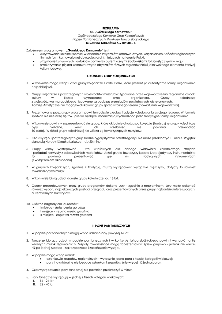 REGULAMIN 43. „Góralskiego Karnawału” Ogólnopolskiego Konkursu Grup Kolędniczych Popisu Par Tanecznych, Konkursu Tańca Zbójnickiego Bukowina Tatrzańska 5-7.02.2015 r. Założeniem programowym „Góralskiego Karnawału” jest: kultywowanie lokalnej tradycji w dziedzinie zwyczajów karnawałowych, kolędniczych, tańców regionalnych i innych form karnawałowej obyczajowości istniejących na terenie Polski; utrzymanie kulturowych kontaktów pomiędzy autentycznymi środowiskami folklorystycznymi w kraju; przekazywanie piękna karnawałowych obyczajów różnych regionów Polski jako ważnego elementu tradycji kultury ludowej. I. KONKURS GRUP KOLĘDNICZYCH 1. W konkursie mogą wziąć udział grupy kolędnicze z całej Polski, które prezentują autentyczne formy kolędowania na polskiej wsi. 2. Grupy kolędnicze z poszczególnych województw muszą być typowane przez wojewódzkie lub regionalne ośrodki kultury w liczbie wyznaczonej przez organizatora. Grupy kolędnicze z województwa małopolskiego typowane są podczas przeglądów powiatowych lub rejonowych. Komisje Artystyczne nie mogą kwalifikować grupy spoza własnego terenu (powiatu lub województwa). 3. Prezentowany przez grupy program powinien odzwierciedlać tradycje kolędowania swojego regionu. W formule spotkań nie mieszczą się tzw. jasełka będące inscenizacją wychodzącą poza tradycyjne formy kolędowania. 4. W konkursie powinny zaprezentować się grupy, które aktualnie chodzą po kolędzie (tradycyjne grupy kolędnicze były nieliczne, wiec ich liczebność nie powinna przekraczać 10 osób). W skład grupy kolędniczej nie wlicza się towarzyszących muzyków. 5. Czas występu poszczególnych grup będzie rygorystycznie przestrzegany i nie może przekroczyć 10 minut. Wyjątek stanowią Herody i Szopka Lalkowa – do 20 minut. 6. Grupy winny występować we właściwych dla danego widowiska kolędniczego strojach i posiadać rekwizyty z odpowiednich materiałów. Jeżeli grupie towarzyszy kapela lub pojedynczy instrumentalista to powinna prezentować grę na tradycyjnych instrumentach (z wyłączeniem akordeonu). 7. W grupach kolędniczych, zgodnie z tradycją, muszą występować wyłącznie mężczyźni, dotyczy to również towarzyszących muzyk. 8. W konkursie biorą udział dorosłe grupy kolędnicze, od 18 lat. 9. Oceny prezentowanych przez grupy programów dokona Jury - zgodnie z regulaminem. Jury może dokonać również wyboru najciekawszych postaci przeglądu oraz prezentowanych przez grupy najbardziej interesujących, autentycznych rekwizytów. 10. Główne nagrody dla laureatów: I miejsce - złota rozeta góralska II miejsce - srebrna rozeta góralska III miejsce - brązowa rozeta góralska II. POPIS PAR TANECZNYCH 1. W popisie par tanecznych mogą wziąć udział osoby powyżej 16 lat. 2. Tancerze biorący udział w popisie par tanecznych i w konkursie tańca zbójnickiego powinni wystąpić na tle własnych muzyk regionalnych. Zespoły towarzyszące mogą zaprezentować śpiew grupowy - jednak nie więcej niż po jednej zwrotce - na rozpoczęcie i zakończenie występu. 3. W popisie mogą wziąć udział: członkowie zespołów regionalnych – wyłącznie jedna para z każdej kategorii wiekowej; pary indywidualne nie będące członkami zespołów (nie więcej niż jedna para). 4. Czas występowania pary tanecznej nie powinien przekroczyć 6 minut. 5. Pary taneczne występują w jednej z trzech kategorii wiekowych: I. 16 - 21 lat II. 22 - 40 lat III. powyżej 40 lat Kategoria wiekowa pary jest zależna od wieku partnera. 6. W drugiej i trzeciej kategorii wiekowej od tancerzy oczekuje się wykonania co najmniej pięciu różnych kroków tanecznych. 7. Ocena Jury nastąpi według następujących kryteriów: stopień wydobycia charakterystycznej obyczajowości tanecznej kompozycja całości tańca wraz ze śpiewem i muzyką technika tańca strój regionalny ogólny wyraz artystyczny 8. Najlepsze pary taneczne otrzymają wyróżnienia i dyplomy. Wszystkie pary taneczne otrzymują pamiątkowe dyplomy uczestnictwa. Przewiduje się również wyróżnienia i dyplomy dla najlepszych tancerek. 9. Nie dopuszcza się występów poza konkursem; tancerz i tancerka nie w konkursie po raz drugi, w przeciwnym wypadku ich prezentacje nie będą sklasyfikowane. mogą wystąpić III. KONKURS TAŃCA ZBÓJNICKIEGO 1. Konkurs ma na celu pokazanie jednego z najbardziej reprezentatywnych tańców regionów góralskich i różnic w jego interpretacji, wynikłych z tradycji poszczególnych regionów. 2. W konkursie mogą wziąć udział zespoły w składzie nie większym niż 10 osób oraz muzyka do 5 osób. Wiek uczestników – powyżej 16 lat. 3. Członkowie zespołów powinni występować w tradycyjnych strojach swojego regionu, a nie w tzw. kostiumach zbójnickich (czapki zbójnickie, kolorowe koszule, wysokie buty „oficerki” itp.) 4. Właściciel ciupagi odpowiada za jej stan techniczny. Ewentualne szkody powstałe w czasie występu z użyciem ciupagi obciążają jej użytkownika. 5. Czas występu powinien wynosić nie więcej niż 12 minut. 6. Poszczególne prezentacje będzie oceniać Jury według kryteriów tańca solowego. 7. Zespoły sklasyfikowane na trzech pierwszych miejscach otrzymają jako nagrody ciupagi góralskie: I miejsce - ciupaga zbójnicka II miejsce - ciupaga bacowska III miejsce - ciupaga juhaska IV. INFORMACJE OGÓLNE 1. Udział grup kolędniczych, par tanecznych i grup tańca zbójnickiego należy zgłaszać do Bukowiańskie Centrum Kultury „Dom Ludowy” ul. Kościuszki 87 34- 530 Bukowina Tatrzańska Bliższe informacje uzyskać można: tel./ fax: 18 20 77 221 e-mail: [email protected] www.domludowy.pl 26.01.2015 r. na adres: 2. Koszty podróży uczestnikom „Góralskiego Karnawału” pokrywają instytucje delegujące lub uczestnicy we własnym zakresie. 3. Uczestnikom przeglądu ujętym w karcie zgłoszenia i występującym na scenie organizatorzy zapewniają jeden posi