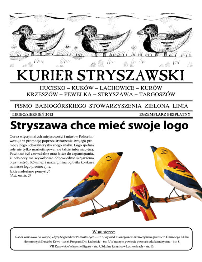 LIPIEC/SIERPIEŃ 2012 EGZEMPLARZ BEZPŁATNY Stryszawa chce mieć swoje logo Coraz więcej małych miejscowości i miast w Polsce inwestuje w promocję poprzez stworzenie swojego promocyjnego i charakterystycznego znaku. Logo spełnia rolę nie tylko marketingową, ale także informacyjną. Powinno być zauważalne oraz łatwe do zapamiętania. U odbiorcy ma wywoływać odpowiednie skojarzenia oraz nastrój. Również i nasza gmina ogłosiła konkurs na nasze logo promocyjne. Jakie nadesłano pomysły? (dok. na str. 2) W numerze: Nabór wniosków do kolejnej edycji Stypendiów Pomostowych – str. 5, wywiad z Grzegorzem Krawczykiem, prezesem Gminnego Klubu Honorowych Dawców Krwi – str. 6, Program Dni Lachowic – str. 7, W naszym powiecie powstaje szkoła muzyczna – str. 8, VII Kurowskie Warzenie Bigosu – str. 9, Szkolne igrzyska w Lachowicach – str. 10. TEMAT MIESIĄCA Stryszawa chce mieć swoje logo (dok. ze str. 1) Jak wiadomo znakiem charakterystycznym dla Stryszawy są drewniane ptaszki i właśnie ich nie zabrakło w projektach, które przygotowali studenci Akademii Sztuk Pięknych w Katowicach. Przy okazji podniesienia tak ważnego tematu dla społeczności lokalnej, jakim jest logotyp nie mogło zabraknąć zarówno głosów poparcia jak i dezaprobaty. Do tej pory najwięcej pozytywnych opinii zebrało logo „Stryszawa – Miejsce z tradycją” - Myślę, że propozycja druga jest najlepsza. Jest kolorowa, hasło pod obrazkiem jest chwytliwe, a klepok jest odzwierciedleniem tego, że Stryszawa z zabawek słynie. Gratulacje dla pomysłodawcy – wypowiedź jednego z mieszkańców Stryszawy. Również inni wyrażają pozytywy na temat pomysłu. Mieszkanka Stryszawy Dorota stwierdza: Według mnie najfajniejsze jest to zielone logo z hasłem „Stryszawa – radość mamy w naturze”, jest takie optymistyczne, a nasza gmina w ogóle jest takim zielonym regionem. Inna mieszkanka – Anna zauważa: „Spośród trzech zaprezentowanych prac jedynie środkowa propozycja wygląda dobrze (red. klepok). Najgorsza jest trzecia, to bardzo nieudany projekt - bażant? paw? kto to wie...” Tymczasem mieszkaniec Artur zauważył jedną ważną kwestię: Nic nie słyszałem o logotypach, trzeba to zbadać, ta akcja jest chyba jakoś mało rozpropagowana…” Postanowiliśmy sprawdzić gdzie można znaleźć informację o logu na nowej stronie internetowej gminy, prowadzonej przez nasz urząd. Na chwilę obecną, tj. w dniu zamknięcia numeru informację o logach można odnaleźć na odległej, trzeciej stronie aktualności, zawarta informacja nie posiada swoistego „wyróżnika”, który zachęcałby do zapoznania się z nią. Takie położenie sprawia, że zamieszczona informacja nie jest widoczna na bieżąco dla wszystkich, którzy wchodzą na stronę internetową. Pomimo to Urząd Gminy Stryszawa zachęca mieszkańców do zapoznania się z projektami log i zaprasza mieszkańców do przesyłania swoich uwag i sugestii, które pozwolą na wytypowanie najlepszego znaku charakterystycznego dla gminy. Głosy można przesyłać do Kierownika Referatu Promocji i Rozwoju Tomasza Boducha na adres e-mail: [email protected] Wytypowane logo stanie się oficjalnym symbolem gminy dopiero po zaakceptowaniu go przez Radę Gminy. Niestety nie mamy możliwości w gazecie zaprezentować pełnych wersjach kolorystycznych zaproponowanych logotypów, ale można je znaleźć na naszym portalu: www.kurierstryszawski.pl lub na wspomnianej stronie Urzędu Gminy: www.kurierstryszwski.com.pl Alicja Marszałek Kolejne boiska sportowe otwarte Budowa boiska do piłki ręcznej i kortu do tenisa na terenie Ośrodka Sportu i Rekreacji w Stryszawie dobiegła końca. Mieszkańcy mogą już w pełni próbować swoich sił na nowo powstałych obiektach. Korzystać z boisk można już od 27 lipca. Są one ogólnodostępne i bezpłatne, czynne w sezonie letnim codziennie w godz. 8.00 – 21.00 a w sezonie Boisko na którym gra młodzież z Huciska i Pewelki Profesjonalny kort do tenisa ziemnego w Stryszawie zimowym codziennie w godz. 8.00 – 19.00. Jeżeli chodzi o prace inwestycyjne, w tym przypadku o drogę dojazdową do Centrum Sportu, to będzie ona poszerzana i ukończona dopiero po zakończeniu całej inwestycji. Na dzień dzisiejszy nie wiemy kiedy to nastąpi, ponieważ staramy się jeszcze o wybudowanie jednego boiska do gry w kosza - poinformował nas kierownik Referatu Promocji i Rozwoju UG Stryszawa. Sport jest dziedziną życia społeczeństwa, którą trzeba zorganizować, zagospodarować i wspierać. Sport uczy istotnych wartości i umiejętności ży- 2 ciowych: pewności siebie, pracy w zespole, poczucia wspólnoty, dyscypliny, szacunku i zasad fair play. Stryszawa rozbudowuje swoją ofertę rekreacyjną z coraz lepszym skutkiem. Nigdzie w okolicy nie znajdziemy kortu tenisowego, poza obiektami płatnymi w większych miastach. A przecież tenis, dzięki niedawnym sukcesom Agnieszki Radwańskiej zyskuje coraz więcej zwolenników, zatem chyba czas zacząć szukać nowych talentów w naszej gminie. Przypominamy wartość projektu to: 575 275,69 zł, przy wkładzie własnym Gminy: 280 275,69 zł. Pozostałe boiska w gminie będą musiały jednak poczekać na swój czas. Sołtys Pewelki Andrzej Szczerba przyznał, że te mniejsze obiekty nie są traktowane z należytą uwagą. – Na naszym boisku nie są planowane żadne inwestycje w najbliższym czasie. Spełniają one jednak swoją podstawową rolę, czyli miejsca treningu zwłaszcza dla tych najmłodszych. Alicja Marszałek CO W GMINIE PISZCZY! W skrócie… Nowe place zabaw i boiska sportowe w naszej gminie Od 1 czerwca nasza gmina wzbogaciła się o kolejne, nowe place zabaw. Nowe miejsca dla naszych najmłodszych mieszkańców powstały przy Szkole Podstawowej w Kukowie, w Pewelce i w Kurowie oraz przy Przedszkolu Samorządowym w Krzeszowie i Lachowicach. Korzystanie z nowych i powstałych już placów zabaw jest ogólnodostępne, i bezpłatne dla