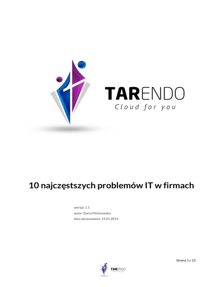 10 najczęstszych problemów IT w firmach wersja: 1.1 autor: Daria Michnowska data opracowania: 15.01.2014 Strona 1 z 13 Spis treści Spis treści Wstęp 1. Problemy z komunikacją między pracownikami 2. Niebezpieczeństwo utraty danych 3. Drogie oprogramowanie oraz sprzęt 4. Problem z pracą nad jednym dokumentem - konflikt wersji 5. Problem z mobilnością - przegrywanie danych na pendrivy i płyty w przypadku np. podróży służbowych 6. Cyberataki 7. Zarządzanie zagospodarowaniem zasobów firmy 8. Spam oraz bałagan w wiadomościach e-mail 9. Problemy z przesyłaniem zbyt dużych załączników 10. Negatywny wpływ komputerów na środowisko Dlaczego warto wdrażać rozwiązania chmurowe z naszą firmą, a nie samodzielnie? Strona 2 z 13 Wstęp Znana firma analityczna Forrester postanowiła zbadać koszt wdrożeń usług pocztowych i komunikacyjnych w przedsiębiorstwach. Wzięto pod uwagę zarówno systemy bazujące na chmurach – np. Google Apps czy Yahoo! Zimbra jak i rozwiązania bardziej konwencjonalne, np. serwery Exchange Microsoftu. Okazuje się, że w wypadku firm, które zatrudniają mniej niż 15 000 pracowników, wdrażanie własnego systemu poczty nie ma sensu, jest o wiele kosztowniejsze niż poczta hostowana w chmurze. Co więcej, z badań opublikowanych w raporcie pt. „Should Your Email Live in the Cloud? A Comparative Cost Analysis” (Czy Twój E-mail powinien żyć w chmurze? Analiza porównawcza kosztów) wynika, że Google Apps jest obecnie najtańszym rozwiązaniem, zarówno w kategorii rozwiązań na miejscu, jak i hostowanych w chmurze. Jednak mimo tej różnicy w cenach, większość firm nie śpieszy się do całkowitego przejścia na chmurę – aż 56% respondentów stwierdziło, że zamierza korzystać z modelu hybrydowego, połączenia usług e-mailowych świadczonych na miejscu jak i zewnętrznych. 28% chce przekazać swoje wewnętrzne systemy poczty całkowicie w outsourcing, 22% pozostać przy własnych serwerach, ale przenieść je do niezależnego centrum danych, 19% przenieść się całkowicie do zewnętrznego dostawcy poczty, zaś jedynie 14% chce wciąż samodzielnie utrzymywać swoją infrastrukturę. Jeśli jednak chodzi o tych, którzy zainteresowani są przejściem na zewnętrzną pocztę, to większość z nich wybierze raczej pakiet Google Apps niż Microsoft Exchange Online. Mimo że ten ostatni jest jakieś 10% tańszy od porównywalnych rozwiązań pozostałych dostawców chmur, to jednak wciąż nie może konkurować z Google. Samo badanie zostało przeprowadzone na próbie 2444 osób podejmujących najważniejsze decyzje w działach IT. Byli to ludzie ze Stanów Zjednoczonych, Francji, Kanady, Niemiec i Zjednoczonego Królestwa. Strona 3 z 13 1. Problemy z komunikacją między pracownikami Wraz z rozwojem firm a w ślad za nimi ich systemów informacyjnych stale przyrasta liczba dokumentów stanowiących zasoby danych. Niejednokrotnie zwiększa się także liczba zespołów ludzkich, które dane przetwarzają. Rozrastanie się firmy jakkolwiek jest zjawiskiem pożądanym tak w przypadku zarządzania informacją zwykle związane jest ze spadkiem efektywności jej przetwarzania, szybkością przesyłania oraz problemami w koordynacji działań podczas gromadzenia danych. Dzięki Aplikacjom Google dla Firm komunikacja z klientami oraz współpracownikami jest o wiele prostsza, szybsza i bardziej wygodna. Połączenie poczty z czatem eliminuje konieczność instalowania w firmie dodatkowych komunikatorów do szybkiego kontaktu między pracownikami. Czat podobnie jak sama poczta jest dostępny na każdym urządzeniu z podłączeniem internetowym Dzięki platformom chmurowym możliwie jest kontaktowanie się z klientami i współpracownikami metodą online, także poprzez Google Hangouts, czyli wideokonferencje, których zaletą jest fakt, że możemy za darmo łączyć się nawet z 25 osobami jednocześnie, z możliwością wyświetlania nie tylko obrazu z kamery, ale także udostępniając swój pulpit, dzięki czemu nasi rozmówcy mogą widzieć na żywo na przykład przygotowaną przez nas prezentację. Dzięki powyższym rozwiązaniom następuje optymalizacja wydatków na podróże służbowe, a także zmiana modelu wymiany dokumentów w firmie przejście od segregatorów do dokumentacji elektronicznej. Badania Frost & Sullivan pokazują, że firmy, które zainwestowały w rozwiązania chmurowe charakteryzują się lepszą współpracą pomiędzy pracownikami, co spowodowało zwrot 400% z inwestycji [por. LINK]. Dla przykładu Firma AutoGuard zdecydowała się na wdrożenie systemu w modelu chmurowym - system wspierający komunikację wewnętrzną i zewnętrzną. Dzięki niemu udało się m.in. obniżyć koszty rozmów wychodzących z firmy o ok. 30%. Strona 4 z 13 2. Niebezpieczeństwo utraty danych Powodem, dla którego firmy mogą decydować się na wybór usług bezpieczeństwa w modelu cloud computing jest elastyczność. Przykład stanowi ochrona antywirusowa, zarządzanie tożsamością i stosowanie systemów pojedynczego uwierzytelnienia. Według Gartnera, rynek usług bezpieczeństwa oferowanych w modelu chmury wzrośnie od 1,9 mld USD w roku 2012 do 4,2 mld w ciągu czterech lat, przy średniorocznej stopie wzrostu rzędu 23%. Dotąd najważniejsze dla firmy informacje umieszczało się zarówno na komputerach, jak i na wielu innych nośnikach danych, takich jak płyty CD czy pendrive’y. Takie rozwiązanie nie jest ani wygodne, ani bezpieczne. Według statystyk aż 60% danych gromadzonych na firmowych laptopach nie jest zabezpieczona, a 66% pendrive’ów rocznie jest gubiona albo ulega zniszczeniu. Co więcej, w ciągu roku jeden na dziesięć laptopów ginie w wyniku kradzieży. Daje to liczbę nawet 2 mln skradzionych laptopów rocznie. Nasze dane w chmurze są bezpieczne ze względu na to, że standardowo, główne przyczyny utraty danych w firmie to błąd człowieka, awaria sprzętu lub działanie wirusów. Te 