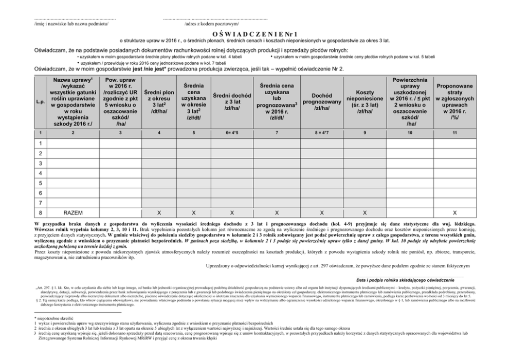 ............................................................ ............................................................................. /imię i nazwisko lub nazwa podmiotu/ /adres z kodem pocztowym/ O Ś W I A D C Z E N I E Nr 1 o strukturze upraw w 2016 r., o średnich plonach, średnich cenach i kosztach nieponiesionych w gospodarstwie za okres 3 lat. Oświadczam, że na podstawie posiadanych dokumentów rachunkowości rolnej dotyczących produkcji i sprzedaży płodów rolnych: • uzyskałem w moim gospodarstwie średnie plony płodów rolnych podane w kol. 4 tabeli • uzyskałem w moim gospodarstwie średnie ceny płodów rolnych podane w kol. 5 tabeli • uzyskałem / przewiduję w roku 2016 ceny jednostkowe podane w kol. 7 tabeli Oświadczam, że w moim gospodarstwie jest /nie jest* prowadzona produkcja zwierzęca, jeśli tak – wypełnić oświadczenie Nr 2. Nazwa uprawy1 /wykazać wszystkie gatunki roślin uprawiane L.p. w gospodarstwie w roku wystąpienia szkody 2016 r./ 1 2 Pow. upraw w 2016 r. /rozliczyć UR zgodnie z pkt 5 wniosku o oszacowanie szkód/ /ha/ Średni plon z okresu 3 lat2 /dt/ha/ Średnia cena uzyskana w okresie 3 lat2 /zł/dt/ 3 4 5 6= 4*5 7 8 = 4*7 9 X X X X X X Średnia cena uzyskana Koszty Średni dochód Dochód lub nieponiesione z 3 lat prognozowany (śr. z 3 lat) prognozowana3 /zł/ha/ /zł/ha/ /zł/ha/ w 2016 r. /zł/dt/ Powierzchnia uprawy uszkodzonej w 2016 r. / ≤ pkt 2 wniosku o oszacowanie szkód/ /ha/ Proponowane straty w zgłoszonych uprawach w 2016 r. /%/ 10 11 1 2 3 4 5 6 7 8 RAZEM X W przypadku braku danych z gospodarstwa do wyliczenia wysokości średniego dochodu z 3 lat i prognozowanego dochodu (kol. 4-9) przyjmuje się dane statystyczne dla woj. łódzkiego. Wówczas rolnik wypełnia kolumny 2, 3, 10 i 11. Brak wypełnienia pozostałych kolumn jest równoznaczne ze zgodą na wyliczenie średniego i prognozowanego dochodu oraz kosztów nieponiesionych przez komisję, z przyjęciem danych statystycznych. W gminie właściwej do położenia siedziby gospodarstwa w kolumnie 2 i 3 rolnik zobowiązany jest podać powierzchnię upraw z całego gospodarstwa, z terenu wszystkich gmin, wyliczoną zgodnie z wnioskiem o przyznanie płatności bezpośrednich. W gminach poza siedzibą, w kolumnie 2 i 3 podaje się powierzchnię upraw tylko z danej gminy. W kol. 10 podaje się odrębnie powierzchnię uszkodzoną położoną na terenie każdej z gmin. Przez koszty nieponiesione z powodu niekorzystnych zjawisk atmosferycznych należy rozumieć oszczędności na kosztach produkcji, których z powodu wystąpienia szkody rolnik nie poniósł, np. zbiorze, transporcie, magazynowaniu, nie zatrudnieniu pracowników itp. Uprzedzony o odpowiedzialności karnej wynikającej z art. 297 oświadczam, że powyższe dane podałem zgodnie ze stanem faktycznym …….................................................................................................................................................................................................................................... Data i podpis rolnika składającego oświadczenie „Art. 297. § 1. kk. Kto, w celu uzyskania dla siebie lub kogo innego, od banku lub jednostki organizacyjnej prowadzącej podobną działalność gospodarczą na podstawie ustawy albo od organu lub instytucji dysponujących środkami publicznymi – kredytu, pożyczki pieniężnej, poręczenia, gwarancji, akredytywy, dotacji, subwencji, potwierdzenia przez bank zobowiązania wynikającego z poręczenia lub z gwarancji lub podobnego świadczenia pieniężnego na określony cel gospodarczy, elektronicznego instrumentu płatniczego lub zamówienia publicznego, przedkłada podrobiony, przerobiony, poświadczający nieprawdę albo nierzetelny dokument albo nierzetelne, pisemne oświadczenie dotyczące okoliczności o istotnym znaczeniu dla uzyskania wymienionego wsparcia finansowego, instrumentu płatniczego lub zamówienia, podlega karze pozbawienia wolności od 3 miesięcy do lat 5. § 2. Tej samej karze podlega, kto wbrew ciążącemu obowiązkowi, nie powiadamia właściwego podmiotu o powstaniu sytuacji mogącej mieć wpływ na wstrzymanie albo ograniczenie wysokości udzielonego wsparcia finansowego, określonego w § 1, lub zamówienia publicznego albo na możliwość dalszego korzystania z elektronicznego instrumentu płatniczego. * niepotrzebne skreślić 1 wykaz i powierzchnia upraw wg rzeczywistego stanu użytkowania, wyliczona zgodnie z wnioskiem o przyznanie płatności bezpośrednich 2 średnia z okresu ubiegłych 3 lat lub średnia z 3 lat oparta na okresie 5 ubiegłych lat z wyłączeniem wartości najwyższej i najniższej. Wartości średnie ustala się dla tego samego okresu 3 średnią cenę uzyskaną wpisuje się, jeżeli dokonano sprzedaży przed datą szacowania, cenę prognozowaną wpisuje się z umów kontraktacyjnych, w pozostałych przypadkach należy korzystać z danych statystycznych opracowanych dla województwa lub Zintegrowanego Systemu Rolniczej Informacji Rynkowej MRiRW i przyjąć cenę z okresu trwania klęski