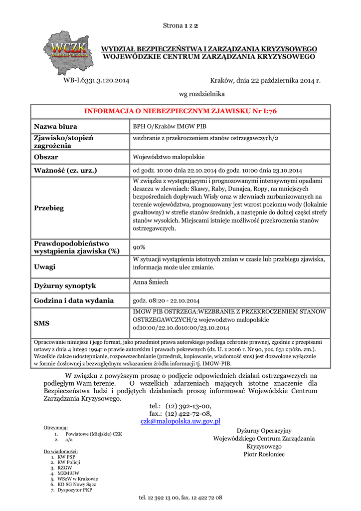 Strona 1 z 2 WYDZIAŁ BEZPIECZEŃSTWA I ZARZĄDZANIA KRYZYSOWEGO WOJEWÓDZKIE CENTRUM ZARZĄDZANIA KRYZYSOWEGO Kraków, dnia 22 października 2014 r. WB-I.6331.3.120.2014 wg rozdzielnika INFORMACJA O NIEBEZPIECZNYM ZJAWISKU Nr I:76 Nazwa biura BPH O/Kraków IMGW PIB Zjawisko/stopień zagrożenia wezbranie z przekroczeniem stanów ostrzegawczych/2 Obszar Województwo małopolskie Ważność (cz. urz.) od godz. 10:00 dnia 22.10.2014 do godz. 10:00 dnia 23.10.2014 Przebieg Prawdopodobieństwo wystąpienia zjawiska (%) Uwagi Dyżurny synoptyk Godzina i data wydania SMS W związku z występującymi i prognozowanymi intensywnymi opadami deszczu w zlewniach: Skawy, Raby, Dunajca, Ropy, na mniejszych bezpośrednich dopływach Wisły oraz w zlewniach zurbanizowanych na terenie województwa, prognozowany jest wzrost poziomu wody (lokalnie gwałtowny) w strefie stanów średnich, a następnie do dolnej części strefy stanów wysokich. Miejscami istnieje możliwość przekroczenia stanów ostrzegawczych. 90% W sytuacji wystąpienia istotnych zmian w czasie lub przebiegu zjawiska, informacja może ulec zmianie. Anna Śmiech godz. 08:20 - 22.10.2014 IMGW PIB OSTRZEGA:WEZBRANIE Z PRZEKROCZENIEM STANOW OSTRZEGAWCZYCH/2 wojewodztwo malopolskie od10:00/22.10.do10:00/23.10.2014 Opracowanie niniejsze i jego format, jako przedmiot prawa autorskiego podlega ochronie prawnej, zgodnie z przepisami ustawy z dnia 4 lutego 1994r o prawie autorskim i prawach pokrewnych (dz. U. z 2006 r. Nr 90, poz. 631 z późn. zm.). Wszelkie dalsze udostępnianie, rozpowszechnianie (przedruk, kopiowanie, wiadomość sms) jest dozwolone wyłącznie w formie dosłownej z bezwzględnym wskazaniem źródła informacji tj. IMGW-PIB. W związku z powyższym proszę o podjęcie odpowiednich działań ostrzegawczych na podległym Wam terenie. O wszelkich zdarzeniach mających istotne znaczenie dla Bezpieczeństwa ludzi i podjętych działaniach proszę informować Wojewódzkie Centrum Zarządzania Kryzysowego. tel.: (12) 392-13-00, fax.: (12) 422-72-08, [email protected] Otrzymują: 1. Powiatowe (Miejskie) CZK 2. a/a Do wiadomości: 1. KW PSP 2. KW Policji 3. RZGW 4. MZMiUW 5. WSzW w Krakowie 6. KO SG Nowy Sącz 7. Dyspozytor PKP Dyżurny Operacyjny Wojewódzkiego Centrum Zarządzania Kryzysowego Piotr Rosłoniec tel. 12 392 13 00, fax. 12 422 72 08 Strona 2 z 2 8. 9. 10. 11. 12. 13. 14. Zakłady Energetyczne GDDKiA ZDW WSSE Kraków WINB Kraków Urząd Żeglugi Śródlądowej w Krakowie a/a tel. 12 392 13 00, fax. 12 422 72 08
