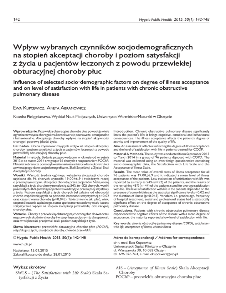 142 Hygeia Public Health 2015, 50(1): 142-148 Wpływ wybranych czynników socjodemograficznych na stopień akceptacji choroby i poziom satysfakcji z życia u pacjentów leczonych z powodu przewlekłej obturacyjnej choroby płuc Influence of selected socio-demographic factors on degree of illness acceptance and on level of satisfaction with life in patients with chronic obstructive pulmonary disease Ewa Kupcewicz, Aneta Abramowicz Katedra Pielęgniarstwa, Wydział Nauk Medycznych, Uniwersytet Warmińsko-Mazurski w Olsztynie Wprowadzenie. Przewlekła obturacyjna choroba płuc powoduje wiele ograniczeń w życiu chorego i ma konsekwencje poznawcze, emocjonalne i behawioralne. Akceptacja choroby wpływa na stopień aktywności chorego i poprawę jakości życia. Cel badań. Ocena czynników mających wpływ na stopień akceptacji choroby i poziom satysfakcji z życia u pacjentów leczonych z powodu przewlekłej obturacyjnej choroby płuc. Materiał i metody. Badania przeprowadzono w okresie od września 2013 r. do marca 2014 r. w grupie 96 chorych z rozpoznaniem POChP. Materiał zebrano za pomocą kwestionariusza ankiety własnej konstrukcji zawierającego dane socjodemograficzne, Skali Satysfakcji z Życia i Skali Akceptacji Choroby. Wyniki. Wartość średnia ogólnego wskaźnika akceptacji choroby uzyskana dla 96 chorych wynosiła 19,00±6,9 i świadczyła raczej o przeciętnym stopniu akceptacji choroby przez pacjentów. Niską oceną satysfakcji z życia charakteryzowało się aż 54% (n=52) chorych, wyniki pozostałych 46% (n=44) pacjentów świadczyły o przeciętnej satysfakcji z życia. Poziom satysfakcji z życia chorych był zależny od obecności chorób współistniejących na poziomie istotności statystycznej p=0,02 oraz czasu trwania choroby (p=0,045). Takie zmienne jak: płeć, wiek, częstość leczenia szpitalnego, status społeczno-zawodowy miały istotny statystycznie wpływ na stopień akceptacji przewlekłej obturacyjnej choroby płuc. Wnioski. Chorzy z przewlekłą obturacyjną chorobą płuc doświadczali negatywnych skutków choroby i w stopniu przeciętnym je akceptowali, oraz w większości przejawiali niski poziom satysfakcji z życia. Słowa kluczowe: przewlekła obturacyjna choroba płuc (POChP), satysfakcja z życia, akceptacja choroby, choroba przewlekła Introduction. Chronic obstructive pulmonary disease significantly limits the patient’s life; it brings cognitive, emotional and behavioural consequences. The illness acceptance affects the patient’s degree of activity and improvement of the quality of life. Aim. An assessment of factors affecting the degree of illness acceptance and the level of satisfaction with life in patients treated for CODP. Material & Methods. The study was conducted from September 2013 to March 2014 in a group of 96 patients dignosed with COPD. The material was collected using an own-design questionnaire containing socio-demographic data, the Satisfaction with Life Scale and the Acceptance of Illness Scale. Results. The mean value of overall rates of illness acceptance for all 96 patients was 19.00±6.9 and it indicated a mean level of illness acceptance of the patients. Low evaluation of satisfaction with life was reported by as many as 54% (n=52) of the patients, and the results of the remaining 46% (n=44) of the patients stand for average satisfaction with life. The level of satisfaction with life in the patients depended on the presence of comorbidities at the statistical significance level p=0.02 and the duration of illness (p=0.045). Variables, i.e. gender, age, frequency of hospital treatment, social and professional status had a statistically significant effect on the degree of acceptance of chronic obstructive pulmonary disease. Conclusions. Patients with chronic obstructive pulmonary disease experienced the negative effects of the disease with a mean degree of acceptance; the majority reported a low level of satisfaction with life. Key words: chronic obstructive pulmonary disease (COPD), satisfaction with life, acceptance of illness, chronic illness © Hygeia Public Health 2015, 50(1): 142-148 Adres do korespondencji / Address for correspondence www.h-ph.pl dr n. med. Ewa Kupcewicz Uniwersytecki Szpital Kliniczny w Olsztynie ul. Warszawska 30, 10-082 Olsztyn tel. 696 076 764, e-mail: [email protected] Nadesłano: 15.01.2015 Zakwalifikowano do druku: 28.01.2015 Wykaz skrótów SWLS – (The Satisfaction with Life Scale) Skala Satysfakcji z Życia AIS – (Acceptance of Illness Scale) Skala Akceptacji Choroby POChP – przewlekła obturacyjna choroba płuc Kupcewicz E, Abramowicz A. Wpływ wybranych czynników socjodemograficznych na stopień akceptacji choroby ... HRQOL – (Heath Related Quality of Life) jakość życia uwarunkowana stanem zdrowia WHO – (World Health Organization) Światowa Organizacja Zdrowia Wprowadzenie Jak podaje Jassem ,,Polskie Towarzystwo Chorób Płuc definiuje przewlekłą obturacyjną chorobę płuc (POChP) jako powszechnie występującą przewlekłą chorobę poddającą się profilaktyce i leczeniu. Cechuje się ona utrwalonym ograniczeniem przepływu powietrza przez dolne drogi oddechowe, które zazwyczaj postępuje i jest związane z nadmierną reakcją zapalną w oskrzelach i płucach w odpowiedzi na szkodliwe działanie gazów i pyłów, w Polsce najczęściej dymu tytoniowego. Zaostrzenia i obecność chorób współistniejących wpływają na przebieg POChP u poszczególnych chorych” [1, 2]. Jest jedną z najczęściej występujących chorób na świecie i jedną z najważniejszych chorób społecznych [3]. W krajach Unii Europejskiej POChP występuje u około 15% populacji powyżej 40 r.ż., przy czym stopnie II–IV dotyczą 8,8% ogółu mieszkańców [1, 4]. Odpowiada za znaczną chorobowość oraz przyczynia się do pogorszenia satysfakcji/jakości życia chorych i ich najbliższych [3, 5]. Pojawienie się choroby powoduje w życiu jednostki i rodziny poważny kryzys, wymaga pr