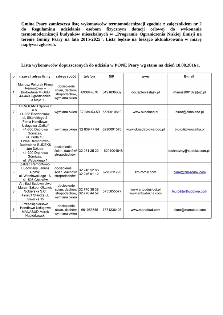 Gmina Psary zamieszcza listę wykonawców termomodernizacji zgodnie z załącznikiem nr 2 do Regulaminu udzielania osobom fizycznym dotacji celowej do wykonania termomodernizacji budynków mieszkalnych w „Programie Ograniczenia Niskiej Emisji na terenie Gminy Psary na lata 2015-2025”. Lista będzie na bieżąco aktualizowana w miarę napływu zgłoszeń. Lista wykonawców dopuszczonych do udziału w PONE Psary wg stanu na dzień 18.08.2016 r. lp 1 2 3 4 5 6 7 nazwa i adres firmy zakres robót Mariusz Półtorak Firma docieplenie Remontowo – ścian, dachów/ Budowlana M-BUD stropodachów, 43-440 Ogrodzieniec wymiana okien ul. 3 Maja 1 OKNOLAND Spółka z o.o. 41-922 Radzionków, ul. Sikorskiego 2 Firma HandlowoUsługowa „Całka” 41-300 Dąbrowa Górnicza, ul. Perla 10 Firma RemontowoBudowlana BUDEKS Jan Dziuba 41-300 Dąbrowa Górnicza, ul. Wybickiego 1 Zakład RemontowoBudowlany Janusz Romik ul. Wieniawskiego 16, 41-506 Chorzów Art-Bud Budownictwo Marcin Szkop, Oktawia Sobierska S.C. 42-261 Starcza ul. Gliwicka 15 Przedsiębiorstwo Handlowo Usługowe MANABUD Marek Napiórkowski telefon NIP www E-mail 693847670 6491836632 dociepleniaśląsk.pl [email protected] www.oknoland.pl [email protected] www.oknadabrowa.boo.pl [email protected] wymiana okien 32 289-53-59 6530010819 wymiana okien 32 639 47 84 docieplenie ścian, dachów/ 32 261 25 22 stropodachów 6290001576 6291004648 [email protected] docieplenie 32 246 52 86 ścian, dachów/ 32 246 61 12 stropodachów 6270011293 zrb-romik.com [email protected] docieplenie ścian, dachów/ 32 770 38 38 stropodachów, 32 770 44 57 wymiana okien 5735855577 www.artbuduslugi.pl www.artbudokna.com [email protected] docieplenie ścian, dachów, wymiana okien 7571236403 www.manabud.com [email protected] 661053755