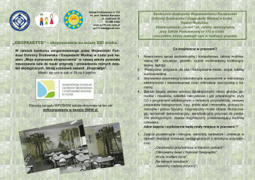 Szkoła Podstawowa nr 172 im. prof. Stefana Banacha ul. Jaskrowa 15 91-480 Łódź www.sp172.edu.lodz.pl [email protected] Serdecznie dziękujemy Wojewódzkiemu Funduszowi Ochrony Środowiska i Gospodarki Wodnej w Łodzi, Radzie Rodziców, Stowarzyszeniu „Uczeń” im. Janiny Jaszczyńskiej przy Szkole Podstawowej nr 172 w Łodzi i wszystkim, którzy pomogli nam w realizacji projektu. „EKOPRAKTYK” – ekopracownia na miarę XXI wieku. W ramach konkursu zorganizowanego przez Wojewódzki Fundusz Ochrony Środowiska i Gospodarki Wodnej w Łodzi pod hasłem „Moja wymarzona ekopracownia” w naszej szkole powstała nowoczesna sala do nauki przyrody i prowadzenia różnych działań ekologicznych, której uczniowie nazwali „Ekopraktyk”. Mieści się ona w sali nr 25 na II piętrze. Decyzją zarządu WFOŚiGW szkoła otrzymała na ten cel dofinansowanie w kwocie 39000 zł. Co znajdziecie w pracowni? Nowoczesny sprzęt audiowizualny i komputerowy: tablicę multimedialną 88’’, wizualizer, głośniki, rzutnik multimedialny krótkoogniskowy, laptop). 2. Praktyczne, przyjazne dla oka i funkcjonalne meble, stojak, tablicę suchościeralną. 3. Stanowiska obserwacyjno-laboratoryjne wyposażone w mikroskopy elektroniczne i stereoskopowe (oraz mikroskop nauczyciela z kamerą). 4. Bardzo bogaty zestaw pomocy dydaktycznych: okazy glonów, porostów i mszaków, szkiełka nakrywkowe i igły preparacyjne, płyty CD z programami edukacyjnymi o tematyce przyrodniczej, zestawy preparatów biologicznych, lupy, próbki skał i minerałów, globusy indukcyjne i globus fizyczny, magnetyczny model Układu Słonecznego, termometr demonstracyjny, wielofunkcyjny przyrząd do pomiarów ekologicznych, zestaw magnetyczny przedstawiający budowę człowieka. Jakie zajęcia i wydarzenia będą miały miejsce w pracowni:? 1. 1. Zajęcia pozalekcyjne i lekcyjne, warsztaty badawcze i prelekcje w ramach realizacji innowacji pedagogicznych o tematyce przyrodniczej: „Osobliwości przyrodnicze w łódzkich parkach”; „Odkrywamy świat z National Geographic”; „Woda źródłem życia”; „Na leśnych ścieżkach”; „Jesteśmy częścią przyrody”; 2. 3. 4. 5. 6. 7. 8. 9. Zajęcia koła przyrodniczego; Pokazy talentów uczniowskich. Szkolenia i panele dyskusyjne nauczycieli. Zajęcia przygotowujące uczniów kl. VI do sprawdzianu, w tym zajęcia odbywane w ramach projektu finansowanego ze środków UE „Czytać, liczyć, poznać świat – znów z nauką za pan brat”. Inscenizacje, wystawy i ekspozycje prac uczniów. Zajęcia świetlicy szkolnej o tematyce ekologicznej. Zajęcia języka angielskiego o tematyce przyrodniczoekologicznej. Zajęcia przyrody, matematyki i języka polskiego z wykorzystaniem zasobów ekopracowni. Jakie konkursy i akcje edukacyjne zorganizujemy w pracowni? Lp. Termin realizacji 1 wrzesień 2 październik 3 4 5 6 7 8 9 listopad grudzień styczeń luty marzec kwiecień maj 10 czerwiec 1 2 Termin realizacji grudzień marzec 3 czerwiec Lp. Akcje edukacyjne i innowacje przyrodniczo-ekologiczne Osobliwości przyrodnicze łódzkich parków. Sprzątamy świat. Pełna miska dla schroniska i podusia dla Pimpusia. Zbieramy makulaturę – oszczędzamy lasy! Dokarmiamy skrzydlatych przyjaciół. Śmieci segregowanie to jest nasze powołanie. Woda źródłem życia. Odkrywamy świat z National Geographic. Obchody Dnia Ziemi. Odżywiam się zdrowo, więc jem kolorowo. Cudze chwalicie … – wycieczki programowe w różne regiony Polski. Konkursy Eliminacje szkolne do Konkursu Przyrodniczego. Konkurs ekologiczny „ Ekomarzanna”. Konkurs fotograficzny „Cztery pory roku w obiektywie”. Co zyskamy dzięki pracowni? - wiedzę z zakresu ekologii; - radość z poznania i ratowania każdego fragmentu przyrody; - pewność siebie w realizowaniu ekologicznych zadań; - świadomość szanowania natury i jej darów; - wiarę w słuszność działań chroniących środowisko naturalne; - przekonanie, że możemy wpłynąć na stan przyrody, która nas otacza; - przygotowanie do dalszej nauki i przyszłej kariery zawodowej; - dojrzałość w rozumieniu roli człowieka w przyrodzie Mamy nadzieję, że nowa ekopracownia będzie służyć przez lata uczniom w zdobywaniu wiedzy ekologiczno – przyrodniczej, a zajęcia w niej prowadzone będą sprzyjały rozwojowi młodych ta- lentów i zainspirują ich do podejmowania działań na rzecz środowiska. Nasza pracownia z pewnością ułatwi i uatrakcyjni pracę uczniów i nauczycieli i pozwoli wykształcić wielu pasjonatów ekologicznych, „ekomaniaków”, którzy w przyszłości będą chronić środowisko naturalne człowieka i promować zdrowy tryb życia.