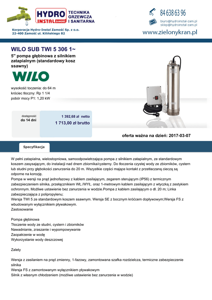 WILO SUB TWI 5 306 1~ 5'' pompa głębinowa z silnikiem zatapialnym (standardowy kosz ssawny) wysokość toczenia: do 64 m króciec tłoczny: Rp 1 1/4 pobór mocy P1: 1,20 kW dostępność do 14 dni 1 392,68 zł netto 1 713,00 zł brutto oferta ważna na dzień: 2017-03-07 W pełni zatapialna, wielostopniowa, samoodpowietrzająca pompa z silnikiem zatapialnym, ze standardowym koszem zasysającym, do instalacji nad dnem zbiornika/cysterny. Do tłoczenia czystej wody ze zbiorników, cystern lub studni przy głębokości zanurzenia do 20 m. Wszystkie części mające kontakt z przetłaczaną cieczą są odporne na korozję. Pompa w wersji na prąd jednofazowy z kablem zasilającym, zegarem sterującym (IP56) z termicznym zabezpieczeniem silnika, przełącznikiem WŁ./WYŁ. oraz 1-metrowym kablem zasilającym z wtyczką z zestykiem ochronnym. Możliwe ustawienie bez zanurzenia w wodzie.Pompa z kablem zasilającym o dł. 20 m; Linka zabezpieczająca z polipropylenu; Wersja TWI 5 ze standardowym koszem ssawnym. Wersja SE z bocznym króćcem dopływowym;Wersja FS z wbudowanym wyłącznikiem pływakowym. Zastosowanie Pompa głębinowa Tłoczenie wody ze studni, cystern i zbiorników Nawadnianie, zraszanie i wypompowywanie Zaopatrzenie w wodę Wykorzystanie wody deszczowej Zalety Wersja z zasilaniem na prąd zmienny, 1-fazowy, zamontowana szafka rozdzielcza, termiczne zabezpieczenie silnika Wersja FS z zamontowanym wyłącznikiem pływakowym Silnik z własnym chłodzeniem (możliwe ustawienie bez zanurzenia w wodzie) Standardowy kosz ssawny do wersji TWI 5 Króciec dopływowy do wersji TWI 5 SE Napięcie zasilania 1~230 V, 50 Hz / 3~400 V, 50 Hz Temperatura medium od +3 do +40 °C Stopień ochrony IP 68 Znamionowa średnica przyłącza, po stronie tłocznej Rp 1 1/4 Znamionowa średnica przyłącza, po stronie ssącej Rp 1 1/4 (TWI 5-SE) wysokość toczenia(max): 64 m przepływ (max): 6 m3/h króciec ssawny: Rp 1 1/4 maksymalne zanurzenie pompy: 20 m tłoczone medium: woda, czysta temperatura medium: +40 °C ciśnienie robocze (max): 10 bar znamionowa liczba obrotów: 2850 1/min korpus pompy: 1.4301 (AISI 304) wirnik: 1.4301 (AISI 304) korpus silnika: 1.4301 (AISI 304) wał: 1.4301 (AISI 304) pobór mocy P1: 1,20 kW rodzaj prądu: 1~230V/50Hz Prąd znamionowy: 5,6 A Stopień ochrony: IP 68 waga: 17,5 kg gwarancja: 24 m-ce Opiekun produktu: Andrzej Iwicki [email protected] 609 700 070