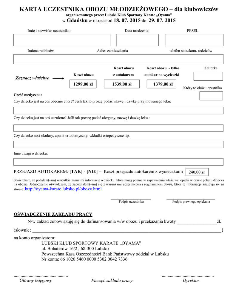KARTA UCZESTNIKA OBOZU MŁODZIEŻOWEGO – dla klubowiczów organizowanego przez: Lubski Klub Sportowy Karate „Oyama” w Gdańsku w okresie od 18. 07. 2015 do 29. 07. 2015 Imię i nazwisko uczestnika: Data urodzenia: PESEL Adres zamieszkania: Imiona rodziców Zaznacz właściwe telefon stac./kom. rodziców Adres zamieszkania Koszt obozu Koszt obozu - tylko Koszt obozu z autokarem autokar na wycieczki 1299,00 zł 1539,00 zł 1379,00 zł Zaliczka Który to obóz uczestnika Cześć medyczna: Czy dziecko jest na coś obecnie chore? Jeśli tak to proszę podać nazwę i dawkę przyjmowanego leku: Czy dziecko jest na coś uczulone? Jeśli tak proszę podać alergeny, nazwę i dawkę leku : Czy dziecko nosi okulary, aparat ortodontyczny, wkładki ortopedyczne itp. Inne uwagi o dziecku: PRZEJAZD AUTOKAREM: [TAK] - [NIE] – Koszt przejazdu autokarem z wycieczkami 240,00 zł Stwierdzam, że podałem(-am) wszystkie znane mi informacje o dziecku, które mogą pomóc w zapewnieniu właściwej opieki w czasie pobytu dziecka na obozie. Jednocześnie oświadczam, że zapoznałem(-am) się z warunkami uczestnictwa i regulaminem obozu, które to informacje znajdują się na stronie: http://oyama-karate.lubsko.pl/obozy.html _______________________ Podpis uczestnika ____________________________ Podpis prawnego opiekuna OŚWIADCZENIE ZAKŁADU PRACY N/w zakład zobowiązuję się do dofinansowania w/w obozu i przekazania kwoty ____________zł. (słownie: ______________________________________________________________________) na konto organizatora: LUBSKI KLUB SPORTOWY KARATE „OYAMA” ul. Bohaterów 16/2 ; 68-300 Lubsko Powszechna Kasa Oszczędności Bank Państwowy oddział w Lubsku Nr konta: 66 1020 5460 0000 5302 0042 7336 ............................................... Główny księgowy Pieczęć zakładu pracy ............................................. Dyrektor