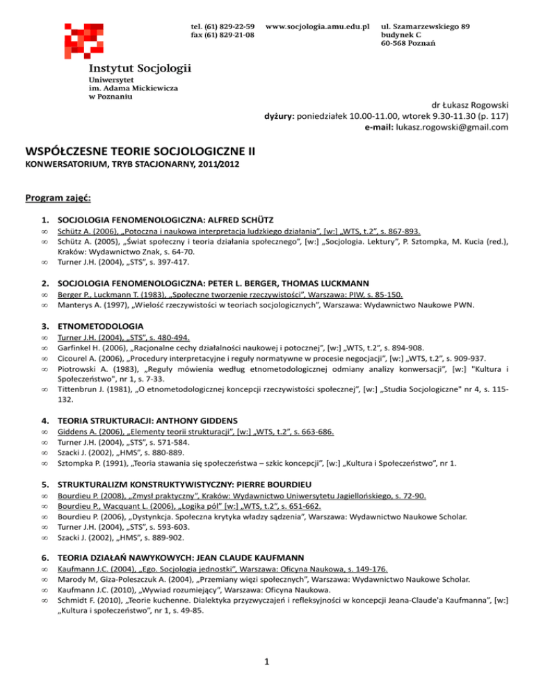 dr Łukasz Rogowski dyżury: poniedziałek 10.00-11.00, wtorek 9.30-11.30 (p. 117) e-mail: [email protected] WSPÓŁCZESNE TEORIE SOCJOLOGICZNE II KONWERSATORIUM, TRYB STACJONARNY, 2011/2012 Program zajęć: 1. SOCJOLOGIA FENOMENOLOGICZNA: ALFRED SCHÜTZ • • • Schütz A. (2006), „Potoczna i naukowa interpretacja ludzkiego działania”, [w:] „WTS, t.2”, s. 867-893. Schütz A. (2005), „Świat społeczny i teoria działania społecznego”, [w:] „Socjologia. Lektury”, P. Sztompka, M. Kucia (red.), Kraków: Wydawnictwo Znak, s. 64-70. Turner J.H. (2004), „STS”, s. 397-417. 2. SOCJOLOGIA FENOMENOLOGICZNA: PETER L. BERGER, THOMAS LUCKMANN • • Berger P., Luckmann T. (1983), „Społeczne tworzenie rzeczywistości”, Warszawa: PIW, s. 85-150. Manterys A. (1997), „Wielość rzeczywistości w teoriach socjologicznych”, Warszawa: Wydawnictwo Naukowe PWN. 3. ETNOMETODOLOGIA • • • • • Turner J.H. (2004), „STS”, s. 480-494. Garfinkel H. (2006), „Racjonalne cechy działalności naukowej i potocznej”, [w:] „WTS, t.2”, s. 894-908. Cicourel A. (2006), „Procedury interpretacyjne i reguły normatywne w procesie negocjacji”, [w:] „WTS, t.2”, s. 909-937. Piotrowski A. (1983), „Reguły mówienia według etnometodologicznej odmiany analizy konwersacji”, [w:] "Kultura i Społeczeństwo", nr 1, s. 7-33. Tittenbrun J. (1981), „O etnometodologicznej koncepcji rzeczywistości społecznej”, [w:] „Studia Socjologiczne" nr 4, s. 115132. 4. TEORIA STRUKTURACJI: ANTHONY GIDDENS • • • • Giddens A. (2006), „Elementy teorii strukturacji”, [w:] „WTS, t.2”, s. 663-686. Turner J.H. (2004), „STS”, s. 571-584. Szacki J. (2002), „HMS”, s. 880-889. Sztompka P. (1991), „Teoria stawania się społeczeństwa – szkic koncepcji”, [w:] „Kultura i Społeczeństwo”, nr 1. 5. STRUKTURALIZM KONSTRUKTYWISTYCZNY: PIERRE BOURDIEU • • • • • Bourdieu P. (2008), „Zmysł praktyczny”, Kraków: Wydawnictwo Uniwersytetu Jagiellońskiego, s. 72-90. Bourdieu P., Wacquant L. (2006), „Logika pól” [w:] „WTS, t.2”, s. 651-662. Bourdieu P. (2006), „Dystynkcja. Społeczna krytyka władzy sądzenia”, Warszawa: Wydawnictwo Naukowe Scholar. Turner J.H. (2004), „STS”, s. 593-603. Szacki J. (2002), „HMS”, s. 889-902. 6. TEORIA DZIAŁAŃ NAWYKOWYCH: JEAN CLAUDE KAUFMANN • • • • Kaufmann J.C. (2004), „Ego. Socjologia jednostki”, Warszawa: Oficyna Naukowa, s. 149-176. Marody M, Giza-Poleszczuk A. (2004), „Przemiany więzi społecznych”, Warszawa: Wydawnictwo Naukowe Scholar. Kaufmann J.C. (2010), „Wywiad rozumiejący”, Warszawa: Oficyna Naukowa. Schmidt F. (2010), „Teorie kuchenne. Dialektyka przyzwyczajeń i refleksyjności w koncepcji Jeana-Claude'a Kaufmanna”, [w:] „Kultura i społeczeństwo”, nr 1, s. 49-85. 1 7. WYBRANE WSPÓŁCZESNE TEORIE WŁADZY I PANOWANIA: PIERRE BOURDIEU (PRZEMOC SYMBOLICZNA) • • Bourdieu P. (2004), „Męska dominacja”, Warszawa: Oficyna Naukowa, s. 7-67. Bourdieu P., Passeron J.-C. (2006), „Reprodukcja. Elementy teorii systemu nauczania”, Warszawa: Wydawnictwo Naukowe PWN. 8. WYBRANE WSPÓŁCZESNE TEORIE WŁADZY I PANOWANIA: MICHEL FOUCAULT • • • • • Foucault M. (2006), „Trzy typy władzy”, [w:] „WTS, t.1”, s. 512-536. Foucault M. (2006), „Władza i wiedza”, [w:] „WTS, t.1”, s. 537-544. Foucault M. (1998), „Nadzorować i karać. Narodziny więzienia”, Warszawa: Fundacja Aletheia. Foucault M. (2002), „Porządek dyskursu. Wykład inauguracyjny wygłoszony w Collège de France 2 grudnia 1970”, Gdańsk: słowo/obraz terytoria. Szacki J. (2002), „HMS”, s. 902-910. 9. PONOWOCZESNOŚĆ I PÓŹNA NOWOCZESNOŚĆ • • • • • Giddens A. (2001), „Nowoczesność i tożsamość. «Ja» i społeczeństwo w epoce późnej nowoczesności”, Warszawa: Wydawnictwo Naukowe PWN, s. 15-49. Beck U. (2002), „Społeczeństwo ryzyka. W drodze do innej nowoczesności”, Warszawa: Wydawnictwo Naukowe Scholar, s. 25-65. Inglehart R. (2005), „Pojawienie się wartości postmaterialistycznych”, [w:] „Socjologia. Lektury”, P. Sztompka, M. Kucia (red.); Kraków: Wydawnictwo Znak, s. 334-348. Beck U., Giddens A., Lash S. (2009), „Modernizacja refleksyjna. Polityka, tradycja i estetyka w porządku społecznym nowoczesności”, Warszawa: Wydawnictwo Naukowe PWN. Szacki J. (2002), „HMS”, s. 910-921. 10. SOCJOLOGIA ŻYCIA CODZIENNEGO: MICHEL DE CERTEAU • • • • • de Certeau M. (2008), „Wynaleźć codzienność. Sztuki działania”, Kraków: Wydawnictwo Uniwersytetu Jagiellońskiego, s. 3042 i 93-110. de Certeau M. (2011), „Wynaleźć codzienność. Mieszkać, gotować”, Kraków: Wydawnictwo Uniwersytetu Jagiellońskiego. Sztompka P., Bogunia Borowska M. (red.) (2008), „Socjologia codzienności”, Kraków: Wydawnictwo Znak. Rudnicki S., Stypińska J., Wojnicka K. (red.) (2009), „Społeczeństwo i codzienność? W stronę nowej socjologii”, Warszawa: Wydawnictwa Akademickie i Profesjonalne. Bogunia-Borowska M. (red.) (2009), „Barwy codzienności. Analiza socjologiczna”, Warszawa: Wydawnictwo Naukowe Scholar. 11. TEORIA AKTORA-SIECI: BRUNO LATOUR • • • • • Latour B. (2010), „Splatając na nowo to, co społeczne. Wprowadzenie do teorii aktora-sieci”, Kraków: Universitas, s. 39-60. Latour B. (2009), „Polityka natury. Nauki wkraczają do demokracji”, Warszawa: Wydawnictwo Krytyki Politycznej. Abriszewski K. (2008), „Poznanie, zbiorowość, polityka. Analiza teorii aktora-sieci Bruno Latoura”, Kraków: Universitas. Gdula M. (2010), „Socjologia końca socjologii”. O koncepcji teoretycznej Bruno Latoura”, [w:] „Kultura i społeczeństwo”, nr 1, s. 3-15. Dant T. (2007), „Kultura materialna w rzeczywistości społecznej”, Kraków: Wydawnictwo Uniwersytetu Jagiellońskiego. 12. ESTETYKA I POLITYKA: JACQUES RANCIÈRE • • • Rancière J. (2007), „Dzielenie postrzegalnego. Estet