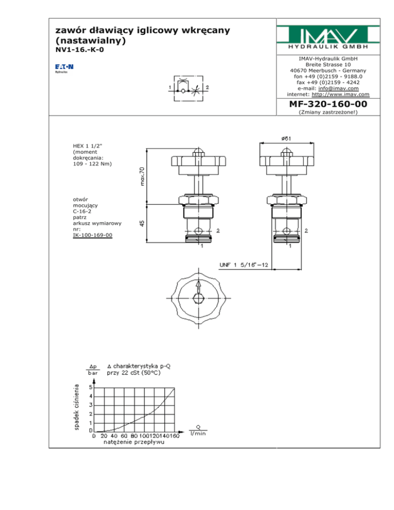 zawór dławiący iglicowy wkręcany (nastawialny) NV1-16.-K-0 IMAV-Hydraulik GmbH Breite Strasse 10 40670 Meerbusch - Germany fon +49 (0)2159 - 9188.0 fax +49 (0)2159 - 4242 e-mail: [email protected] internet: http://www.imav.com MF-320-160-00 (Zmiany zastrzeżone!) HEX 1 1/2" (moment dokręcania: 109 - 122 Nm) otwór mocujący C-16-2 patrz arkusz wymiarowy nr: IK-100-169-00 zawór dławiący iglicowy wkręcany (nastawialny) NV1-16.-K-0 IMAV-Hydraulik GmbH Breite Strasse 10 40670 Meerbusch - Germany fon +49 (0)2159 - 9188.0 fax +49 (0)2159 - 4242 e-mail: [email protected] internet: http://www.imav.com Przykład zamówienia: NV1 - 16N - K - 0 MF-320-160-00 (Zmiany zastrzeżone!) Klucz typu: wersja urządzenia zawór dławiący iglicowy rodzaj ustawienia K = pokrętło ręczne wielkość konstrukcyjna i uszczeln. 16N = Buna (NBR) 16V = Viton (FPM) forma konstrukcyjna 0 = zawór wkręcany Dane techniczne ciśnienie nominalne: 210 bar prąd nominalny: 151 l/min ciężar: 0,34 kg zakres temperatury: -40°C bis 120°C czynnik wytwarzający olej hydrauliczny HL zgodny z normą DIN 51524 T1 (ISO TC 131) ciśnienie: maks. nieszczelność: 5 kropli/min przy 22 cSt (50°C) i 210 bar uszczelnienie: do wyboru Buna (NBR) lub Viton (FPM), oraz teflonowy pierścień oporowy (PTFE) otwór mocujący: C-16-2 patrz arkusz wymiarowy nr: IK-100-169-00 obudowa: 2LH-16.-B.. patrz arkusz wymiarowy nr: IH-100-000-00 zestaw uszczelek: SP-MDS-16N-21 (NBR), SP-MDS-16V-21 (FPM)