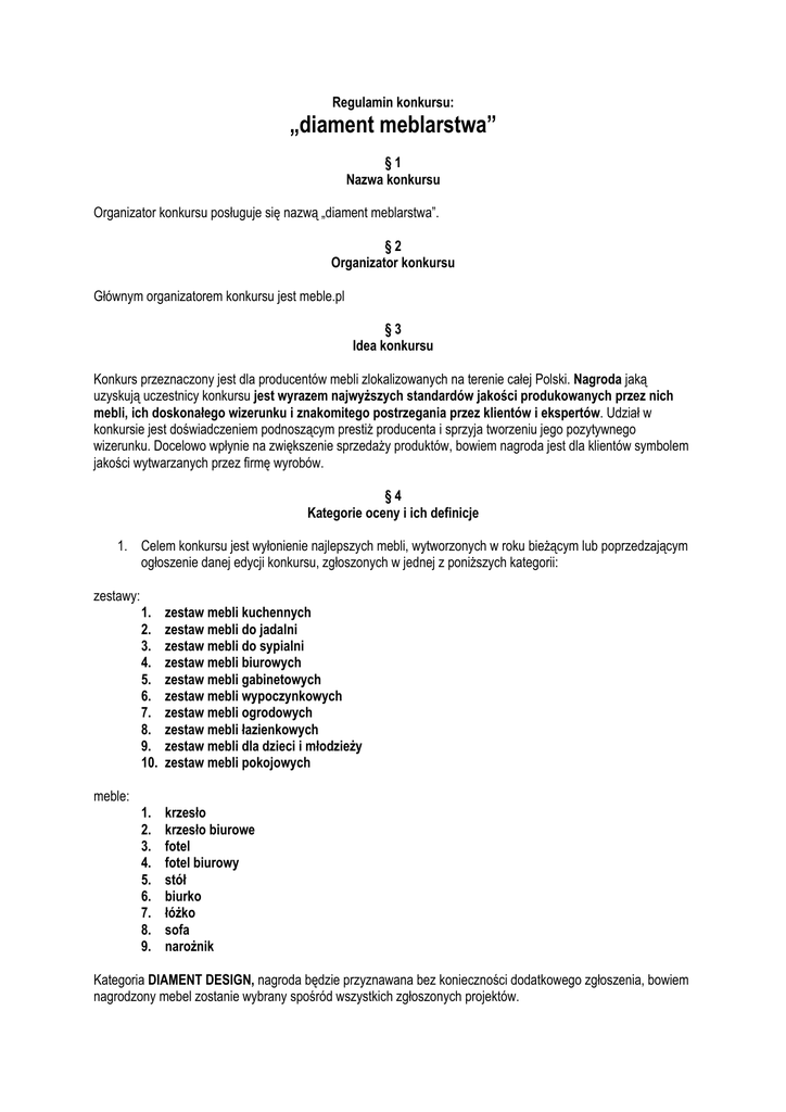Regulamin konkursu: „diament meblarstwa” §1 Nazwa konkursu Organizator konkursu posługuje się nazwą „diament meblarstwa”. §2 Organizator konkursu Głównym organizatorem konkursu jest meble.pl §3 Idea konkursu Konkurs przeznaczony jest dla producentów mebli zlokalizowanych na terenie całej Polski. Nagroda jaką uzyskują uczestnicy konkursu jest wyrazem najwyższych standardów jakości produkowanych przez nich mebli, ich doskonałego wizerunku i znakomitego postrzegania przez klientów i ekspertów. Udział w konkursie jest doświadczeniem podnoszącym prestiż producenta i sprzyja tworzeniu jego pozytywnego wizerunku. Docelowo wpłynie na zwiększenie sprzedaży produktów, bowiem nagroda jest dla klientów symbolem jakości wytwarzanych przez firmę wyrobów. §4 Kategorie oceny i ich definicje 1. Celem konkursu jest wyłonienie najlepszych mebli, wytworzonych w roku bieżącym lub poprzedzającym ogłoszenie danej edycji konkursu, zgłoszonych w jednej z poniższych kategorii: zestawy: 1. 2. 3. 4. 5. 6. 7. 8. 9. 10. zestaw mebli kuchennych zestaw mebli do jadalni zestaw mebli do sypialni zestaw mebli biurowych zestaw mebli gabinetowych zestaw mebli wypoczynkowych zestaw mebli ogrodowych zestaw mebli łazienkowych zestaw mebli dla dzieci i młodzieży zestaw mebli pokojowych 1. 2. 3. 4. 5. 6. 7. 8. 9. krzesło krzesło biurowe fotel fotel biurowy stół biurko łóżko sofa narożnik meble: Kategoria DIAMENT DESIGN, nagroda będzie przyznawana bez konieczności dodatkowego zgłoszenia, bowiem nagrodzony mebel zostanie wybrany spośród wszystkich zgłoszonych projektów. Kategoria DIAMENT INTERNAUTÓW, nagroda zostanie przyznana bez konieczności dodatkowego zgłoszenia, nagrodzony meble zostanie wybrany spośród wszystkich zgłoszonych projektów, w oparciu o ocenę internautów. 2. W ramach poszczególnych kategorii wyszczególnionych w § 4 punkt 1 przewiduje się podział na firmy małe, średnie i duże. 3. Produkt może zostać zgłoszony w więcej niż jednej kategorii. 4. Jeden producent może zgłosić do konkursu więcej niż jeden produkt w jednej lub w więcej niż jednej kategorii. W takiej sytuacji każdy zgłaszany projekt powinien zawierać odrębną dokumentację, zostać osobno zarejestrowany do konkursu i opłacony. §5 Uczestnicy konkursu Do konkursu mogą zostać zgłoszone produkty wytworzone przez firmy – producentów mebli, mających siedzibę lub przedstawicielstwo na terenie Rzeczpospolitej Polskiej. §6 Zgłoszenie produktu do konkursu 1. Zgłoszenia produktów do konkursu będą przyjmowane w terminie od 1 lutego do 10 maja 2007 r. Warunkiem przyjęcia zgłoszenia, jest jego przesłanie drogą elektroniczną (formularz elektroniczny znajduje się na stronie www.diamentmeblarstwa.pl) lub drogą pocztową. W tym drugim przypadku o przyjęciu projektu decyduje data umieszczona na stemplu pocztowym. 2. Zgłoszony produkt, po opłaceniu wymaganych należności, umieszczany jest umieszczenia na stronie internetowej konkursu www.diamentmeblarstwa.pl Zgłoszenie projektu do pierwszego etapu musi zawierać: 1. wypełniony formularz zamieszczony na stronie: www.diamentmeblarstwa.pl w formie elektronicznej lub drukowanej 2. dobrej jakości 1 - 4 różne zdjęcia produktu (300 dpi, w formacie jpg, tiff lub eps, o formacie docelowym nie mniej niż 5*5 cm, cyfrowe, nadające się do druku) 3. skrócony opis produktu zawierający: o nazwa produktu o kategoria do której zgłaszany jest produkt o szczegółowy opis produktu, w którym zostaną zawarte następujące informacje (zastosowane materiały do produkcji, użyte technologie do produkcji i inne informacje, które pozwolą na precyzyjne zapoznanie się z produktem przez zespół jurorów) o sugerowana cena detaliczna produktu 4. dane teleadresowe zgłaszającego o pełny adres firmy – producenta o telefon o e-mail o dane osoby zgłaszającej o opis firmy, w którym zawarte zostaną informacje o asortymencie, historii firmy, certyfikatach, etc.) 5. potwierdzenie opłaty dokonanej w związku ze zgłoszeniem produktu (druk przelewu, drogą pocztową, faxem albo jego skan mailem) Zgłoszenie przesłane drogą pocztową musi być przygotowane w formacie MS Word. Zdjęcia mogą być przesyłane w załączniku, na płycie CD lub przesłane na serwer ftp. Organizator zastrzega sobie prawo odrzucenia zgłoszenia z powodu niedopełnienia wymogów formalnych. Po otrzymaniu zgłoszenia organizator w terminie do 7 dni prześle każdemu uczestnikowi potwierdzenie otrzymania dokumentów (pocztą, faksem lub mailem). §7 Odpłatność 1. • • • Koszt zgłoszenia jednego projektu wynosi: w kategorii firmy małe - 750 zł + 22% VAT w kategorii firmy średnie - 1000 zł + 22% VAT w kategorii firmy duże - 1500 zł + 22% VAT 2. Jeżeli firma zgłasza więcej niż jeden projekt, za drugi ponosi odpłatność 75% ceny podstawowej, zaś za każdy kolejny 50% ceny podstawowej. 3. Przez firmy małe rozumie się podmioty zatrudniające do 50 pracowników. Firmy średnie to podmioty zatrudniające od 51 do 250 pracowników, zaś firmy duże to podmioty zatrudniające powyżej 250 pracowników. 4. Wszelkich wpłat należy dokonywać na konto organizatora: Bank BGK O/Rzeszów nr rachunku: 02 1130 1105 0005 2002 1620 0001 z dopiskiem: „diament meblarstwa” Projekty nieopłacone nie będą rozpatrywane. 5. Materiały złożone do konkursu nie podlegają zwrotowi. 6. Organizator zastrzega sobie prawo wykorzystania nadesłanych materiałów w formie pełnej lub skróconej w celach promujących producenta. §9 Jury W skład jury wchodzą eksperci z branży meblarskiej, dziennikarze mediów zajmujących się problematyką mebli, architekci, naukowcy, eksperci ds. wizerunku oraz przedstawiciele producentów. § 10 Ocena projektów 1. Ocena projektów nastąpi na podstawie następujących kryteriów: • design zgłoszonego mebla • rodzaj materiałów użytych do produkcji mebla • stosunek ceny do jakości produktu • f