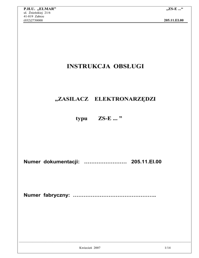 P.H.U. „ELMAR” „ZS-E ...“ ul. śnieńskiej 21/6 41-819 Zabrze (032)2730000 205.11.EI.00 INSTRUKCJA OBSŁUGI „ZASILACZ typu ELEKTRONARZĘDZI ZS-E ... ” Numer dokumentacji: …………………… 205.11.EI.00 Numer fabryczny: ……………………………………….. ______________________________________________________________________________________________________ Kwiecień 2007 1/14 P.H.U. „ELMAR” „ZS-E ...“ ul. śnieńskiej 21/6 41-819 Zabrze (032)2730000 205.11.EI.00 SPIS TREŚCI 1 Informacje ogólne. .......................................................................................................................... 3 1.1 Przedmiot opracowania. ............................................................................................................ 3 1.2 Podstawa opracowania. ............................................................................................................. 3 1.3 Warunki stosowania. ................................................................................................................. 3 1.4 Dane techniczno - eksploatacyjne .............................................................................................. 4 1.5 Wykonania. ................................................................................................................................ 4 2. Opis techniczny. ............................................................................................................................ 6 2.1 Obudowa. .................................................................................................................................... 6 2.2 Zaciski przyłączowe, połączenia elektryczne. ........................................................................... 6 2.3 Zaciski uziemiające, ciągłość uziemienia. ................................................................................. 6 2.4 Obwód zasilający i odpływowy. ............................................................................................. 7 2.5 Blokady mechaniczne i zabezpieczenia. ................................................................................. 7 2.6 Osłony przed poraŜeniem prądem............................................................................................. 7 2.7 Zabezpieczenia i sygnalizacja. .................................................................................................. 8 2.8 Zasada działania. ....................................................................................................................... 8 3. Instrukcja bezpiecznej obsługi i uŜytkowania. .......................................................................... 9 3.1. Wstęp. ....................................................................................................................................... 9 3.2 Informacje ogólne. ..................................................................................................................... 9 3.3 Przygotowanie do pracy. ........................................................................................................... 9 3.4 Uruchomienie i wyłączenie...................................................................................................... 9 4. Identyfikacja zagroŜeń w czasie obsługi i uŜytkowania. ...................................................... 10 4.1 Wstęp. ...................................................................................................................................... 10 4.2 ZagroŜenia sieci zasilania elektrycznego. ............................................................................. 10 4.3 ZagroŜenia poŜarowe. ............................................................................................................. 10 4.4 ZagroŜenia w czasie remontów i konserwacji. ................................................................... 10 4.5 ZagroŜenia związane z warunkami pracy. ........................................................................... 10 5 Warunki stosowania, przeglądy, konserwacja, naprawy. ........................................................ 11 5.1 Przeglądy, konserwacja, naprawy. ........................................................................................... 11 5.2 Uwagi ruchowe. ...................................................................................................................... 11 5.3 Usterki i sposób ich usuwania. ............................................................................................ 12 6 Okres waŜności, zakres i warunki stosowania. ......................................................................... 12 6.1 Transport. ................................................................................................................................. 12 6.2 Przechowywanie. ..................................................................................................................... 12 7. MontaŜ i podłączenie. ................................................................................................................. 13 7.1 Oględziny. ................................................................................................................................ 13 7.2 Wytyczne instalacji. ................................................................................................................ 13 7.3 Odbiór techniczny po montaŜu. ........................................................................................... 13 8. Zamawianie................................................................................................................................... 14 9. Wykaz wyposaŜenia. .................................................................................................................... 14 10. Lista rysunków i schematów. ................................................................................................. 