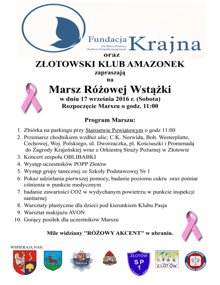 ZŁOTOWSKI KLUB AMAZONEK zapraszają na Marsz Różowej Wstążki w dniu 17 września 2016 r. (Sobota) Rozpoczęcie Marszu o godz. 11:00 Program Marszu: 1. Zbiórka na parkingu przy Starostwie Powiatowym o godz 11:00 2. Przemarsz chodnikiem wzdłuż ulic: C.K. Norwida, Boh. Westerplatte, Cechowej, Woj. Polskiego, ul. Dworzaczka, pl. Kościuszki i Promenadą do Zagrody Krajeńskiej wraz z Orkiestrą Straży Pożarnej w Złotowie 3. Koncert zespołu OBLIBABKI 4. Występ uczestników POPP Złotów 5. Występ grupy tanecznej ze Szkoły Podstawowej Nr 1 6. Pokaz udzielania pierwszej pomocy, badanie poziomu cukru oraz pomiar ciśnienia w punkcie medycznym 7. badanie zawartości CO2 w wydychanym powietrzu w punkcie inspekcji sanitarnej 8. Warsztaty plastyczne dla dzieci pod kierunkiem Klubu Pasja 9. Warsztat makijażu AVON 10. Gorący posiłek dla uczestników Marszu Mile widziany ''RÓŻOWY AKCENT'' w ubraniu. WSPIERAJĄ NAS: