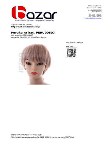BAZAR Jerzy Szymala Centrum Handlowe EACC ul. Nadrzeczna 7A 05-552 Wólka Kosowska hala 1 AB, box B tel. +48 22 701 37 27 fax. +48 22 751 64 70 kom. +48 602 260 233 e-mail:[email protected] Zapraszamy do sklepu http://hurt.bizuteriabazar.pl Peruka nr kat. PERU00507 kod produktu: PERU00507 kategoria: OZDOBY DO WŁOSÓW > Peruki Producent: BAZAR Kod QR: strona: 1/1 wydrukowano: 07-03-2017 http://hurt.bizuteriabazar.pl/peruka_6202_27h613-numer-kat-peru00507.html