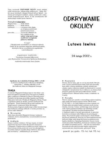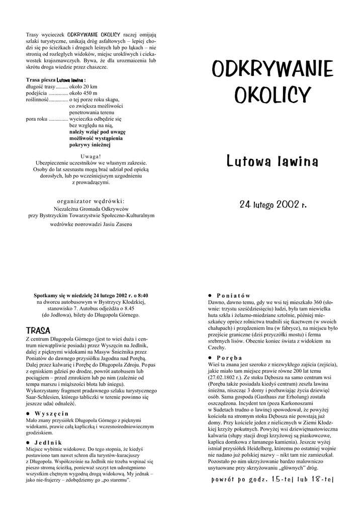 Trasy wycieczek ODKRYWANIE OKOLICY raczej omijają szlaki turystyczne, unikają dróg asfaltowych – lepiej chodzi się po ścieŜkach i drogach leśnych lub po łąkach – nie stronią od rozległych widoków, miejsc urokliwych i ciekawostek krajoznawczych. Bywa, Ŝe dla urozmaicenia lub skrótu droga wiedzie przez chaszcze. Trasa piesza Lutowa lawina : długość trasy......... około 20 km podejścia .............. około 450 m roślinność.............. o tej porze roku skąpa, co zwiększa moŜliwości penetrowania terenu pora roku .............. wycieczka odbędzie się bez względu na nią, naleŜy wziąć pod uwagę moŜliwość wystąpienia pokrywy śnieŜnej ODKRYWANIE OKOLICY U wa ga ! Ubezpieczenie uczestników we własnym zakresie. Osoby do lat szesnastu mogą brać udział pod opieką dorosłych, lub po wcześniejszym uzgodnieniu z prowadzącymi. Lutowa lawina o r ganizato r węd r ó wki: 24 lutego 2002 r. NiezaleŜna Gromada Odkrywców przy Bystrzyckim Towarzystwie Społeczno-Kulturalnym wędrówkę poprowadzi Jasiu Zasępa Spotkamy się w niedzielę 24 lutego 2002 r. o 8:40 na dworcu autobusowym w Bystrzycy Kłodzkiej, stanowisko 7. Autobus odjeŜdŜa o 8.45 (do Jodłowa), bilety do Długopola Górnego. TRASA Z centrum Długopola Górnego (jest to wieś duŜa i centrum niewątpliwie posiada) przez Wyszęcin na Jedlnik, dalej z pięknymi widokami na Masyw ŚnieŜnika przez Poniatów do dawnego przysiółku Jagodna nad Porębą. Dalej przez kalwarię i Porębę do Długopola Zdroju. Po pas z ogniskiem gdzieś po drodze, powrót autobusem lub pociągiem – przed zmrokiem lub po nim (zaleŜnie od tempa marszu i miąŜszości błota lub śniegu). Wykorzystamy fragment pradawnego szlaku turystycznego Saar-Schlesien, którego tabliczki w terenie powinno się jeszcze udać odnaleźć. • Wyszęcin Mało znany przysiółek Długopola Górnego z pięknymi widokami, prawie całą kapliczką i wczesnośredniowiecznym grodziskiem. • Jedlnik Miejsce wybitnie widokowe. Do tego stopnia, Ŝe kiedyś postawiono tam nawet schron dla turystów-kuracjuszy z Długopola. Współcześnie na Jedlnik nie trzeba wspinać się pieszo stromą ścieŜką, poniewaŜ szczyt ten udostępniono wszystkim chętnym wygodną drogą widokową. My jednak – jako nie-frajerzy – zdobędziemy go „po staremu”. • Poniatów Dawno, dawno temu, gdy we wsi tej mieszkało 360 (słownie: trzystu sześćdziesięciu) ludzi, była tam niewielka huta szkła i Ŝelazno-miedziane sztolnie, później mieszkańcy oprócz rolnictwa trudnili się tkactwem (w swoich chałupach) i przędzeniem lnu (w fabryce), na miejscu było przejście graniczne (dziś przyczółki mostu) i ferma srebrnych lisów. Obecnie koniec świata z widokiem na Czechy. • Poręba Wieś ta znana jest szeroko z niezwykłego zajścia (zejścia), jakie miało tam miejsce prawie równe 200 lat temu (27.02.1802 r.). Ze stoku Dębosza na samo centrum wsi (Poręba takŜe posiadała kiedyś centrum) zeszła lawina śnieŜna, niszcząc 3 domy i pozbawiając Ŝycia dziewięć osób. Sama gospoda (Gasthaus zur Erholung) została oszczędzona. Incydent ten (poza Karkonoszami w Sudetach trudno o lawinę) spowodował, Ŝe powyŜej kościoła na stromym stoku Dębosza nie powstają juŜ domy. Przy kościele jeden z nielicznych w Ziemi Kłodzkiej krzyŜy pokutnych. PowyŜej wsi dziewiętnastowieczna kalwaria (słupy stacji drogi krzyŜowej są piaskowcowe, kaplica domkowa z łamanego kamienia). Jeszcze wyŜej istniał przysiółek Heidelberg, któremu po ostatniej wojnie nie nadano juŜ polskiej nazwy – nikt tam nie zamieszkał. Pozostało po nim ukrzyŜowanie bardzo malowniczo usytuowane przy skrzyŜowaniu „głównych” dróg. powrót po godz. 15-tej lub 18-tej