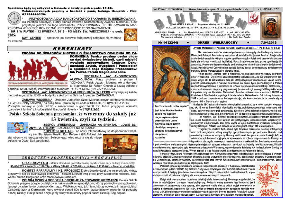 Spotkania będą się odbywać w Kościele w każdy piątek o godz. 15.00. Zainteresowanych prosimy o kontakt z panią Jadwiga Haręźlak - Mob: 07784446350. * PRZYGOTOWANIA DLA KANDYDATÓW DO SAKRAMENTU BIERZMOWANIA dla Parafian dorosłych, którzy planują zawrzeć Sakramentalny Związek Małżeński, a nie przystąpili jeszcze do tego sakramentu. PRZYPOMINAMY, ŻE DO ZAWARCIA MAŁZEŃSTWA W POLSCE KONIECZNE JEST PRZYJĘCIE TEGO SAKRAMENTU. NR 1 W PIĄTEK - 12 KWIETNIA 2013 - PO MSZY ŚW. WIECZORNEJ - o godz. 19:00. * DAY CENTRE - 1. spotkanie po przerwie świątecznej odbędzie się w środę 10 kwietnia. K O M U N I K A TY * PROŚBA DO ŚWIADKÓW HISTORII O ŚWIADECTWO OCALENIA OD ZAPOMNIENIA Bardzo prosimy osoby chcące dać świadectwo historii, czyli udzielić wywiadu pracownikom Centrum Dokumentacji Zsyłek, Wypędzeń i Przesiedleń o zgłaszanie tego Księdzu Proboszczowi lub Prezes Parafii Magdalenie Ions. * SPOTKANIA „AA” ANONIMOWYCH ALKOHOLIKÓW Masz problem z piciem ? "ODNOWA" Polski Język - Meetingi AA w Harrogate. Naprzeciw St. Robert Church w każdą sobotę o godzinie 12:00. Więcej informacji pod numerem Tel : 07413 560 196 ZAPRASZAM. * SPOTKANIA „AA” ANONIMOWYCH ALKOHOLIKÓW W LEEDS odbywają się każdej niedzieli o godzinie 12:00. w budynku szkolnym w Sali na 1. piętrze. ZAPRASZAM. * ZABAWA WIOSENNA - Związek Junackich Szkół Mechanicznych serdecznie zaprasza na „WIOSENNĄ ZABAWĘ” na dużą Sale Parafialną w Leeds w SOBOTĘ 13 KWIETNIA 2013. Początek zabawy o godz. 20:00 - zakończenie o godz.24:00. Do tańca przygrywa orkiestra „Jarosław i Janina” z Huddersfield. Bar, bufet i loteria - WSTĘP £ 5-00 Polska Szkoła Sobotnia przypomina, że wracamy do szkoły już 13 kwietnia, czyli za tydzień. * ZESPÓŁ „FREDREUM” - ZAPRASZA NA SPEKTAL - „DWIE BLIZNY” - A. FREDRY - SZCZEGÓŁY NA AFISZACH. * KOPERTKI GIFT AID - na nowy rok podatkowy są do pobrania w kaplicy św. Stanisława Kostki. Pan Referent Gift Aid jest dzisiaj obecny na uroczystościach Święconego, więc można się do niego zgłosić na Dużej Sali parafialnej. SERDECZE + PODZIĘKOWANIA + BÓG ZAPŁAĆ * OFIARODAWCOM - którzy złożyli na potrzeby naszej parafii swoje dary na tacę w niedzielę: 31/03/2013 + Kopertki - £ 192-74p. + Ofiary Gift Aid - £ 579-70p. + na tacę - £ 1139-46p. + Biuletyn - £ 45-20p. * KOMITET PARAFIALNY I KS. PROBOSZCZ serdecznie dziękuje wszystkich, którzy przyczynili się do duchowego przeżycia Triduum Sacrum swą pracą przy ozdobieniu kościoła, śpiewami i służbą liturgiczną oraz modlitewnym udziałem. * POLSKA SZKOŁA SOBOTNIA DZIĘKUJE ZA POPARCIE KIERMASZU Polska Szkoła Sobotnia pragnie gorąco podziękować tak wszystkim sympatykom, którzy pomogli w przygotowaniu i przeprowadzeniu dorocznego Kiermaszu Wielkanocnego jak i tym, którzy odwiedzili nasze stoiska. Całkowity zysk z Kiermaszu, który wyniósł ponad 800 funtów, przeznaczony zostanie na potrzeby naszej Szkoły. Raz jeszcze dziękujemy wszystkim którzy poparli naszą Szkołę. Bóg Zapłać. For Private Circulation Strona internetowa parafii: www.parafialeeds.co.uk POLSKIEJ PARAFII „ CHAPELTOWN ” Registered Charity No: 1119423 M.B.CZĘSTOCHOWSKIEJ I ŚW. STANISŁAWA KOSTKI W LEEDS. ADRES KS. PROB. + 6A, Harehills Lane, LEEDS, LS7 4EY + tel. 0113-262 3220 POLSKI OŚRODEK KATOLICKI + Newton Hill Road, Leeds, LS7 4JE + tel. 0113-262 8019 Na prawach rękopisu + + + + + + + + + + + + + + + + + + + Ks. Prob. Jan Zaręba Nr 14 (2244) + OKRES WIELKANOCNY + 7.04.2013 „Przeto Miłosierdzie Pańskie na wieki wychwalać będę…” (Ps 144,9; Ps 88,2) Na przestrzeni wieków stosunki polsko-rosyjskie nigdy nieukładany się dobrze. Mimo, że i Polacy i Rosjanie są narodami słowiańskimi to jednak Polska i Rosja należą do dwóch zupełnie różnych kręgów cywilizacyjnych - Polska od czasów chrztu znalazła się w kręgu cywilizacji łacińskiej, Rosja kształtowana była przez cywilizację bizantyjską. Prawie sto lat temu doszło do kolejnego w historii starcia tych dwóch cywilizacji. Pochód Armii Czerwonej na podbój Europy został powstrzymany zwycięstwem Polski w Bitwie Warszawskiej w sierpniu 1920. 19 lat później , łamiąc pakt o nieagresji, wojska sowieckie wkroczyły do Polski dnia 17 września. Do niewoli sowieckiej trafiło wówczas ok. 240 000 wojskowych polskich, w tym ok. 10 000 oficerów oraz ok. 6500 policjantów i żandarmów. Część szeregowych pochodzących z Kresów puszczono do domu, tych pochodzących z Polski zachodniej wymieniono z Niemcami na jeńców narodowości ukraińskiej i białoruskiej, a resztę skierowano do pracy przymusowej (budowa drogi Nowogród Wołyński-Lwow i kopalnie rudy na Ukrainie). Natomiast oficerów umieszczono w obozach NKWD w Kozielsku i Starobielsku, a policję i żandarmów w Ostaszkowie. Od polowy listopada 1939 r. jeńcom zezwolono na korespondencje, ale korespondencja ta urwała się w marcu 1940 r. Słuch o nich zaginął 13 kwietnia 1943 roku radio berlińskie ogłosiło komunikat, ze w miejscowości KosogoJan Twardowski - „Bez kaplicy” ry, ok. 12 km od Smoleńska, niemieckie władze, poinformowane przez miejscowa ludjest taka Matka Boska ność, odkryły masowy grób zawierający zwłoki ok. 3000 polskich oficerów, wśród których znajdował się też gen. Smorawiński. Był to dopiero początek strasznych odkryć… co nie ma kaplicy Tak Niemcy , jak i Sowieci doskonale rozumieli, że żaden organizm państwowy na jednym miejscu nie może funkcjonować bez swoich elit politycznych, gospodarczych, wojskowych, pozostać nie umie naukowych i kulturalnych. Dali temu wyraz w tajnej konferencji wysokich funkcjonaprzeszła przed Katyń riuszy Gestapo i NKWD, jaka odbyła się w początkach roku 1940 w Zakopanem. chodzi po rozpaczy Tragicznym efektem tych obrad było fizyczne niszczenie polskiej inteligencji spotyka niewierzących oraz tych wszystkich, którzy mogliby być potencjalnymi przywódcami 