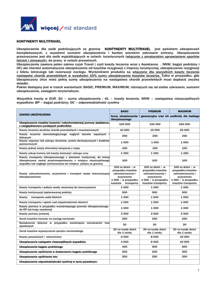 KONTYNENTY MULTITRAVEL Ubezpieczenie dla osób podróżujących za granicę KONTYNENTY MULTITRAVEL jest pakietem ubezpieczeń kompleksowych, z wysokimi sumami ubezpieczenia i bardzo szerokim zakresem ochrony. Ubezpieczenie przeznaczone jest dla osób wyjeżdżających w celach: turystycznych (włącznie z amatorskim uprawianiem sportów letnich i zimowych), do pracy, w celach prywatnych. Ubezpieczenia zawiera pełen zakres ryzyk Travel ( czyli koszty leczenia wraz z Assistance , NNW, bagaż podróżny i OC) ale również automatyczne ubezpieczenie od kosztów rezygnacji z imprezy turystycznej, ubezpieczenie rezygnacji z biletu lotniczego lub rezerwacji noclegu. Wyróżnikiem produktu są włączone dla wszystkich koszty leczenia następstw chorób przewlekłych w wysokości 10% sumy ubezpieczenia kosztów leczenia. Tylko w przypadku, gdy Ubezpieczony chce mieć pełną sumę ubezpieczenia na następstwa chorób przewlekłych musi dopłacić zwyżkę składki. Pakiet dostępny jest w trzech wariantach: BASIC, PREMIUM, MAXIMUM, różniących się od siebie zakresem, sumami ubezpieczenia, zasięgiem terytorialnym. Wszystkie kwoty w EUR, SU – suma ubezpieczenia ; KL – koszty leczenia, NNW – następstwa nieszczęśliwych wypadków; BP – bagaż podróżny; OC – odpowiedzialność cywilna BASIC ZAKRES UBEZPIECZENIA PREMIUM MAXIMUM Sumy ubezpieczenia i gwarancyjne oraz ich podlimity dla każdego Ubezpieczonego Ubezpieczenie kosztów leczenia i natychmiastowej pomocy assistance, z uwzględnieniem poniższych podlimitów: 100 000 150 000 250 000 Koszty leczenia skutków chorób przewlekłych i nowotworowych 10 000 15 000 25 000 250 250 250 1 000 1 000 1 000 100 100 100 1 250 1 250 1 250 100 100 100 Koszty leczenia stomatologicznego nagłych stanów zapalnych i bólowych Koszty naprawy lub zakupu okularów, protez dentystycznych i środków pomocniczych Koszty jednej wizyty lekarskiej związanej z ciążą Koszty zakup trumny lub koszty kremacji i zakupu urny Koszty transportu Ubezpieczonego z placówki medycznej, do której Ubezpieczony został przetransportowany z miejsca nieszczęśliwego wypadku lub nagłego zachorowania do miejsca pobytu za granicą 100 za dzień – w 100 za dzień – w przypadku kosztów przypadku kosztów Koszty zakwaterowania, wyżywienia i transport osoby towarzyszącej zakwaterowania i zakwaterowania i Ubezpieczonemu wyżywienia wyżywienia 1 000 – w przypadku 1 000 – w przypadku kosztów transportu kosztów transportu Koszty transportu i pobytu osoby wezwanej do towarzyszenia Koszty kontynuacji zaplanowanej podróży 1 000 1 000 100 za dzień – w przypadku kosztów zakwaterowania i wyżywienia 1 000 – w przypadku kosztów transportu 1 000 500 500 500 1 000 1 000 1 000 Koszty transportu i opieki nad niepełnoletnimi dziećmi 1 000 1 000 1 000 Koszty pomocy w przypadku wcześniejszego powrotu Ubezpieczonego do RP lub kraju rezydencji 1 000 1 000 1 000 Koszty pomocy prawnej 2 500 2 500 2 500 250 250 250 Koszty transportu osób bliskich Zwrot kosztów karnetu na wyciąg narciarski Świadczenie dzienne w przypadku zamknięcia narciarskich tras zjazdowych 20 20 20 20 na każdy dzień dla 1 osoby 20 na każdy dzień dla 1 osoby 20 na każdy dzień dla 1 osoby Koszty poszukiwań i ratownictwa 6 000 8 000 10 000 Ubezpieczenie następstw nieszczęśliwych wypadków Zwrot kosztów wypożyczenia sprzętu narciarskiego 4 000 6 000 10 000 Ubezpieczenie bagażu podróżnego 400 500 600 Ubezpieczenie opóźnienia w dostarczeniu bagażu podróżnego 200 200 200 Ubezpieczenie opóźnienia lotu 200 200 200 Ubezpieczenie odpowiedzialności cywilnej w życiu prywatnym: 1 szkody osobowe 50 000 80 000 100 000 szkody rzeczowe 5 000 8 000 10 000 10 000 15 000 20 000 1 000 1 500 2 000 1 250 1 250 1 250 Ubezpieczenie kosztów rezygnacji z biletu lotniczego 500 500 500 Ubezpieczenie kosztów rezygnacji z rezerwacji noclegu 500 500 500 150 150 150 3 500 3 500 3 500 500 700 1 000 szkody osobowe związane z uprawianiem sportu objętego umową ubezpieczenia szkody rzeczowe związane z uprawianiem sportu objętego umową ubezpieczenia Ubezpieczenie kosztów rezygnacji z imprezy turystycznej lub jej przerwania Ubezpieczenie gotówki wypłaconej z bankomatu utraconej w wyniku kradzieży z włamaniem lub rabunku Ubezpieczenie mienia ruchomego od kradzieży z włamaniem pozostawionego w miejscu zamieszkania Ubezpieczonego podczas podróży zagranicznej Ubezpieczenie sprzętu sportowego WAŻNE INFORMACJE: 1. W zakresie ubezpieczenia włączone są bez opłacania żadnej dodatkowej zwyżki składki: Koszty leczenia następstw chorób przewlekłych do 10% sumy ubezpieczenia kosztów leczenia; Amatorskie uprawianie sportów letnich i zimowych ( w tym narciarstwa, snowboardu, wszystkich odmian surfingu); Ubezpieczenie od kosztów rezygnacji z imprezy turystycznej, biletu lotniczego lub rezerwacji noclegu; Dodatkowe ryzyka sportowe jak : sprzęt sportowy, odpowiedzialność cywilna związana z amatorskim uprawianiem sportu; Automatyczne przedłużenie ochrony ubezpieczeniowej do 72 h w przypadku gdy Ubezpieczony nie będzie mógł wrócić do kraju z powodu np. awarii środka transportu, odwołania lotu z uwagi na warunki atmosferyczne; 2. Po opłaceniu dodatkowej składki, ochroną ubezpieczeniową mogą zostać objęte poniżej wymienione ryzyka: wykonywanie pracy fizycznej za granicą ( Kod PF + 60%); następstwa chorób przewlekłych i nowotworowych do pełnej sumy ubezpieczenia KL ( kod CP + 100%); uprawianie sportów wysokiego ryzyka ( kod ryzyka SWR + 100%); zawodowe i wyczynowe uprawianie sportu ( kod ryzyka ZS + 200%); uprawianie sportów ekstremalnych ( kod ryzyka SE + 300%); 3. Ubezpieczenie podzielone jest na dwa zakresy terytorialne ( Europa i Świat). Każdy z pakietów można kupić w wariancie na Europę lub na Świat. 4. W przypadku wyjazdów do USA, Kanady lub Australii ubezpieczenie może zostać zawarte przez osoby do 70 roku życia. Wszystkie szkody związane z kosztami le