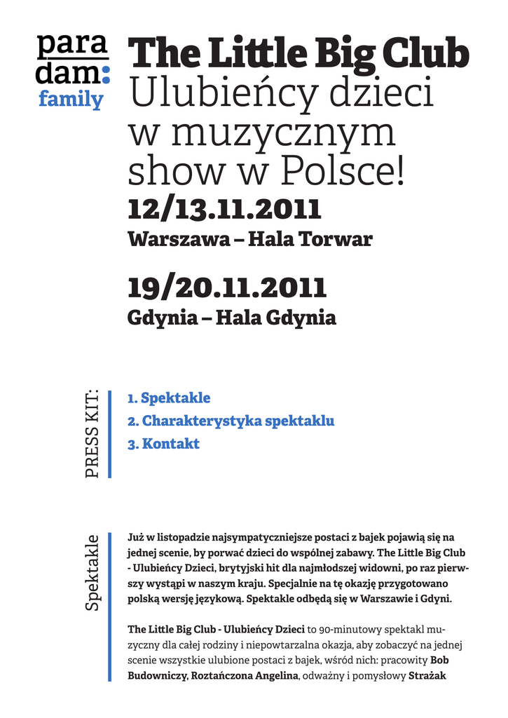 The Little Big Club Ulubieńcy dzieci w muzycznym show w Polsce! 12/13.11.2011 Warszawa – Hala Torwar 19/20.11.2011 PRESS KIT: 1. Spektakle Spektakle Gdynia – Hala Gdynia Już w listopadzie najsympatyczniejsze postaci z bajek pojawią się na jednej scenie, by porwać dzieci do wspólnej zabawy. The Little Big Club - Ulubieńcy Dzieci, brytyjski hit dla najmłodszej widowni, po raz pierwszy wystąpi w naszym kraju. Specjalnie na tę okazję przygotowano polską wersję językową. Spektakle odbędą się w Warszawie i Gdyni. 2. Charakterystyka spektaklu 3. Kontakt The Little Big Club - Ulubieńcy Dzieci to 90-minutowy spektakl muzyczny dla całej rodziny i niepowtarzalna okazja, aby zobaczyć na jednej scenie wszystkie ulubione postaci z bajek, wśród nich: pracowity Bob Budowniczy, Roztańczona Angelina, odważny i pomysłowy Strażak Spektakl Charakterystyka spektakli Sam, parowóz Tomek i jego przyjaciele, uwielbiający zabawę pingwinek Pingu, a także niezwykle ciepły i przyjazny tyranozaurus rex – Barney. Tworzyszyć im będą członkowie zespołu muzycznego The Little Big Club. Wszyscy razem przeniosą publiczość do świata kreskówek, dobrze znanych dzieciom piosenek, ciekawej choreografii i pobudzającej wyobraźnię scenografii. Najmłodsi będą mogli nie tylko spotkać ulubionych bohaterów, ale także potańczyć z nimi i zaśpiewać. Wrażenia ze spektaklu na długo pozostaną w pamięci dzieci, a- dzięki wysokiemu poziomowi produkcji- rodzice i opiekunowie będą się bawić niemal tak samo dobrze jak ich pociechy. The Little Big Club to najbardziej wyczekiwane przez dzieci wydarzenie. W tym roku obejrzą je widzowie w ponad 70 krajach, na niemal wszystkich kontynentach. Specjalnie dla polskich maluchów została stworzona polska wersja językowa! Spektakle będzie można obejrzeć 12 i 13 listopada w Warszawie oraz 19 i 20 listopada w Gdyni. gdzie? Hala Torwar Warszawa kiedy? 12-13.11.2011 roku godz. 1430 1800 ceny biletów: 150 pln 120 pln 90pln 70 pln 50 pln gdzie? Hala Gdynia Gdynia kiedy? 19-20.11.2011 roku godz. 1430 ceny biletów: 135 pln 115 pln 65pln 45 pln 1800 Kontakt Charakterystyka spektakli bilety do nabycia: www.paradam.pl www.ticketpro.pl www.eventim.pl www.ticketportal.pl oraz w sieci Salonów Empik Media Markt Saturn więcej informacji na: www.paradam.pl Organizator: Agencja Artystyczna PARADAM email: [email protected] Agnieszka Kloryga Dyrektor tel. +48 605 057 132 Małgorzata Zbierada-Tyszkiewicz Dyrektor ds. Marketingu tel.+48 695 599 734