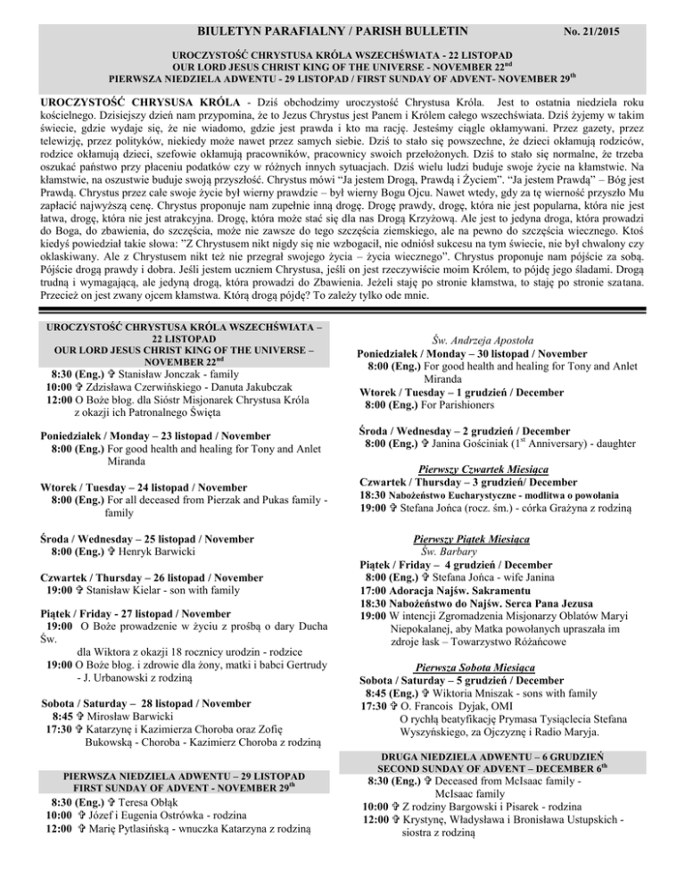 BIULETYN PARAFIALNY / PARISH BULLETIN No. 21/2015 UROCZYSTOŚĆ CHRYSTUSA KRÓLA WSZECHŚWIATA - 22 LISTOPAD OUR LORD JESUS CHRIST KING OF THE UNIVERSE - NOVEMBER 22nd PIERWSZA NIEDZIELA ADWENTU - 29 LISTOPAD / FIRST SUNDAY OF ADVENT- NOVEMBER 29th UROCZYSTOŚĆ CHRYSUSA KRÓLA - Dziś obchodzimy uroczystość Chrystusa Króla. Jest to ostatnia niedziela roku kościelnego. Dzisiejszy dzień nam przypomina, że to Jezus Chrystus jest Panem i Królem całego wszechświata. Dziś żyjemy w takim świecie, gdzie wydaje się, że nie wiadomo, gdzie jest prawda i kto ma rację. Jesteśmy ciągle okłamywani. Przez gazety, przez telewizję, przez polityków, niekiedy może nawet przez samych siebie. Dziś to stało się powszechne, że dzieci okłamują rodziców, rodzice okłamują dzieci, szefowie okłamują pracowników, pracownicy swoich przełożonych. Dziś to stało się normalne, że trzeba oszukać państwo przy płaceniu podatków czy w różnych innych sytuacjach. Dziś wielu ludzi buduje swoje życie na kłamstwie. Na kłamstwie, na oszustwie buduje swoją przyszłość. Chrystus mówi “Ja jestem Drogą, Prawdą i Życiem”. “Ja jestem Prawdą” – Bóg jest Prawdą. Chrystus przez całe swoje życie był wierny prawdzie – był wierny Bogu Ojcu. Nawet wtedy, gdy za tę wierność przyszło Mu zapłacić najwyższą cenę. Chrystus proponuje nam zupełnie inną drogę. Drogę prawdy, drogę, która nie jest popularna, która nie jest łatwa, drogę, która nie jest atrakcyjna. Drogę, która może stać się dla nas Drogą Krzyżową. Ale jest to jedyna droga, która prowadzi do Boga, do zbawienia, do szczęścia, może nie zawsze do tego szczęścia ziemskiego, ale na pewno do szczęścia wiecznego. Ktoś kiedyś powiedział takie słowa: ”Z Chrystusem nikt nigdy się nie wzbogacił, nie odniósł sukcesu na tym świecie, nie był chwalony czy oklaskiwany. Ale z Chrystusem nikt też nie przegrał swojego życia – życia wiecznego”. Chrystus proponuje nam pójście za sobą. Pójście drogą prawdy i dobra. Jeśli jestem uczniem Chrystusa, jeśli on jest rzeczywiście moim Królem, to pójdę jego śladami. Drogą trudną i wymagającą, ale jedyną drogą, która prowadzi do Zbawienia. Jeżeli staję po stronie kłamstwa, to staję po stronie szatana. Przecież on jest zwany ojcem kłamstwa. Którą drogą pójdę? To zależy tylko ode mnie. UROCZYSTOŚĆ CHRYSTUSA KRÓLA WSZECHŚWIATA – 22 LISTOPAD OUR LORD JESUS CHRIST KING OF THE UNIVERSE – NOVEMBER 22nd 8:30 (Eng.) Stanisław Jonczak - family 10:00 Zdzisława Czerwińskiego - Danuta Jakubczak 12:00 O Boże błog. dla Sióstr Misjonarek Chrystusa Króla z okazji ich Patronalnego Święta Poniedziałek / Monday – 23 listopad / November 8:00 (Eng.) For good health and healing for Tony and Anlet Miranda Wtorek / Tuesday – 24 listopad / November 8:00 (Eng.) For all deceased from Pierzak and Pukas family family Środa / Wednesday – 25 listopad / November 8:00 (Eng.) Henryk Barwicki Czwartek / Thursday – 26 listopad / November 19:00 Stanisław Kielar - son with family Piątek / Friday - 27 listopad / November 19:00 O Boże prowadzenie w życiu z prośbą o dary Ducha Św. dla Wiktora z okazji 18 rocznicy urodzin - rodzice 19:00 O Boże błog. i zdrowie dla żony, matki i babci Gertrudy - J. Urbanowski z rodziną Sobota / Saturday – 28 listopad / November 8:45 Mirosław Barwicki 17:30 Katarzynę i Kazimierza Choroba oraz Zofię Bukowską - Choroba - Kazimierz Choroba z rodziną PIERWSZA NIEDZIELA ADWENTU – 29 LISTOPAD FIRST SUNDAY OF ADVENT - NOVEMBER 29th 8:30 (Eng.) Teresa Obłąk 10:00 Józef i Eugenia Ostrówka - rodzina 12:00 Marię Pytlasińską - wnuczka Katarzyna z rodziną Św. Andrzeja Apostoła Poniedziałek / Monday – 30 listopad / November 8:00 (Eng.) For good health and healing for Tony and Anlet Miranda Wtorek / Tuesday – 1 grudzień / December 8:00 (Eng.) For Parishioners Środa / Wednesday – 2 grudzień / December 8:00 (Eng.) Janina Gościniak (1st Anniversary) - daughter Pierwszy Czwartek Miesiąca Czwartek / Thursday – 3 grudzień/ December 18:30 Nabożeństwo Eucharystyczne - modlitwa o powołania 19:00 Stefana Jońca (rocz. śm.) - córka Grażyna z rodziną Pierwszy Piątek Miesiąca Św. Barbary Piątek / Friday – 4 grudzień / December 8:00 (Eng.) Stefana Jońca - wife Janina 17:00 Adoracja Najśw. Sakramentu 18:30 Nabożeństwo do Najśw. Serca Pana Jezusa 19:00 W intencji Zgromadzenia Misjonarzy Oblatów Maryi Niepokalanej, aby Matka powołanych upraszała im zdroje łask – Towarzystwo Różańcowe Pierwsza Sobota Miesiąca Sobota / Saturday – 5 grudzień / December 8:45 (Eng.) Wiktoria Mniszak - sons with family 17:30 O. Francois Dyjak, OMI O rychłą beatyfikację Prymasa Tysiąclecia Stefana Wyszyńskiego, za Ojczyznę i Radio Maryja. DRUGA NIEDZIELA ADWENTU – 6 GRUDZIEŃ SECOND SUNDAY OF ADVENT – DECEMBER 6th 8:30 (Eng.) Deceased from McIsaac family McIsaac family 10:00 Z rodziny Bargowski i Pisarek - rodzina 12:00 Krystynę, Władysława i Bronisława Ustupskich siostra z rodziną Dochód z obiadu $1,307.00 został w całości przeznaczony na cele parafialne. OGŁOSZENIA DUSZPASTERSKIE ADWENT – CZAS OCZEKIWANIA – Następna niedziela rozpoczyna nowy rok liturgiczny i wprowadza nas w Adwent co oznacza ‘przyjście’. Rzeczywiście, okres Adwentu jest to czas oczekiwania na powtórne przyjście Zbawiciela u kresu wieków jak i na święta Bożego Narodzenia. Okres ten trwa cztery tygodnie. Podczas Adwentu używany jest fioletowy kolor szat liturgicznych symbolizujący skruchę i pokutę, wyciszenie i rozmodlenie. SIOSTRY MISJONARKI CHRYSTUSA KRÓLA, posługujące także w naszej parafii, w Niedzielę Chrystusa Króla obchodzą swoje Patronalne Święto. Zgromadzenie powstało z inicjatywy o. Ignacego Posadzego w 1959 roku w Poznaniu. Siostry posługują na całym świecie odpowiadając na Boże wezwanie niosą Chrystusa Polakom na ich emigracyjnym szlaku.