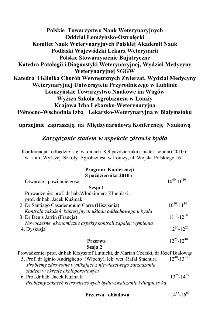 Polskie Towarzystwo Nauk Weterynaryjnych Oddział Łomżyńsko-Ostrołęcki Komitet Nauk Weterynaryjnych Polskiej Akademii Nauk Podlaski Wojewódzki Lekarz Weterynarii Polskie Stowarzyszenie Bujatryczne Katedra Patologii i Diagnostyki Weterynaryjnej, Wydział Medycyny Weterynaryjnej SGGW Katedra i Klinika Chorób Wewnętrznych Zwierząt, Wydział Medycyny Weterynaryjnej Uniwersytetu Przyrodniczego w Lublinie Łomżyńskie Towarzystwo Naukowe im Wagów Wyższa Szkoła Agrobiznesu w Łomży Krajowa Izba Lekarsko-Weterynaryjna Północno-Wschodnia Izba Lekarsko-Weterynaryjna w Białymstoku uprzejmie zapraszają na Międzynarodową Konferencję Naukową Zarządzanie stadem w aspekcie zdrowia bydła Konferencja odbędzie się w dniach 8-9 października ( piątek-sobota) 2010 r. w auli Wyższej Szkoły Agrobiznesu w Łomży, ul. Wojska Polskiego 161. Program Konferencji 8 października 2010 r. 1000-1010 1. Otwarcie i powitanie gości Sesja 1 Prowadzenie: prof. dr hab.Włodzimierz Kluciński, prof. dr hab. Jacek Kuźmak 2. Dr Santiago Casademmunt Garre (Hiszpania) Kontrola zakażeń bakteryjnych układu oddechowego u bydła 3. Dr Denis Jarrin (Francja) Nowoczesne, ekonomiczne aspekty kontroli zapaleń wymienia 4. Dyskusja 1010-1110 1110-1210 1210-1225 Przerwa 1225-1240 Sesja 2 Prowadzenie: prof. dr hab.Krzysztof Lutnicki, dr Marian Czerski, dr Józef Białowąs 5. Prof. dr Iginio Andrighetto (Włochy), lek. wet. Rafał Stachura 1240-1325 Problemy zdrowotne wynikające z niewłaściwego zarządzania stadem w okresie okołoporodowym 6. Prof.dr hab. Jacek Kuźmak 1325-1455 Problemy zakażeń retrowirusowych bydła-zwalczanie i diagnostyka Przerwa obiadowa 1455-1600 Sesja 3 Prowadzenie: Prof. dr hab. Zdzisław Gajewski, dr hab. Przemysław Sobiech, dr Jan Marczuk 7. Prof. dr Josef Illek (Czechy) Hipokalcemia u krów w okresie okołoporodowym 8. Dr Stanisław Latos (Węgry), prof. dr hab. Krzysztof Lutnicki Podkliniczna kwasica żwacza oraz zastosowane metod i preparatów biologicznych w jej zapobieganiu 9. Doc. dr Luba Śliwinska ( Ukraina) Krwotoczność pęcherza moczowego u bydła 10.Dyskusja 1600-1630 1630-1700 1700-1730 1730-1745 1900 Spotkanie towarzyskie 9 października 2010 r. Sesja 4 Prowadzenie: prof. dr hab. Krzysztof Kostro, prof. dr hab. Mirosław Kleczkowski 11. Doc. dr Stefanyk Wasyl ( Ukraina) 900-930 Suplementacja mineralna jako metoda własna leczenia niektórych chorób w okresie okołoporodowym 12. Doc. dr hab. Dariusz Bednarek, dr Katarzyna Dudek 930-1000 Problemy zakażeń mykoplazmowych u bydła i ich zwalczanie 13. Dr Tomasz Riha, prof. dr hab. Eligiusz Madej 1000-1030 Zasady stosowania niektórych preparatów wapniowo-magnezowych, witaminy C i glukozy u krów 14. Prof. dr hab. Zygmunt Kuleta 1030-1100 Błędy zarządzania stadem i ich wpływ na zdrowotność krów 15. Dyskusja 1100-1115 Przerwa Sesja 5 Prowadzenie: prof. dr hab. Zygmunt Kuleta, prof. dr hab. Eligiusz Madej, dr Emilian Kudyba 16. Prof. dr hab. Krzysztof Kostro Grzybice u bydła jako problem epidemiologiczny i sanitarny 17. Prof dr hab. Zdzisław Gajewski Diagnostyka i terapia torbieli jajnikowych u bydła 18. Dr hab. Przemysław Sobiech Etiopatogeneza i leczenie biegunek u cieląt 19. Dr Łukasz Kurek, dr Jan Marczuk Hipokupremia u bydła Przewlekłe zatrucie mikotoksynami u bydła 20. Dyskusja i podsumowanie konferencji 1115-1130 1130-1200 1200-1230 1230-1300 1330-1415 1415-1430 1430 Obiad Koszt uczestnictwa w konferencji: 150 zł od osoby. Opłata obejmuje: udział we wszystkich wykładach, materiały konferencyjne, kawa, herbata, ciastka podczas przerw, dwa obiady ( 8 i 9 10.2010) oraz udział w spotkaniu towarzyskim. Kwotę należy wpłacić w terminie nie przekraczającym 15 września 2010 r. na rachunek Łomżyńskiego Towarzystwa Naukowego im. Wagów, ul. Długa 13, 18 400 Łomża, 79 1060 0076 0000 4013 4002 9544 (Bank BPH SA Oddział Łomża) z dopiskiem „Konferencja Weterynaryjna” oraz zgłaszając swój udział telefonicznie: 086 2163458 P. Beata Matulewicz. Uczestnicy konferencji mogą rezerwować miejsca noclegowe wcześniej we własnym zakresie w hotelach pod nr telefonu: Gromada - Łomża - 0 86 216 54 51, Zbyszko - Nowogród - 0 86 217 55 18, Belfort (Baranowski) - Piątnica - 0 86 215 49 00, Labirynt - Łomża - 0 86 216 29 60 wew. 52, Retro- Łomża - 0600700307, Fadom Łomża - 0 86 216 45 44, Zacisze - Piątnica – 0862192777, Zajazd Ryś- 086 218 29 73, 703 400 550 Sponsorzy: Sponsor główny-Hipra S.A. oraz Virbac, Centrowet Białystok, Vet-Agro-Lublin, Baltipol Sp. z o.o. – Warszawa, Vetoquinol Biowet Sp z o.o.-Gorzów Wlk, Janusz Górnik-Zambrów, Komitet Organizacyjny