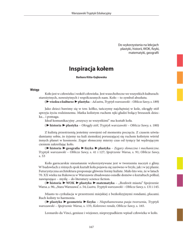 Warszawski Tryptyk Edukacyjny Do wykorzystania na lekcjach plastyki, historii, WOK, fizyki, matematyki, geografii Inspiracja kołem Barbara Kitta-Gajkowska Wstęp Koło jest w człowieku i wokół człowieka. Jest wszechobecne we wszystkich kulturach: starożytnych, nowożytnych i współczesnych nam. Koło – to symbol absolutu. (Vwiedza o kulturze Vplastyka – Ad astra, Tryptyk warszawski – Oblicze Sawy, s. 189) Jako dzieci bawimy się w tzw. kółko, tańczymy najchętniej w kole, okrągły stół sprzyja życiu rodzinnemu. Matka kolistym ruchem ręki gładzi bolący brzuszek dziecka... i pomaga. Ideał komunikacyjny „wszyscy ze wszystkimi” ma kształt koła. (Vhistoria Vplastyka – Okrągły stół, Tryptyk warszawski – Oblicze Sawy, s. 180) Z kulistą przestrzenią jesteśmy oswojeni od momentu poczęcia. Z czasem uświadamiamy sobie, że żyjemy na kuli ziemskiej poruszającej się ruchem kolistym wśród innych planet w kosmosie. Zegar słoneczny mierzy czas od tysięcy lat wędrującym cieniem zakreślając koło. (Vhistoria Vgeografia Vfizyka Vplastyka – Zegary słoneczne i mechaniczne. Tryptyk warszawski – Oblicze Sawy, s. 41 i 127; Spojrzenie Warsa, s. 91; Oblicze Sawy, s. 53 Koło garncarskie nieustannie wykorzystywane jest w tworzeniu naczyń z gliny. W budowlach z różnych epok kształt koła pojawia się zarówno w bryle, jak i w jej planie. Futurystyczna architektura proponuje głównie formy kuliste. Mało kto wie, że w latach 70. XX wieku na Rakowcu w Warszawie zbudowano osiedle domów o kształtach półkul, nawiązujące – myślę – do literatury science fiction. (Vhistoria VWOK Vplastyka Vmatematyka – „Rozkwit miasta” Spojrzenie Warsa ,s. 96; „Stara Warszawa”, s. 54; Lustro, Tryptyk warszawski – Oblicze Sawy, s. 131 i 145. Miasto to cyrkulacja w przestrzeni miejskiej z bezkolizyjnymi rondami, placami. Ruch kolisty to harmonia. (Vplastyka Vgeometria Vfizyka – Niepohamowana pasja tworzenia, Tryptyk warszawski – Spojrzenie Warsa, s. 135; Kolorowe rondo, Oblicze Sawy, s. 165. Leonardo da Vinci, geniusz i wizjoner, nieprzypadkiem wpisał człowieka w koło. 167 Inspiracja kołem y WIDZĘ 1. 2. 3. 4. Kulę słońca – gwiazdy. Zjawiska atmosferyczne – łuk tęczy. Linię horyzontu – kształt ziemi, Bryły o przekroju koła. y ANALIZUJĘ 1. 2. 3. 4. 5. Jak postrzegamy kulę słońca. Koło barw – barwy czyste i złamane, barwy ciepłe i zimne. Cykle w naturze. Zasady perspektywy – linearna i powietrzna. Wybrane architektoniczne przykłady budowli powstałych na bazie koła, od antyku do współczesności. 6. Rozwiązania komunikacyjne z zastosowaniem koła. 7. Perfekcyjny układ koła w komunikacji międzyludzkiej. y SZUKAM 1. Barw dnia i nocy – zdjęcie satelitarne w: Tryptyk warszawski – Spojrzenie Warsa, s. 10 i 70. 2. Zegarów słonecznych – zdjęcie Kolumny Zygmunta w: Tryptyk warszawski – Oblicze Sawy, s. 40; plac Słoneczny, s. 126; klasyczny zegar słoneczny w Łazienkach. 3. Zegarów mechanicznych na budowlach warszawskich – np. zegar na Zamku Królewskim w: Tryptyk warszawski – Spojrzenie Warsa, s. 91; na Pałacu Kultury i Nauki Tryptyk warszawski – Oblicze Sawy, s. 53. 4. Amfiteatru (założeń antycznych budowli) – Tryptyk warszawski – Oblicze Sawy, s. 145; stadionu sportowego – Stadion X-lecia – Oblicze Sawy, s. 55; budynku Sejmu RP – Oblicze Sawy, s. 131. 5. Barbakanu w stylu romańskim Tryptyk warszawski – Spojrzenie Warsa, s. 54; obiektów sakralnych z kopułami, np. kościół projektu Zuga – Tryptyk warszawski – Oblicze Sawy, s. 168; architektury przemysłowej – gazownia na Woli – Tryptyk warszawski – Spojrzenie Warsa, s. 96. 6. Placu Zbawiciela – Tryptyk warszawski – Spojrzenie Warsa, s. 135; kolorowego ronda – Tryptyk warszawski – Oblicze Sawy, s. 165; fontanny w Ogrodzie Saskim – Oblicze Sawy, s. 46. 7. Sposobów porozumiewania się – „okrągły stół” – historia współczesna – Tryptyk warszawski – Oblicze Sawy, s. 180. y TWORZĘ 1. Pejzaż miejski, wybrany fragment otoczenia – z zastosowaniem zasad perspektywy linearnej i powietrznej. 2. Pejzaż miejski w barwach czystych i ciepłych dnia słonecznego. 3. Pejzaż miejski w barwach złamanych dnia pochmurnego. 4. Miasto nocą z uwzględnieniem zjawisk termalnych. 5. Rysunek z zastosowaniem zasad perspektywy i modelunku światłocieniem, próba projektowania obiektów architektonicznych o nietypowej formie. Barbara Kitta-Gajkowska Doradca metodyczny m.st. Warszawy w zakresie plastyki 168