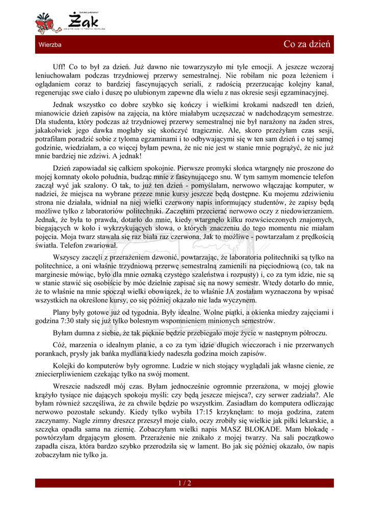 Co za dzień Wierzba Uff! Co to był za dzień. Już dawno nie towarzyszyło mi tyle emocji. A jeszcze wczoraj leniuchowałam podczas trzydniowej przerwy semestralnej. Nie robiłam nic poza leżeniem i oglądaniem coraz to bardziej fascynujących seriali, z radością przerzucając kolejny kanał, regenerując swe ciało i duszę po ulubionym zapewne dla wielu z nas okresie sesji egzaminacyjnej. Jednak wszystko co dobre szybko się kończy i wielkimi krokami nadszedł ten dzień, mianowicie dzień zapisów na zajęcia, na które miałabym uczęszczać w nadchodzącym semestrze. Dla studenta, który podczas aż trzydniowej przerwy semestralnej nie był narażony na żaden stres, jakakolwiek jego dawka mogłaby się skończyć tragicznie. Ale, skoro przeżyłam czas sesji, potrafiłam poradzić sobie z tyloma egzaminami i to odbywającymi się w ten sam dzień i o tej samej godzinie, wiedziałam, a co więcej byłam pewna, że nic nie jest w stanie mnie pogrążyć, że nic już mnie bardziej nie zdziwi. A jednak! Dzień zapowiadał się całkiem spokojnie. Pierwsze promyki słońca wtargnęły nie proszone do mojej komnaty około południa, budząc mnie z fascynującego snu. W tym samym momencie telefon zaczął wyć jak szalony. O tak, to już ten dzień - pomyślałam, nerwowo włączając komputer, w nadziei, że miejsca na wybrane przeze mnie kursy jeszcze będą dostępne. Ku mojemu zdziwieniu strona nie działała, widniał na niej wielki czerwony napis informujący studentów, że zapisy będą możliwe tylko z laboratoriów politechniki. Zaczęłam przecierać nerwowo oczy z niedowierzaniem. Jednak, że była to prawda, dotarło do mnie, kiedy wtargnęło kilku rozwścieczonych znajomych, biegających w koło i wykrzykujących słowa, o których znaczeniu do tego momentu nie miałam pojęcia. Moja twarz stawała się raz biała raz czerwona. Jak to możliwe - powtarzałam z prędkością światła. Telefon zwariował. Wszyscy zaczęli z przerażeniem dzwonić, powtarzając, że laboratoria politechniki są tylko na politechnice, a oni właśnie trzydniową przerwę semestralną zamienili na pięciodniową (co, tak na marginesie mówiąc, było dla mnie oznaką czystego szaleństwa i rozpusty) i, co za tym idzie, nie są w stanie stawić się osobiście by móc dzielnie zapisać się na nowy semestr. Wtedy dotarło do mnie, że to właśnie na mnie spoczął wielki obowiązek, że to właśnie JA zostałam wyznaczona by wpisać wszystkich na określone kursy, co się później okazało nie lada wyczynem. Plany były gotowe już od tygodnia. Były idealne. Wolne piątki, a okienka miedzy zajęciami i godzina 7:30 stały się już tylko bolesnym wspomnieniem minionych semestrów. Byłam dumna z siebie, że tak pięknie będzie przebiegało moje życie w następnym półroczu. Cóż, marzenia o idealnym planie, a co za tym idzie długich wieczorach i nie przerwanych porankach, prysły jak bańka mydlana kiedy nadeszła godzina moich zapisów. Kolejki do komputerów były ogromne. Ludzie w nich stojący wyglądali jak własne cienie, ze zniecierpliwieniem czekając tylko na swój moment. Wreszcie nadszedł mój czas. Byłam jednocześnie ogromnie przerażona, w mojej głowie krążyło tysiące nie dających spokoju myśli: czy będą jeszcze miejsca?, czy serwer zadziała?. Ale byłam również szczęśliwa, że za chwile będzie po wszystkim. Zasiadłam do komputera odliczając nerwowo pozostałe sekundy. Kiedy tylko wybiła 17:15 krzyknęłam: to moja godzina, zatem zaczynamy. Nagle zimny dreszcz przeszył moje ciało, oczy zrobiły się wielkie jak piłki lekarskie, a szczęka opadła sama na ziemię. Zobaczyłam wielki napis MASZ BLOKADE. Mam blokadę powtórzyłam drgającym głosem. Przerażenie nie znikało z mojej twarzy. Na sali początkowo zapadła cisza, która bardzo szybko przerodziła się w lament. Bo jak się później okazało, ów napis zobaczyłam nie tylko ja. 1/2 Co za dzień Wierzba W tej samej chwili grupa studentów niczym stado pędzących i rozwścieczonych wilków zaczęła wybiegać z sali i podążać w stronę dziekanatu. Byliśmy jak jedna drużyna, która znała swój cel i gotowa była stawić czoła przeciwnościom losu. Byliśmy zdeterminowani i gotowi do walki. Na szczęście wszystko zakończyło się szczęśliwie. Oczekiwanie w następnej kolejce, kilka podań o dziekankę, sprawiło że cel został osiągnięty. Konta zostały odblokowane! A my w pokojowych nastrojach powróciliśmy na nasze stanowiska by ponownie starać się o jakiekolwiek miejsce na wymarzonych przez nas kursach. 2/2