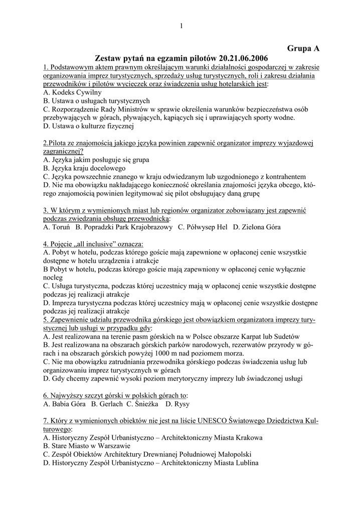 1 Grupa A Zestaw pytań na egzamin pilotów 20.21.06.2006 1. Podstawowym aktem prawnym określającym warunki działalności gospodarczej w zakresie organizowania imprez turystycznych, sprzedaŜy usług turystycznych, roli i zakresu działania przewodników i pilotów wycieczek oraz świadczenia usług hotelarskich jest: A. Kodeks Cywilny B. Ustawa o usługach turystycznych C. Rozporządzenie Rady Ministrów w sprawie określenia warunków bezpieczeństwa osób przebywających w górach, pływających, kąpiących się i uprawiających sporty wodne. D. Ustawa o kulturze fizycznej 2.Pilota ze znajomością jakiego języka powinien zapewnić organizator imprezy wyjazdowej zagranicznej? A. Języka jakim posługuje się grupa B. Języka kraju docelowego C. Języka powszechnie znanego w kraju odwiedzanym lub uzgodnionego z kontrahentem D. Nie ma obowiązku nakładającego konieczność określania znajomości języka obcego, którego znajomością powinien legitymować się pilot obsługujący daną grupę 3. W którym z wymienionych miast lub regionów organizator zobowiązany jest zapewnić podczas zwiedzania obsługę przewodnicką: A. Toruń B. Popradzki Park Krajobrazowy C. Półwysep Hel D. Zielona Góra 4. Pojęcie „all inclusive” oznacza: A. Pobyt w hotelu, podczas którego goście mają zapewnione w opłaconej cenie wszystkie dostępne w hotelu urządzenia i atrakcje B Pobyt w hotelu, podczas którego goście mają zapewniony w opłaconej cenie wyłącznie nocleg C. Usługa turystyczna, podczas której uczestnicy mają w opłaconej cenie wszystkie dostępne podczas jej realizacji atrakcje D. Impreza turystyczna podczas której uczestnicy mają w opłaconej cenie wszystkie dostępne podczas jej realizacji atrakcje 5. Zapewnienie udziału przewodnika górskiego jest obowiązkiem organizatora imprezy turystycznej lub usługi w przypadku gdy: A. Jest realizowana na terenie pasm górskich na w Polsce obszarze Karpat lub Sudetów B. Jest realizowana na obszarach górskich parków narodowych, rezerwatów przyrody w górach i na obszarach górskich powyŜej 1000 m nad poziomem morza. C. Nie ma obowiązku zatrudniania przewodnika górskiego podczas świadczenia usług lub organizowaniu imprez turystycznych w górach D. Gdy chcemy zapewnić wysoki poziom merytoryczny imprezy lub świadczonej usługi 6. NajwyŜszy szczyt górski w polskich górach to: A. Babia Góra B. Gerlach C. ŚnieŜka D. Rysy 7. Który z wymienionych obiektów nie jest na liście UNESCO Światowego Dziedzictwa Kulturowego: A. Historyczny Zespół Urbanistyczno – Architektoniczny Miasta Krakowa B. Stare Miasto w Warszawie C. Zespół Obiektów Architektury Drewnianej Południowej Małopolski D. Historyczny Zespół Urbanistyczno – Architektoniczny Miasta Lublina 2 8. Która z podstawowych form kolumn w architekturze nie naleŜy do przykładów architektury greckiej? A. Porządek dorycki B. Porządek toskański C. Porządek joński D. Porządek koryncki 9. Który z elementów architektonicznych jest najbardziej charakterystyczny dla architektury gotyckiej? A. Fronton B. Sklepienie kolebkowe C. Luneta D. Przypora 10. Jedną z najwspanialszych budowli renesansu na ziemiach polskich jest: A. Kaplica Zygmuntowska na Wawelu B. Kościół Najświętszej Marii Panny w Gdańsku C. Zamek w Łańcucie D. Zamek w Nowym Wiśniczu 11. Stolicę Polski przeniesiono z Krakowa do Warszawy: A. Pod koniec XV wieku B. Na początku XV wieku C. W XVI wieku D. W XVII wieku 12. Organizacją, której głównym zadaniem jest promocja Polski poza granicami kraju jest: A. Polska Organizacja Turystyczna B. Polska Izba Turystyki C. Polska Agencja Rozwoju Turystyki D. Polskie Towarzystwo Turystyczno – Krajoznawcze 13. Na terenie województwa małopolskiego nie znajduje się w całości lub w części grupa górska: A. Gorce B. Beskid Sądecki C. Karkonosze D. Beskid Niski 14. Największą powierzchnię pośród polskich jezior ma: A. Morskie Oko B. Mamry C. Wigry D. Śniardwy 15. Ślady zlodowacenia na ziemiach polskich pozostały widoczne w : A. Tatrach B. Jurze Krakowsko – Częstochowskiej C. Roztoczu D. Górach Świętokrzyskich 16. W której z miejscowości nie ma przejścia granicznego: A. Kraków B. Gubin C. Wisła D Medyka 17. Polska Izba Turystyki to : A. Jednostka samorządu gospodarczego przedsiębiorców działająca w dziedzinie turystyki B. Stowarzyszenie zrzeszające stowarzyszenia prowadzące działalność statutową w dziedzinie turystyki C. Jednostka administracji rządowej zajmująca się promocją turystyki krajowej D. Zrzeszenie jednostek samorządowych urzędów marszałkowskich wszystkich województw w Polsce zajmujące się promocja turystyki wyjazdowej 18. Organizator turystyki ma obowiązek ubezpieczyć uczestników imprezy zagranicznej od: A. Odpowiedzialności cywilnej B. Następstw nieszczęśliwych wypadków i kosztów leczenia C. KradzieŜy bagaŜu D. Następstw nieszczęśliwych wypadków. 3 19. Pilot wycieczek to osoba która: A. Oprowadza grupy turystów po obszarach atrakcyjnych krajobrazowo lub terenach miejskich B. Zatrudniony przez organizatora turystyki towarzyszy uczestnikom imprezy turystycznej, sprawuje nad nimi opiekę i pilnuje właściwej realizacji zamówionych i opłaconych usług C Tworzy propozycje ofert turystycznych i zajmuje się ich zamawianiem, organizacją i sprzedaŜą D. Pracownik biura turystycznego zajmujący się sprzedaŜą biletów na tanie linie lotnicze i połączenia autokarowe 20. Skrót PTTK to : A. Polskie Towarzystwo Turystyczno Krajoznawcze B. Państwowe Targi Turystyki i Kultury C. Poznańskie Targi Turystyczno - Kulturalne D. śadna z tych nazw nie jest prawidłowym rozszyfrowaniem skrótu. 21. Jaka podana nazwa pasma górskiego w Karpatach w części naleŜącej do Polski jest nieprawidłowa? A. Beskid Śląski B. Bieszczady C. Beskid śywiecki D. Beskid Gorczański 22. Charakterystyczny dla Podhala styl architektury został rozwinięty i rozpropagowany przez? A. Stanisł