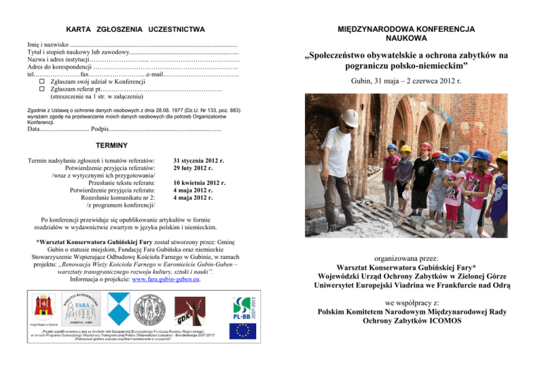 KARTA ZGŁOSZENIA UCZESTNICTWA Imię i nazwisko ........................................................................................................ Tytuł i stopień naukowy lub zawodowy.................................................................... Nazwa i adres instytucji……………………..... …………………………………… Adres do korespondencji ………………………………………………………….. tel.…………………fax………………………e-mail.…………………………….. Zgłaszam swój udział w Konferencji Zgłaszam referat pt………………………………………………… (streszczenie na 1 str. w załączeniu) MIĘDZYNARODOWA KONFERENCJA NAUKOWA „Społeczeństwo obywatelskie a ochrona zabytków na pograniczu polsko-niemieckim” Gubin, 31 maja – 2 czerwca 2012 r. Zgodnie z Ustawą o ochronie danych osobowych z dnia 28.08. 1977 (Dz.U. Nr 133, poz. 883) wyrażam zgodę na przetwarzanie moich danych osobowych dla potrzeb Organizatorów Konferencji. Data............................... Podpis...................................................................... TERMINY Termin nadsyłania zgłoszeń i tematów referatów: Potwierdzenie przyjęcia referatów: /wraz z wytycznymi ich przygotowania/ Przesłanie tekstu referatu: Potwierdzenie przyjęcia referatu: Rozesłanie komunikatu nr 2: /z programem konferencji/ 31 stycznia 2012 r. 29 luty 2012 r. 10 kwietnia 2012 r. 4 maja 2012 r. 4 maja 2012 r. Po konferencji przewiduje się opublikowanie artykułów w formie rozdziałów w wydawnictwie zwartym w języku polskim i niemieckim. *Warsztat Konserwatora Gubińskiej Fary został utworzony przez: Gminę Gubin o statusie miejskim, Fundację Fara Gubińska oraz niemieckie Stowarzyszenie Wspierające Odbudowę Kościoła Farnego w Gubinie, w ramach projektu: „Renowacja Wieży Kościoła Farnego w Euromieście Gubin-Guben – warsztaty transgranicznego rozwoju kultury, sztuki i nauki”. Informacja o projekcie: www.fara.gubin-guben.eu. organizowana przez: Warsztat Konserwatora Gubińskiej Fary* Wojewódzki Urząd Ochrony Zabytków w Zielonej Górze Uniwersytet Europejski Viadrina we Frankfurcie nad Odrą we współpracy z: Polskim Komitetem Narodowym Międzynarodowej Rady Ochrony Zabytków ICOMOS CELE KONFERENCJI Przystąpienie Polski w 2004 roku do Unii Europejskiej stworzyło możliwości uczestnictwa jej obywateli w wielu inicjatywach m.in. o charakterze gospodarczym i kulturalnym. Stworzone zostały warunki do stopniowego wyrównywania różnic w poziomie życia społeczno-gospodarczego pomiędzy różnymi regionami Europy. Odnosi się to w znacznym stopniu do terenów na pograniczu Polski i Niemiec. W ciągu ostatnich lat nastąpiło zbliżenie gospodarcze i kulturowe pogranicznych regionów, podjęto szereg wspólnych inicjatyw, m.in. w oparciu o dotacje unijne. Ta pozytywna transformacja może wyzwolić – i niekiedy już wyzwala – szereg inicjatyw nie związanych bezpośrednio z gospodarką, a dotykających szeroko rozumianej ochrony wspólnego dziedzictwa kulturowego, którego jednym z elementów jest ochrona zabytków. Działania podejmowane w ostatnich latach wokół ruin fary w Gubinie ukazują możliwości jakie daje transgraniczna współpraca w oparciu o zaangażowanie społeczeństwa obywatelskiego. W trakcie konferencji zostaną postawione pytania: czy istnieją programy, plany, zamierzenia możliwe do realizacji równocześnie po obu stronach granicy, umożliwiające ochronę wspólnego dziedzictwa kulturowego? Czy istnieją organizacje, instytucje, urzędy mogące realizować takie projekty? Jakie są uwarunkowania prawne, techniczne, społeczne wykorzystania obiektów zabytkowych do współczesnych celów? Czy podobnie jak utworzenie polskoniemieckiego Warsztatu Konserwatora przy odbudowie Gubińskiej Fary możliwa jest szersza międzynarodowa współpraca w podejmowaniu wspólnych inicjatyw? Organizatorzy proponują osobom i instytucjom zainteresowanym powyższą problematyką wzięcie udziału w konferencji umożliwiając szeroką dyskusję nad jej głównymi tematami. GŁÓWNE TEMATY KONFERENCJI Zabytki na pograniczu polsko-niemieckim – szanse, realia, zagrożenia, Inwestowanie w zabytki w aspekcie prawnym, ekonomicznym i społecznym, Inicjatywy obywatelskie a ochrona zabytków na pograniczu polskoniemieckim, Konserwacja i adaptacja zabytków do nowych funkcji, Turystyka kulturalna na pograniczu polsko-niemieckim. KOMITET NAUKOWY prof. dr hab. inż. Bogusław Szmygin prof. dr hab. Ewa Łużyniecka prof. dr hab. Wojciech Eckert prof. dr hab. arch. Piotr Molski prof. dr. Paul Zalewski dr Barbara Bielinis-Kopeć ORGANIZATORZY Gmina Gubin o statusie miejskim, Fundacja Fara Gubińska, Stowarzyszenie Wspierające Odbudowę Kościoła Farnego w Gubinie, Wojewódzki Urząd Ochrony Zabytków w Zielonej Górze, Uniwersytet Europejski Viadrina we Frankfurcie nad Odrą OSOBY KONTAKTOWE Anna Dziadek (PL) +48(0)68/455 82 03 Günter Quiel (DE) +49(0)35/615 598 52 Warunki uczestnictwa Kartę zgłoszenia uczestnictwa należy przesłać na adres Komitetu Organizacyjnego: Warsztat Konserwatora Gubińskiej Fary, ul. Westerplatte 14 pokój 102, 66-620 Gubin. e-mail: [email protected], Tel: 0048/68 455 82 03, Fax: 0048/455 81 69 Udział w konferencji i imprezach towarzyszących jest bezpłatny. Organizatorzy nie pokrywają kosztów dojazdu i noclegów. Osoby zainteresowane udziałem w konferencji prosimy o wypełnienie i wysłanie załączonej na odwrocie KARTY ZGŁOSZENIA UCZESTNICTWA Konferencja odbywać się będzie w sali widowiskowej Gubińskiego Domu Kultury przy ul. Westerplatte 14 w Gubinie. Wystąpienia przewidziane są w języku polskim i niemieckim. Organizatorzy zapewniają symultaniczne tłumaczenie referatów oraz udział w imprezach towarzyszących. Noclegi należy rezerwować indywidualnie: 1. Hotel NYSA ul. Dąbrowskiego 23 Gubin, tel. 068/3595005, www.hotel-nysa.eu 2. Dom Turysty PTTK ul.