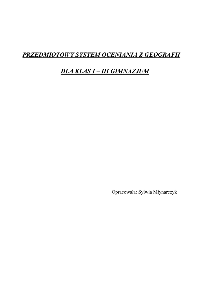 PRZEDMIOTOWY SYSTEM OCENIANIA Z GEOGRAFII DLA KLAS I – III GIMNAZJUM Opracowała: Sylwia Młynarczyk ZASADY DOTYCZĄCE OCENIANIA 1.W przedmiocie oceny z geografii mieszczą się: umiejętność korzystania z różnych źródeł informacji (planu, mapy, fotografii, rysunków, wykresów, danych statystycznych, tekstów źródłowych, technologii informacyjno – komunikacyjnej, umiejętność identyfikowania związków i zależności oraz wyjaśniania zjawisk i procesów posługując się podstawowym słownictwem geograficznym, stosowanie wiedzy i umiejętności geograficznych w praktyce, rozwijanie w sobie ciekawości świata. 2. Na ocenę semestralną i roczną z geografii składają się oceny cząstkowe, które uczeń uzyskuje za różne formy aktywności. 3.Pomiar osiągnięć ucznia odbywa się za pomocą następujących narzędzi: wypowiedzi ustne sprawdziany testy diagnostyczne kartkówki z trzech ostatnich lekcji (mogą być niezapowiedziane) prace domowe zadania i ćwiczenia wykonywane przez uczniów podczas lekcji zeszyt ćwiczeń zeszyt przedmiotowy prace w zespole inne ( konkursy geograficzne, olimpiady) TRYB OCENIANIA POSZCZEGÓLNYCH FORM PRACY UCZNIA 1. Sprawdziany pisemne obejmujące dział materiału muszą być zapowiedziane z minimum tygodniowym wyprzedzeniem. Nauczyciel informuje uczniów o formie i zakresie pracy. Uczniowie są zobowiązani do uczestnictwa w sprawdzianie w określonym dniu. W przypadku nieobecności uczeń ma obowiązek uzupełnić daną formę pracy pisemnej w ciągu dwóch tygodni od dnia powrotu do szkoły i po uzgodnieniu terminu z nauczycielem. W przeciwnym razie uczeń otrzymuje ocenę niedostateczną. 2. Nauczyciel oddaje poprawione prace w terminie nie późniejszym niż dwa tygodnie od dnia przeprowadzenia sprawdzianu. 3. Uczeń otrzymuje poprawioną pracę do wglądu podczas lekcji, dokonuje analizy popełnionych błędów, a następnie oddaje pracę nauczycielowi. 4. Nauczyciel dołącza pracę do dokumentacji uczniowskiej i udostępnia rodzicom podczas wywiadówki i konsultacji. 5. Uczeń ma prawo poprawiać oceny niedostateczne z danego sprawdzianu i kartkówki. Poprawa jest dobrowolna - uczeń sam zgłasza chęć poprawy w ciągu dwóch tygodni od daty oddania prac, a nauczyciel wyznacza termin. 6. Każdą ocenę z poprawy, także kolejną niedostateczną, wpisuje się do dziennika lekcyjnego obok pierwszej noty. 7. Poprawa może odbywać się w formie pisemnej lub ustnej. Ustnie może także poprawiać ten uczeń, który zgodnie z orzeczeniem PPP, wymaga indywidualnego podejścia lub pomocy nauczyciela. Ocenianie sprawdzianów i kartkówek opiera się na następującym podziale: 0 - 30% - niedostateczny 31% - 50% - dopuszczający 51% - 74%- dostateczny 75% - 89%- dobry 90% - 99%- bardzo dobry 100% - celujący Odpowiedzi ustne – na każdą odpowiedź składa się zawartość merytoryczna, poprawne użycie słownictwa geograficznego, znajomość zagadnienia, samodzielność wypowiedzi, kultura języka, precyzja, jasność, oryginalność ujęcia tematu. Dodatkowe pytania naprowadzające wpływają na obniżenie oceny. Kartkówki (odpowiedzi pisemne) mogą obejmować materiał z trzech ostatnich tematów. Nie muszą być zapowiadane. Sprawdziany pisemne obejmujące dział materiału muszą być zapowiedziane z minimum tygodniowym wyprzedzeniem. Nauczyciel informuje uczniów o formie i zakresie pracy. Uczniowie są zobowiązani do uczestnictwa w sprawdzianie w określonym dniu. W przypadku nieobecności uczeń ma obowiązek uzupełnić daną formę pracy pisemnej w ciągu dwóch tygodni od dnia powrotu do szkoły i po uzgodnieniu terminu z nauczycielem. W przeciwnym razie uczeń otrzymuje ocenę niedostateczną. Zaangażowanie w problematykę lekcji oceniane jest za pomocą plusów (trzy plusy to ocena bardzo dobra) lub oceną bardzo dobrą, co uzależnione jest od skali trudności problemu. Brak zaangażowania w problematykę lekcji oceniany jest za pomocą oceny niedostatecznej. Prace w zespole ( ocenie podlegają umiejętności: planowanie i organizacja pracy grupowej, efektywne współdziałanie, wywiązanie się z powierzonych ról, rozwiązywanie problemów w sposób twórczy) Uczeń ma obowiązek systematycznie, rzetelnie i starannie prowadzić zeszyt przedmiotowy oraz zeszyt ćwiczeń, które są dokumentami pracy ucznia. W przypadku choroby czy nieobecności w szkole uczeń uzupełnia notatki i zadania domowe w ciągu kilku dni od powrotu do szkoły, w terminie uzgodnionym z nauczycielem. Zeszyt przedmiotowy będzie kontrolowany jeden raz w półroczu. Przy ocenie zeszytu będą brane pod uwagę następujące elementy: - pismo (estetyka zapisu) - systematyczność notowania - sporządzanie notatek, odrabianie zadań Zeszyt ćwiczeń również będzie podlegał kontroli i ocenie. Uczeń po każdej lekcji ma obowiązek wykonać wszystkie zadania w zeszycie ćwiczeń, z tematu realizowanego na zajęciach. Za niewykonanie pracy uczeń otrzymuje ocenę niedostateczną. Uczeń ma obowiązek uzupełniać brakujące zadania. Uczeń jest zobowiązany do posiadania zeszytu przedmiotowego, zeszytu ćwiczeń oraz podręcznika na każdej lekcji. Ich brak oznacza nieprzygotowanie do lekcji i skutkuje wpisem „-” lub oceną niedostateczną. Ocenianie dla uczniów z dostosowaniem wymagań Nauczyciel dostosowuje wymagania edukacyjne do indywidualnych potrzeb rozwojowych i edukacyjnych oraz możliwości psychofizycznych ucznia na podstawie orzeczenia lub opinii. Symptomy zaburzeń i formy, metody, sposoby dostosowania wymagań u uczniów z dysleksją w zakresie geografii: 1) symptomy trudności: trudności z zapamiętywaniem nazw geograficznych trudności z opanowaniem systematyki (hierarchiczny układ informacji) zła orientacja w czasie (chronologia, daty) trudności z czytaniem i rysowaniem map geograficznych trudności z orientacją w czasie i w przestrzeni (wskazywanie kierunków na mapie i w przestrzeni, obliczanie stref czasowych, poło
