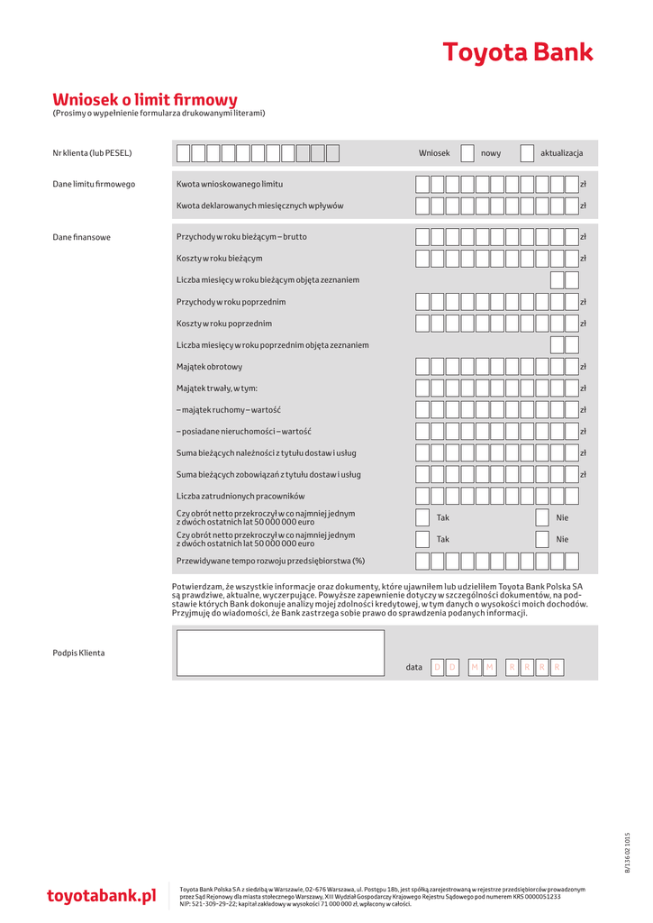 Wniosek o limit firmowy (Prosimy o wypełnienie formularza drukowanymi literami) Nr klienta (lub PESEL) Dane limitu firmowego Dane finansowe Wniosek nowy aktualizacja Kwota wnioskowanego limitu zł Kwota deklarowanych miesięcznych wpływów zł Przychody w roku bieżącym – brutto zł Koszty w roku bieżącym zł Liczba miesięcy w roku bieżącym objęta zeznaniem Przychody w roku poprzednim zł Koszty w roku poprzednim zł Liczba miesięcy w roku poprzednim objęta zeznaniem Majątek obrotowy zł Majątek trwały, w tym: zł – majątek ruchomy – wartość zł – posiadane nieruchomości – wartość zł Suma bieżących należności z tytułu dostaw i usług zł Suma bieżących zobowiązań z tytułu dostaw i usług zł Liczba zatrudnionych pracowników Czy obrót netto przekroczył w co najmniej jednym z dwóch ostatnich lat 50 000 000 euro Tak Nie Czy obrót netto przekroczył w co najmniej jednym z dwóch ostatnich lat 50 000 000 euro Tak Nie Przewidywane tempo rozwoju przedsiębiorstwa (%) Potwierdzam, że wszystkie informacje oraz dokumenty, które ujawniłem lub udzieliłem Toyota Bank Polska SA są prawdziwe, aktualne, wyczerpujące. Powyższe zapewnienie dotyczy w szczególności dokumentów, na podstawie których Bank dokonuje analizy mojej zdolności kredytowej, w tym danych o wysokości moich dochodów. Przyjmuję do wiadomości, że Bank zastrzega sobie prawo do sprawdzenia podanych informacji. Podpis Klienta D D M M R R R R B/136 02 1015 data