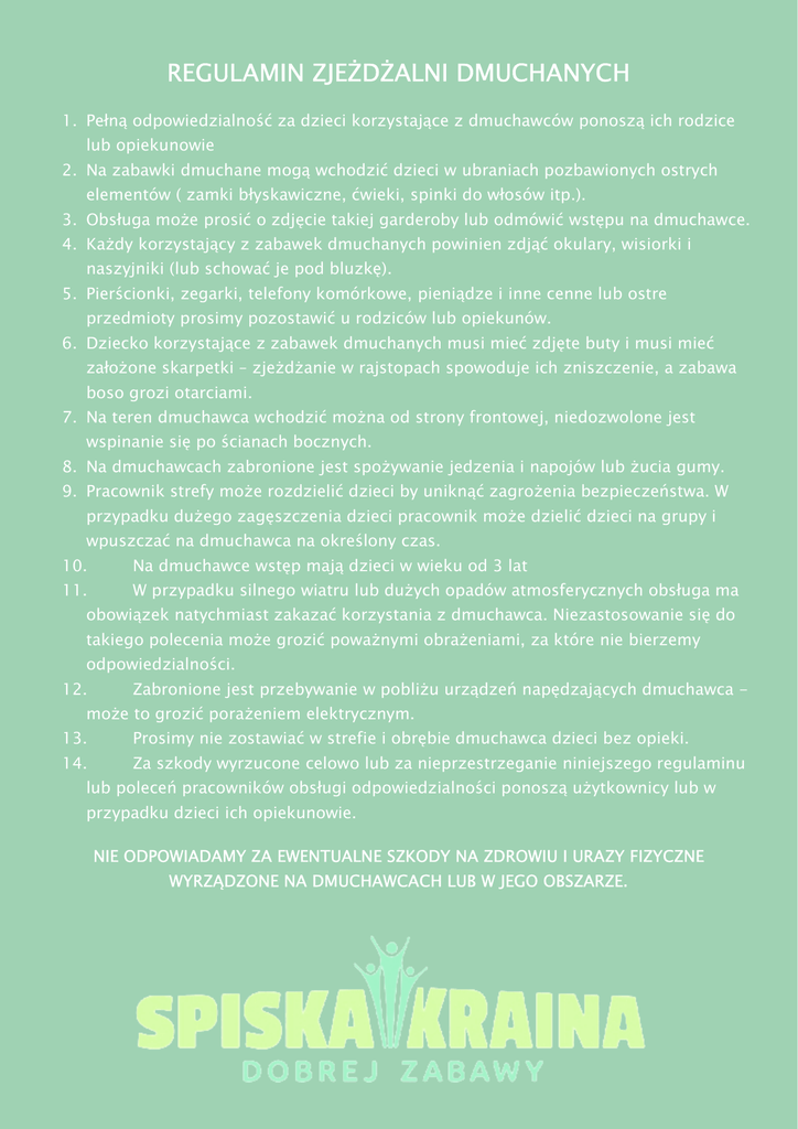 REGULAMIN ZJEŻDŻALNI DMUCHANYCH 1. Pełną odpowiedzialność za dzieci korzystające z dmuchawców ponoszą ich rodzice lub opiekunowie 2. Na zabawki dmuchane mogą wchodzić dzieci w ubraniach pozbawionych ostrych elementów ( zamki błyskawiczne, ćwieki, spinki do włosów itp.). 3. Obsługa może prosić o zdjęcie takiej garderoby lub odmówić wstępu na dmuchawce. 4. Każdy korzystający z zabawek dmuchanych powinien zdjąć okulary, wisiorki i naszyjniki (lub schować je pod bluzkę). 5. Pierścionki, zegarki, telefony komórkowe, pieniądze i inne cenne lub ostre przedmioty prosimy pozostawić u rodziców lub opiekunów. 6. Dziecko korzystające z zabawek dmuchanych musi mieć zdjęte buty i musi mieć założone skarpetki – zjeżdżanie w rajstopach spowoduje ich zniszczenie, a zabawa boso grozi otarciami. 7. Na teren dmuchawca wchodzić można od strony frontowej, niedozwolone jest wspinanie się po ścianach bocznych. 8. Na dmuchawcach zabronione jest spożywanie jedzenia i napojów lub żucia gumy. 9. Pracownik strefy może rozdzielić dzieci by uniknąć zagrożenia bezpieczeństwa. W przypadku dużego zagęszczenia dzieci pracownik może dzielić dzieci na grupy i wpuszczać na dmuchawca na określony czas. 10. 11. Na dmuchawce wstęp mają dzieci w wieku od 3 lat W przypadku silnego wiatru lub dużych opadów atmosferycznych obsługa ma obowiązek natychmiast zakazać korzystania z dmuchawca. Niezastosowanie się do takiego polecenia może grozić poważnymi obrażeniami, za które nie bierzemy odpowiedzialności. 12. Zabronione jest przebywanie w pobliżu urządzeń napędzających dmuchawca - 14. Za szkody wyrzucone celowo lub za nieprzestrzeganie niniejszego regulaminu może to grozić porażeniem elektrycznym. 13. Prosimy nie zostawiać w strefie i obrębie dmuchawca dzieci bez opieki. lub poleceń pracowników obsługi odpowiedzialności ponoszą użytkownicy lub w przypadku dzieci ich opiekunowie. NIE ODPOWIADAMY ZA EWENTUALNE SZKODY NA ZDROWIU I URAZY FIZYCZNE WYRZĄDZONE NA DMUCHAWCACH LUB W JEGO OBSZARZE.
