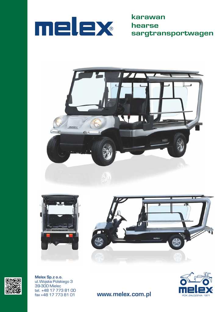 karawan hearse sargtransportwagen Melex Sp.z o.o. ul.Wojska Polskiego 3 39-300 Mielec tel. +48 17 773 81 00 fax +48 17 773 81 01 www.melex.com.pl karawan hearse sargtransportwagen Model/Model/Modell 469 Długość/Length/Länge [mm] Szerokość/Width/Breite [mm] 4015 1250 (1280 - z hakami na wieńce /with hooks for wreaths /mit Haken für Blumenkranz) Wysokość/Height/Höhe [mm] 1760 Rozstaw osi/Wheel base/Achsabstand [mm] 2500 Promień skrętu zewnętrzny/Turn radius/Wenderadius [m] 4,7 Maksymalna prędkość/Max. speed/Max. Geschwindigkeit [km/h] 25 Silnik/Motor/Motor 5.0 kW AC + Przełożenie mostu/Gear ratio/Getriebe 20:1 + Zdolność pokonywania wzniesień/Climbing capacity/Steigfähigkeit [%][%] Koła/Wheels/Räder 15 20,5 x 8.0 -10 Akumulatory/Batteries/Batterien 240 Ah/C20 (8x6V) + Regulator prędkości/Speed controller/Geschwindigkeitsregler AC 350A + Ilość osób/Number of seats/Anzahl von Sitzen 2 Dopuszczalna masa całkowita/Max. technically permissible mass/Zulässige Gesamtmasse [kg] 1150 Zintegrowany zespół wskaźników/Integrated system of indicators/Integrierte Anzeiger + Oświetlenie/Full lightening/Völlige Beleuchtung + Zawieszenie przednie dwu-wahaczowe sprężynowe /Double A-frame with springs/Doppelt Schwinghebel mit Federn Hamulce bębnowe przód-tył/Drum brakes front and rear/Bremstrommel front und hinten Rama galwanizowana/Galvanized frame/Galvanisierte Rahmen Kolor pojazdu/Color of vehicle/Farbe vom Wagen Kolor siedzeń/Color of seats/Farbe von Sitze + + + do wyboru z palety RAL /to be chosen from RAL palette /zu auswählen aus RAL Palette do wyboru /to be chosen/zu auswählen* Prostownik/Battery charger/Ladegerät HF 48V + Lusterka/Mirrors/Spiegel + Daszek/Top/Schutzdach + Szyba z wycieraczką/Glass windshield with wiper-washer/Glasscheibe mit Wisch-und Waschanlage + Gniazdo 12V na pulpicie/12V socket in dashboard/12V Steckdose im Panel + Schowek w kabinie (pod pulpitem) /Closed gloves compartment/Geschlossene Ablagefach 3-punktowe pasy bezpieczeństwa/3-point seat belts/3-Punkte Sicherheitsgürte + + Opcje/Options/Options: Centralny system uzupełniania wody/Central water refilling system in batteries/Wasserfühlsystem für Batterien 48V o Akumulatory/Batteries/Batterien 180 Ah/C1 (litowo-jonowe/Li-Ion/Lithium-Ionen) o Akumulatory/Batteries/Batterien 260 Ah/C20 (8x6V) o Koła/Wheels/Räder 195/55R10 o Kołpaki/Wheels covers/Radkappen o Instalacja pod radio/Installation for radio/Installation für Radio o Prostownik pokładowy/Battery charger on-board/Ladegerät integriert o * - szare, beżowe, czerwone, niebieskie, ciemne lub jasne zielone, pomarańczowe / grey, beige, red, blue, dark or light green, orange/ grau, beige, rott, blau, dunkel oder hell grün, orange + - standard/standard/Standard o - opcja/option/Option 11/2016