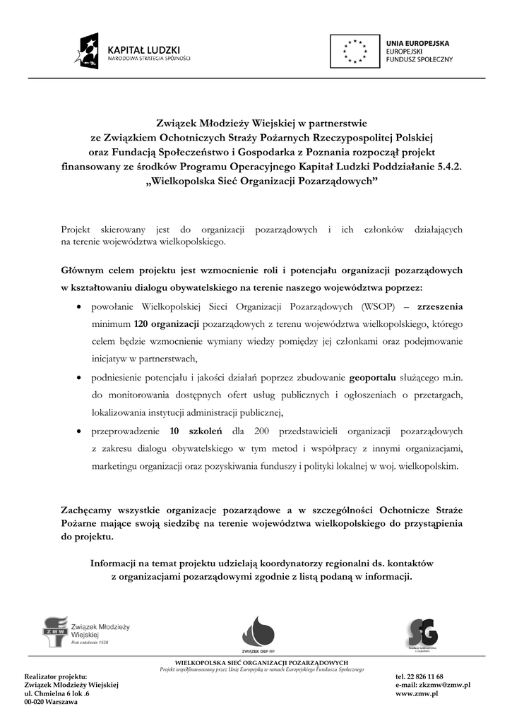 Związek Młodzieży Wiejskiej w partnerstwie ze Związkiem Ochotniczych Straży Pożarnych Rzeczypospolitej Polskiej oraz Fundacją Społeczeństwo i Gospodarka z Poznania rozpoczął projekt finansowany ze środków Programu Operacyjnego Kapitał Ludzki Poddziałanie 5.4.2. „Wielkopolska Sieć Organizacji Pozarządowych” Projekt skierowany jest do organizacji na terenie województwa wielkopolskiego. pozarządowych i ich członków działających Głównym celem projektu jest wzmocnienie roli i potencjału organizacji pozarządowych w kształtowaniu dialogu obywatelskiego na terenie naszego województwa poprzez: powołanie Wielkopolskiej Sieci Organizacji Pozarządowych (WSOP) – zrzeszenia minimum 120 organizacji pozarządowych z terenu województwa wielkopolskiego, którego celem będzie wzmocnienie wymiany wiedzy pomiędzy jej członkami oraz podejmowanie inicjatyw w partnerstwach, podniesienie potencjału i jakości działań poprzez zbudowanie geoportalu służącego m.in. do monitorowania dostępnych ofert usług publicznych i ogłoszeniach o przetargach, lokalizowania instytucji administracji publicznej, przeprowadzenie 10 szkoleń dla 200 przedstawicieli organizacji pozarządowych z zakresu dialogu obywatelskiego w tym metod i współpracy z innymi organizacjami, marketingu organizacji oraz pozyskiwania funduszy i polityki lokalnej w woj. wielkopolskim. Zachęcamy wszystkie organizacje pozarządowe a w szczególności Ochotnicze Straże Pożarne mające swoją siedzibę na terenie województwa wielkopolskiego do przystąpienia do projektu. Informacji na temat projektu udzielają koordynatorzy regionalni ds. kontaktów z organizacjami pozarządowymi zgodnie z listą podaną w informacji. WIELKOPOLSKA SIEĆ ORGANIZACJI POZARZĄDOWYCH Projekt współfinansowany przez Unię Europejską w ramach Europejskiego Funduszu Społecznego Realizator projektu: Związek Młodzieży Wiejskiej ul. Chmielna 6 lok .6 00-020 Warszawa tel. 22 826 11 68 e-mail: [email protected] www.zmw.pl Powiaty Wielkopolski przypisane koordynatorom regionalnym ds. kontaktów z NGO z ramienia ZMW i OW ZOSP RP do podejmowania działań w ramach projektu na rzecz utworzenia WSOP Powiaty ZMW: Koordynator Anna Jarońska – tel. 792 750 634, e-mail: [email protected] powiaty: gnieźnieński, kolski, koniński, miasto Konin, słupecki, turecki, wrzesiński. Koordynator Maciej Mróz – tel. 697 583 603, [email protected] powiaty: jarociński, kaliski, miasto Kalisz, kępiński, krotoszyński, ostrowski, ostrzeszowski, pleszewski. Koordynator Patryk Kąkolewski – tel. 695 444 944, e-mail: [email protected] powiaty: grodziski, międzychodzki, nowotomyski, wolsztyński. Powiaty OW ZOSP RP: Koordynator Paweł Kantowicz – tel. 791 896 170, [email protected] powiaty: chodzieski, czarnkowsko-trzcianecki, pilski, wągrowiecki, złotowski. Koordynator Marek Cybichowski – tel. 609 790 103, [email protected] powiaty: obornicki, miasto Poznań, poznański, szamotulski. Koordynator Michał Nowak – tel. 609 676 791, [email protected] powiaty: gostyński, kościański, leszczyński, miasto Leszno, rawicki, średzki, śremski. Informacji w Oddziale Wojewódzkim Związku Ochotniczych Straży Pożarnych Rzeczypospolitej Polskiej Województwa Wielkopolskiego im. generała Stanisława Taczaka udziela druh Tomasz Poręba, kom 663 732 009, e-mail: [email protected] WIELKOPOLSKA SIEĆ ORGANIZACJI POZARZĄDOWYCH Projekt współfinansowany przez Unię Europejską w ramach Europejskiego Funduszu Społecznego Realizator projektu: Związek Młodzieży Wiejskiej ul. Chmielna 6 lok .6 00-020 Warszawa tel. 22 826 11 68 e-mail: [email protected] www.zmw.pl