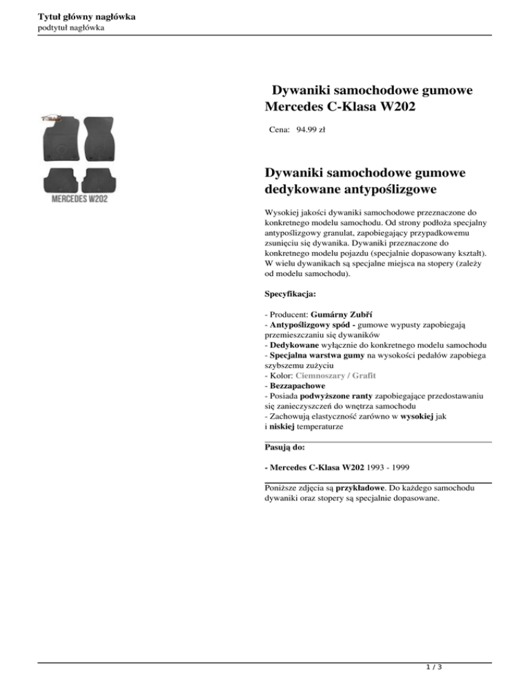 Tytuł główny nagłówka podtytuł nagłówka Dywaniki samochodowe gumowe Mercedes C-Klasa W202 Cena: 94.99 zł Dywaniki samochodowe gumowe dedykowane antypoślizgowe Wysokiej jakości dywaniki samochodowe przeznaczone do konkretnego modelu samochodu. Od strony podłoża specjalny antypoślizgowy granulat, zapobiegający przypadkowemu zsunięciu się dywanika. Dywaniki przeznaczone do konkretnego modelu pojazdu (specjalnie dopasowany kształt). W wielu dywanikach są specjalne miejsca na stopery (zależy od modelu samochodu). Specyfikacja: - Producent: Gumárny Zubří - Antypoślizgowy spód - gumowe wypusty zapobiegają przemieszczaniu się dywaników - Dedykowane wyłącznie do konkretnego modelu samochodu - Specjalna warstwa gumy na wysokości pedałów zapobiega szybszemu zużyciu - Kolor: Ciemnoszary / Grafit - Bezzapachowe - Posiada podwyższone ranty zapobiegające przedostawaniu się zanieczyszczeń do wnętrza samochodu - Zachowują elastyczność zarówno w wysokiej jak i niskiej temperaturze Pasują do: - Mercedes C-Klasa W202 1993 - 1999 Poniższe zdjęcia są przykładowe. Do każdego samochodu dywaniki oraz stopery są specjalnie dopasowane. 1/3 Tytuł główny nagłówka podtytuł nagłówka Zdjęcie producenta dywaników do tego modelu 2/3 Tytuł główny nagłówka podtytuł nagłówka samochodu: 3/3 Powered by TCPDF (www.tcpdf.org)